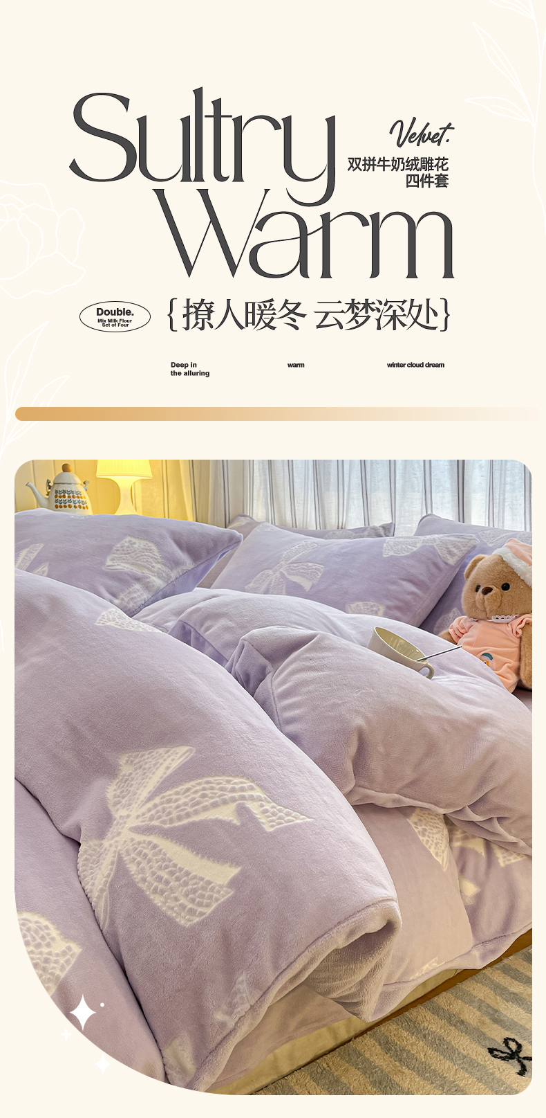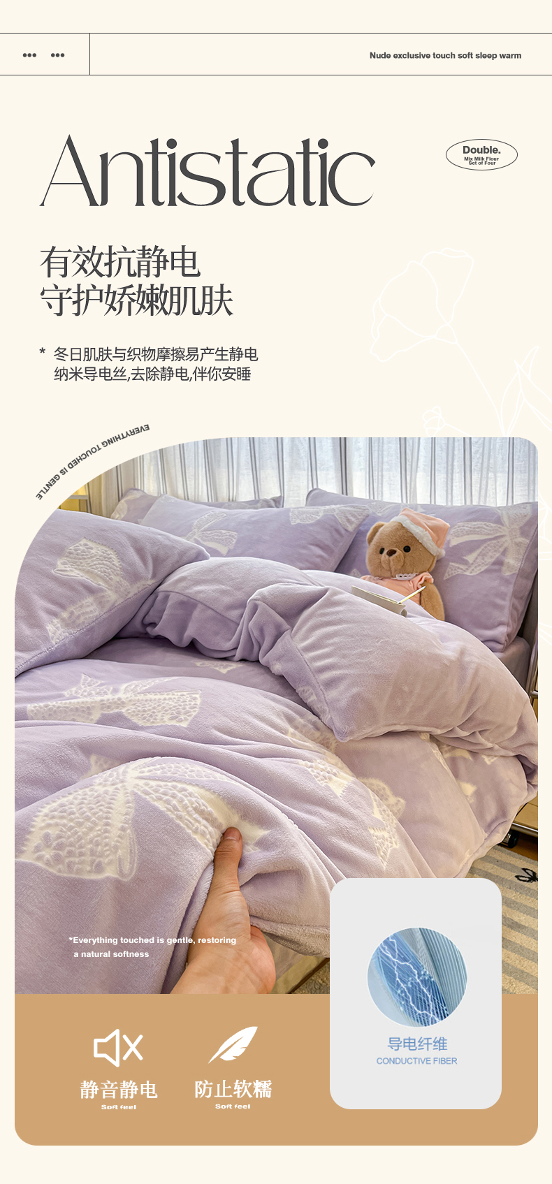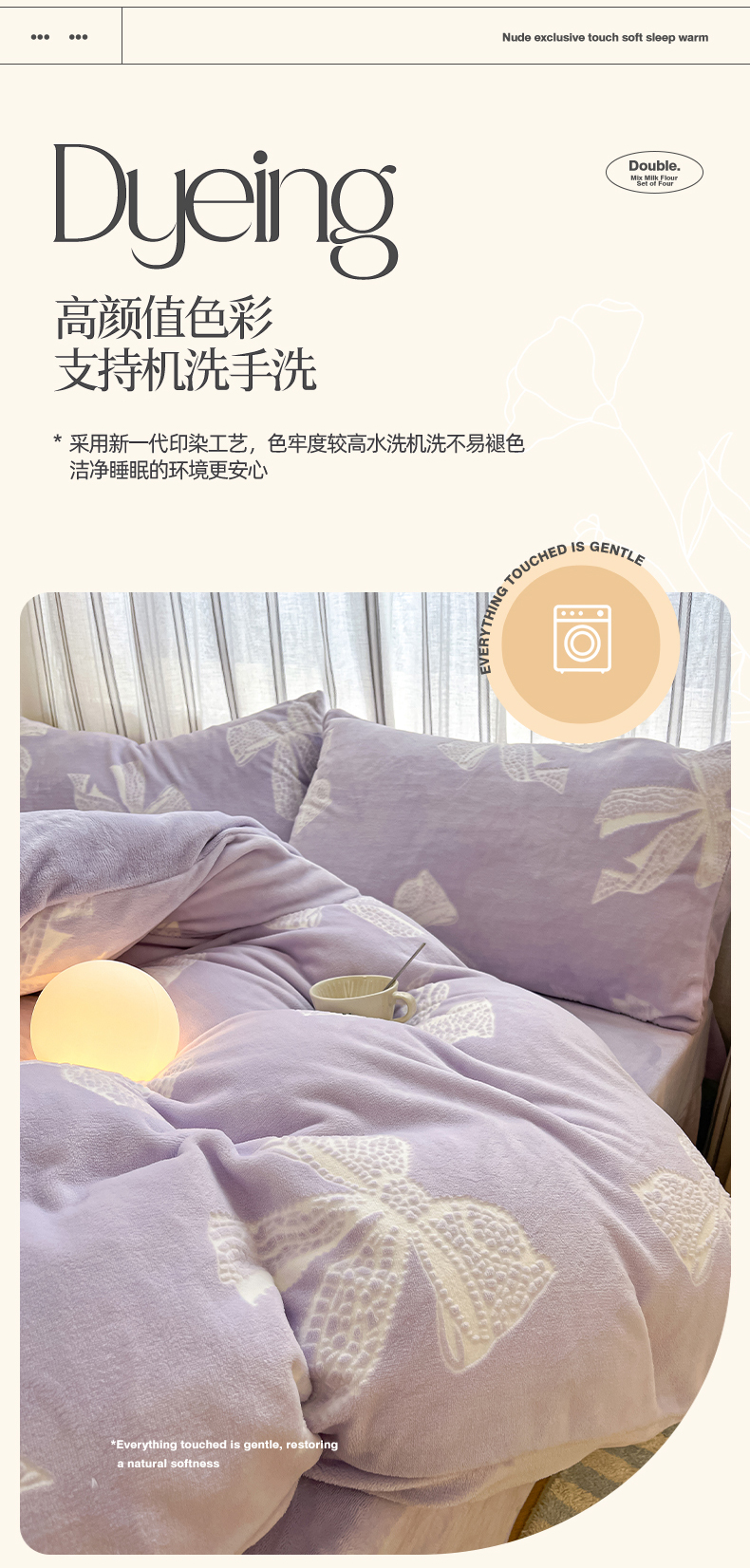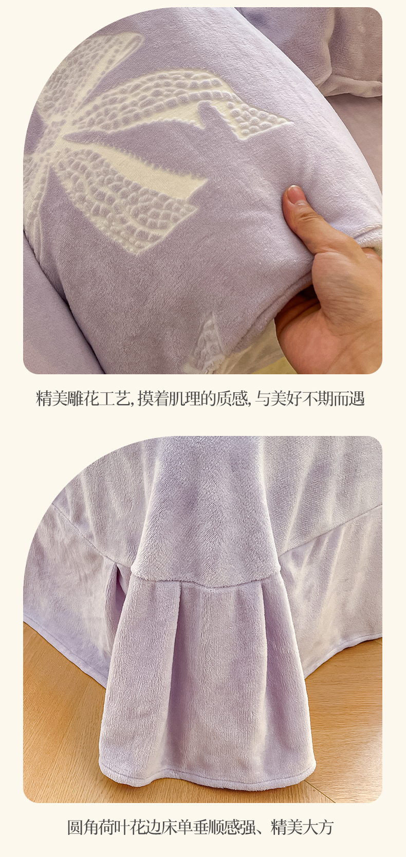 绘萱家居 2025新款高克重雕花雕印纯色牛奶绒四件套双拼法莱绒珊瑚绒 蝴蝶公主