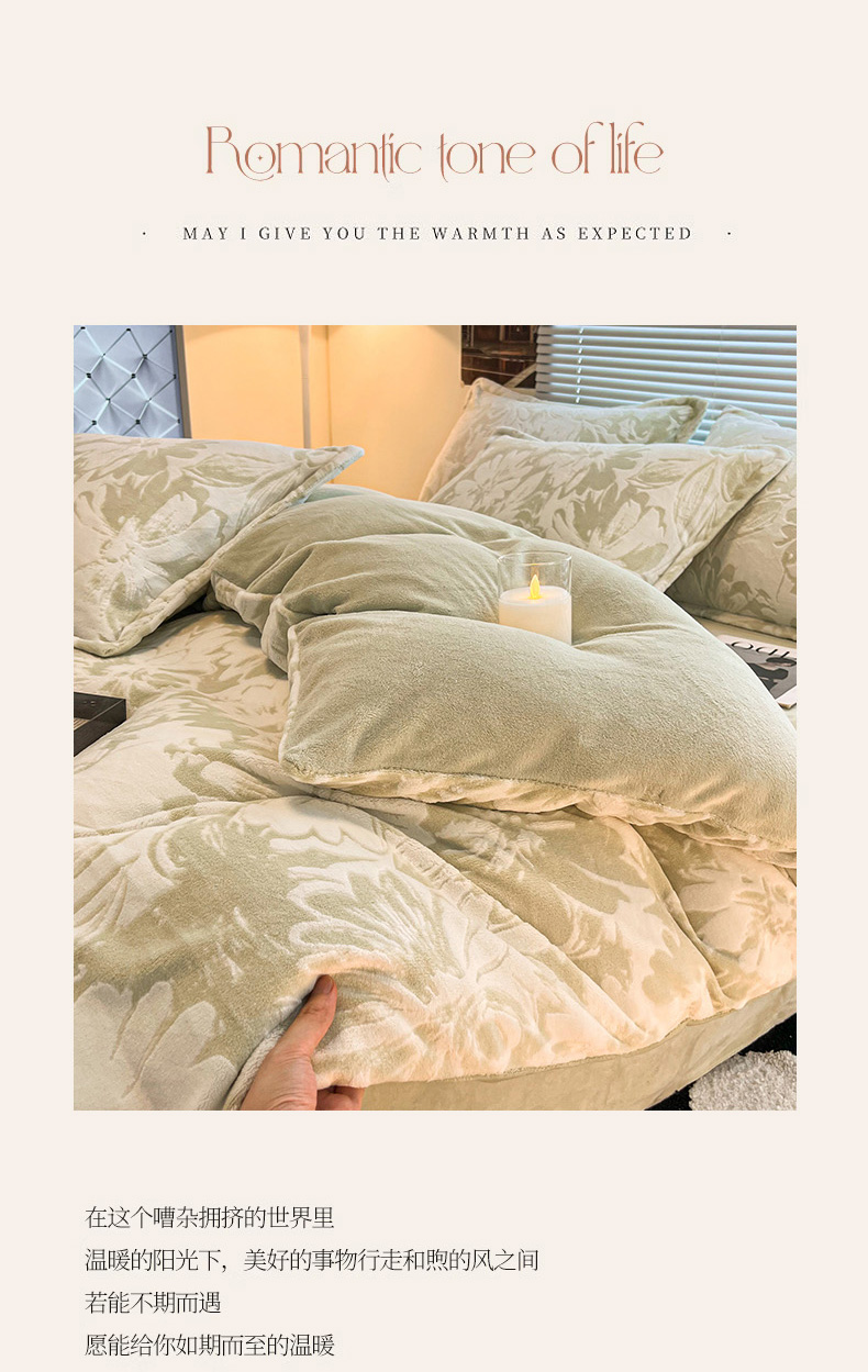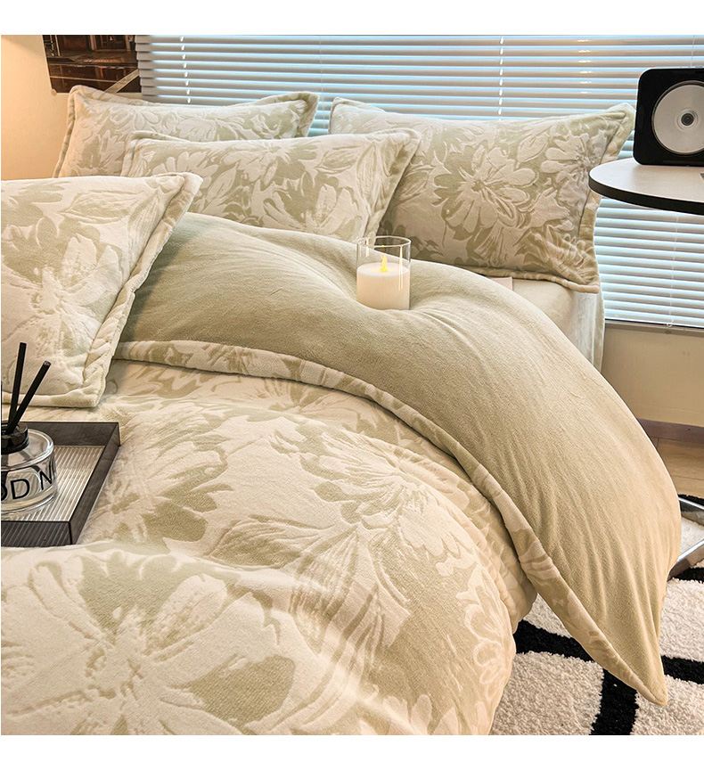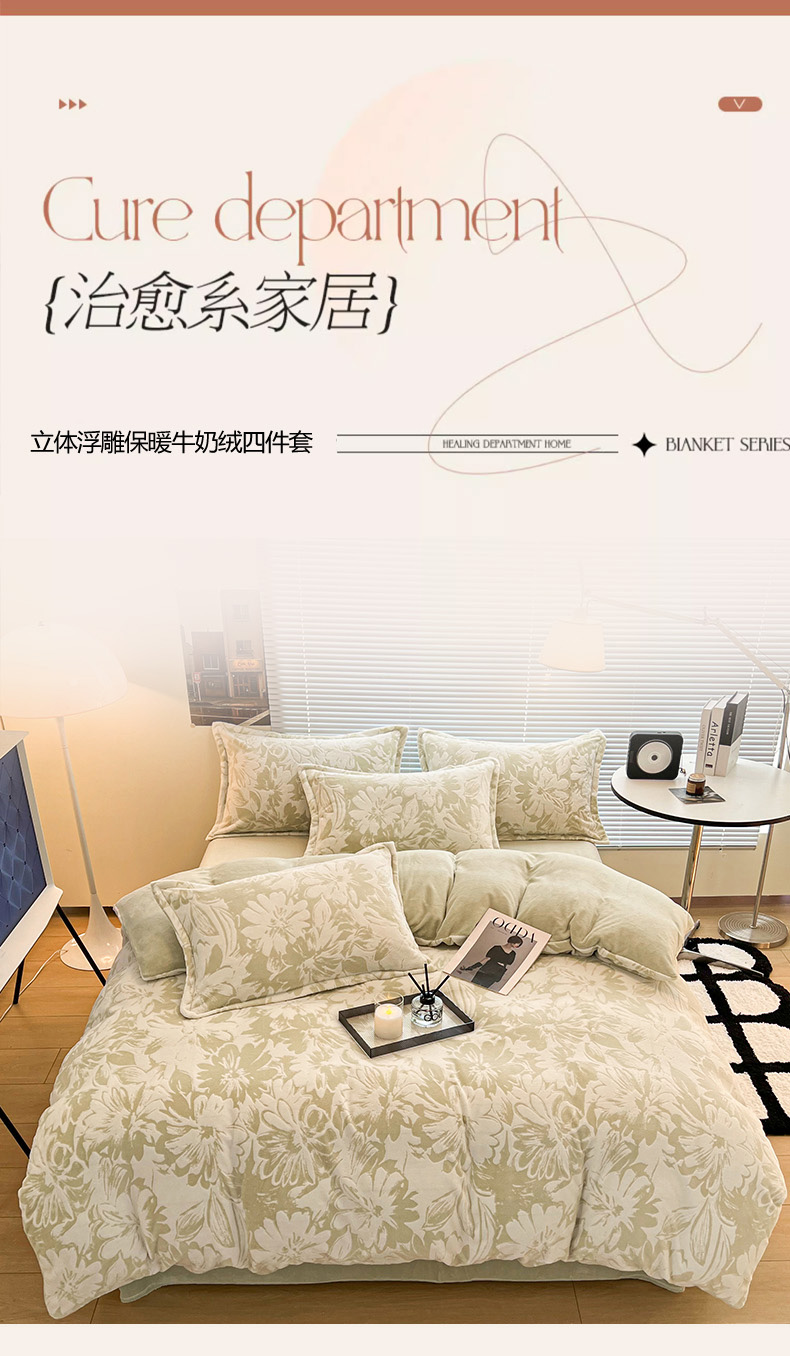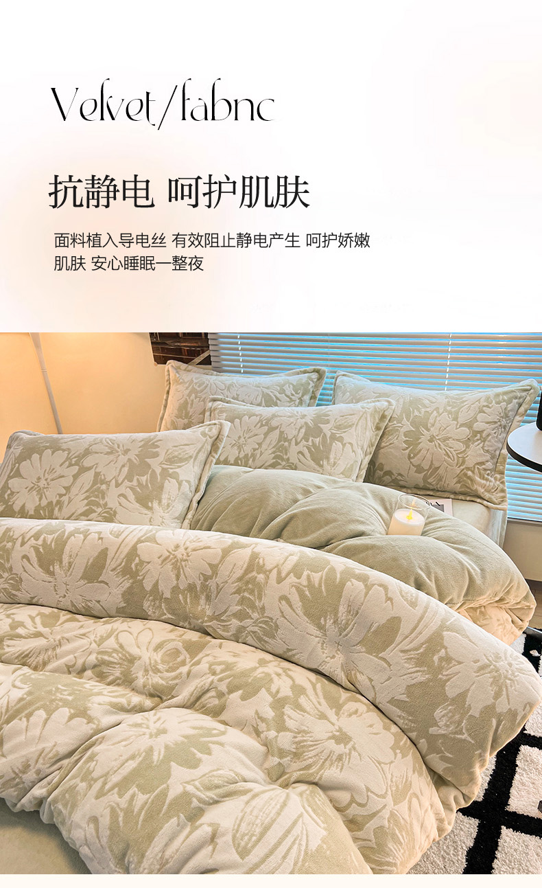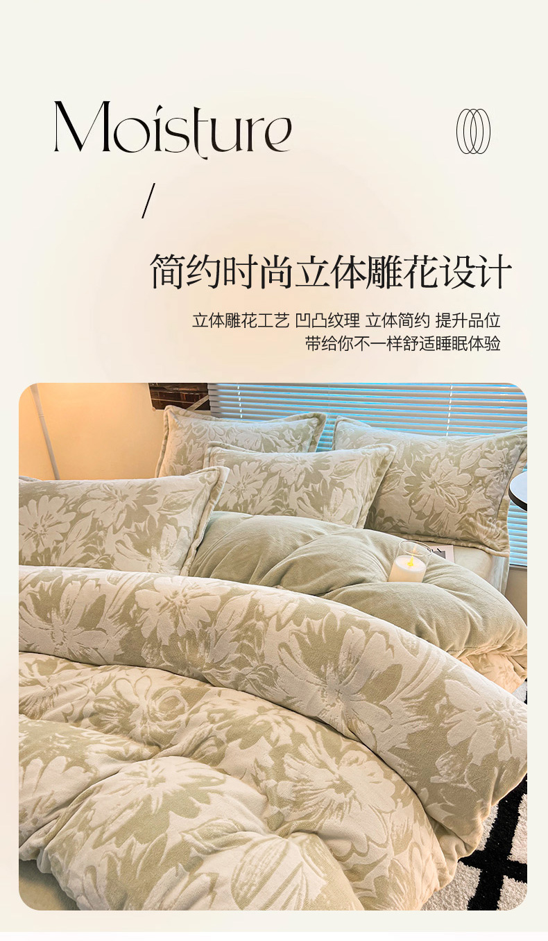 当前位置: 91家纺网 > 商品网购 > 床品套件 > 四件套 > 牛奶绒四件套 > 2024新款A类高克重立体浮雕牛奶绒加厚保暖系列-四件套 时光向暖绿