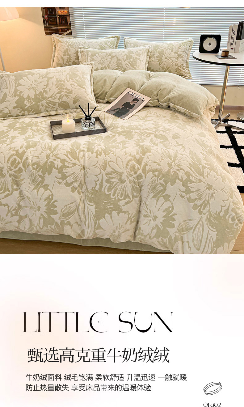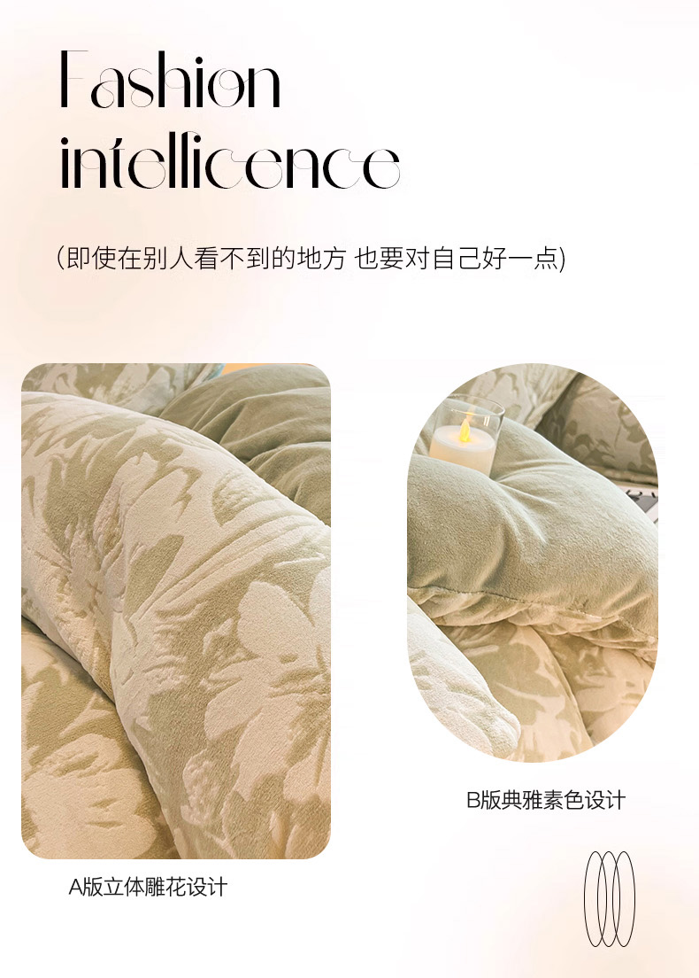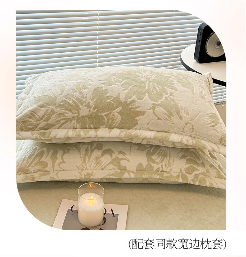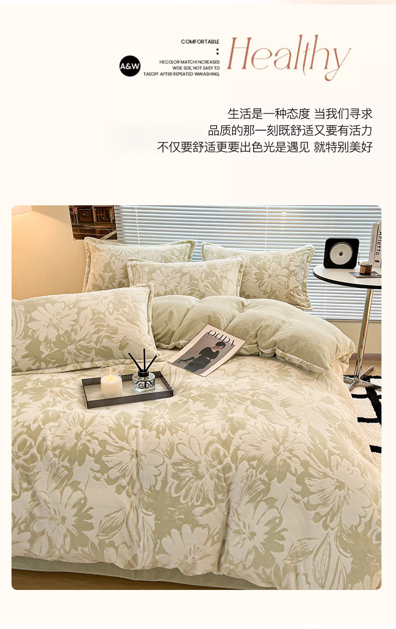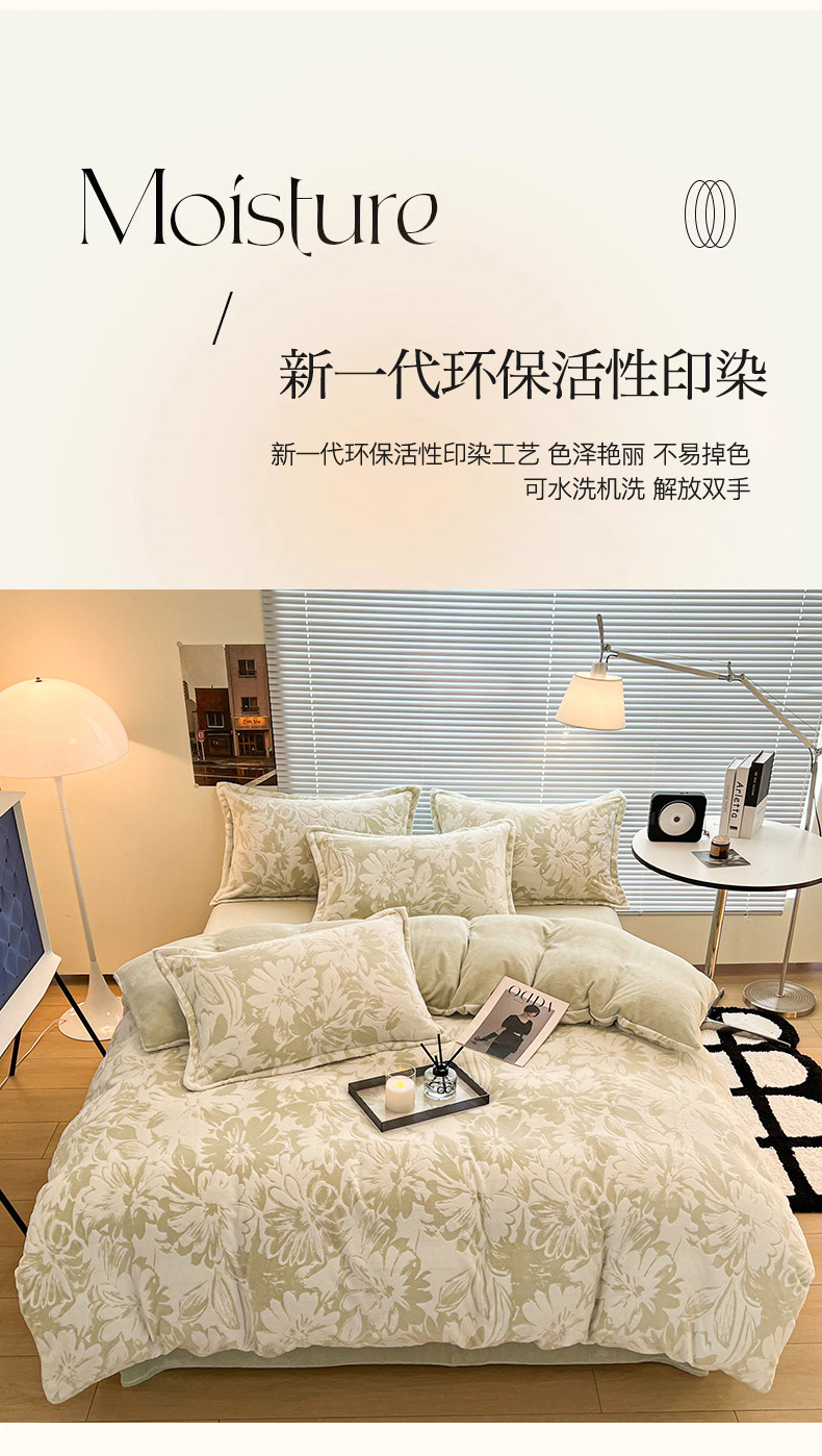 当前位置: 91家纺网 > 商品网购 > 床品套件 > 四件套 > 牛奶绒四件套 > 2024新款A类高克重立体浮雕牛奶绒加厚保暖系列-四件套 时光向暖绿