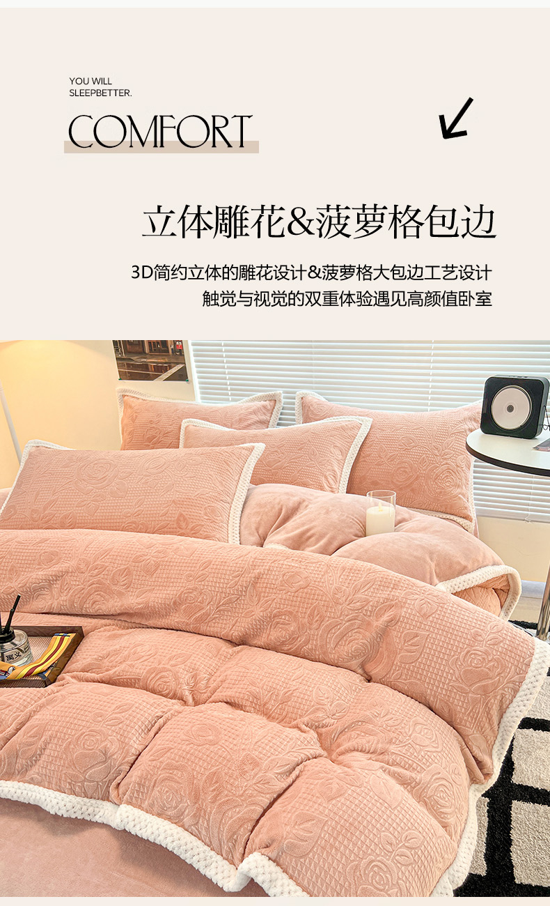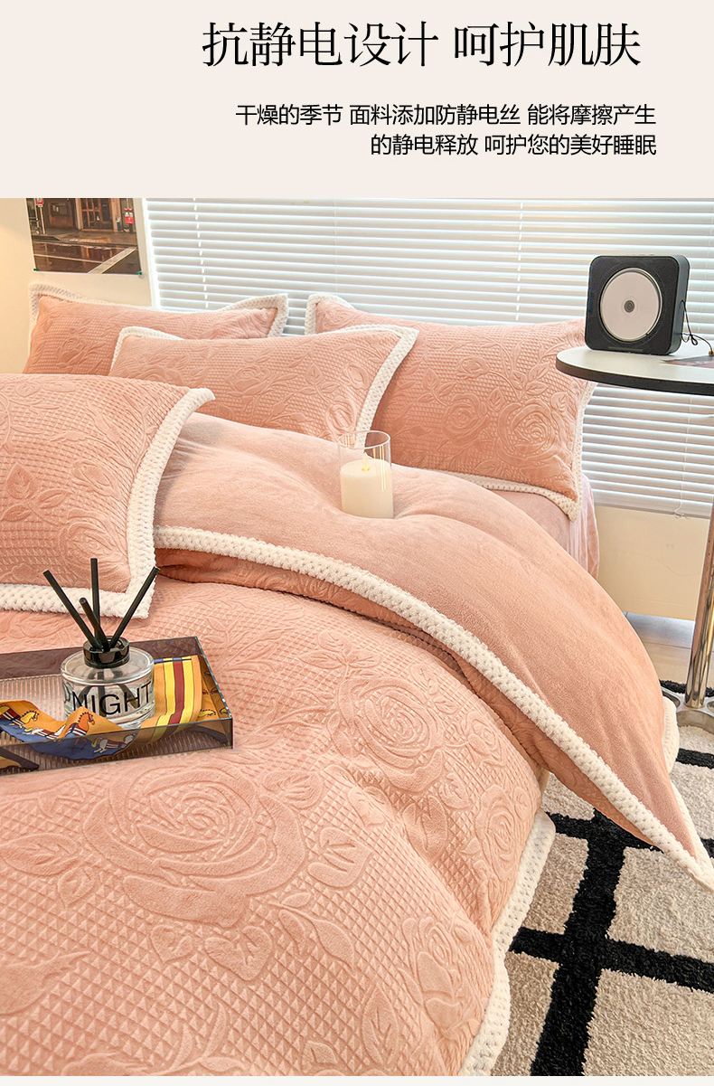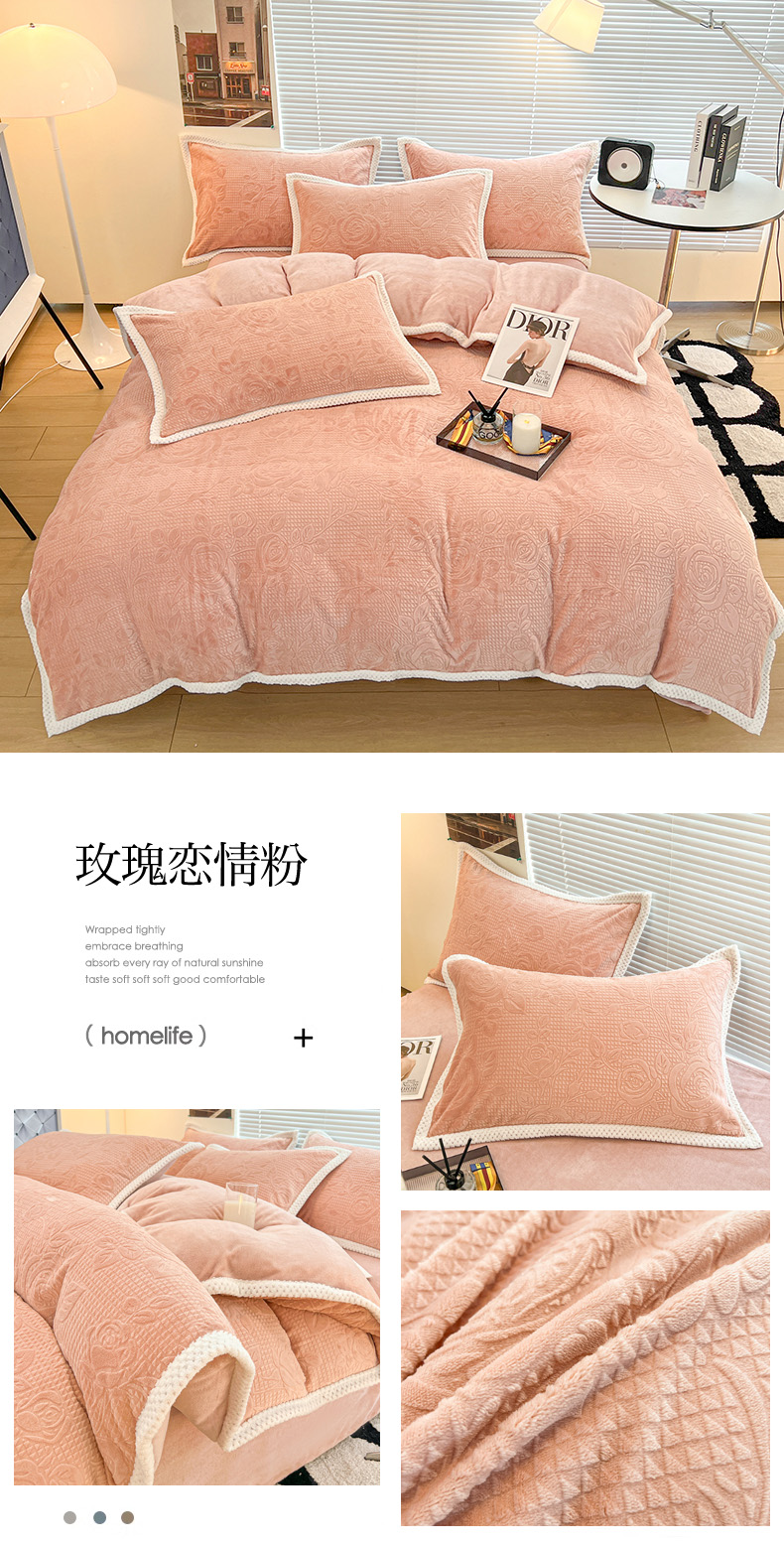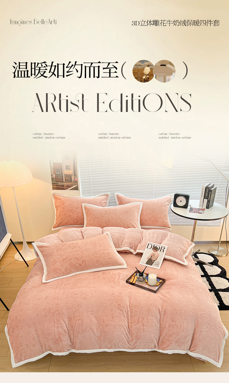 当前位置: 91家纺网 > 商品网购 > 床品套件 > 四件套 > 牛奶绒四件套 > 2024新款A类高克重3D立体雕花牛奶绒保暖系列套件单品-四件套 玫瑰恋情粉