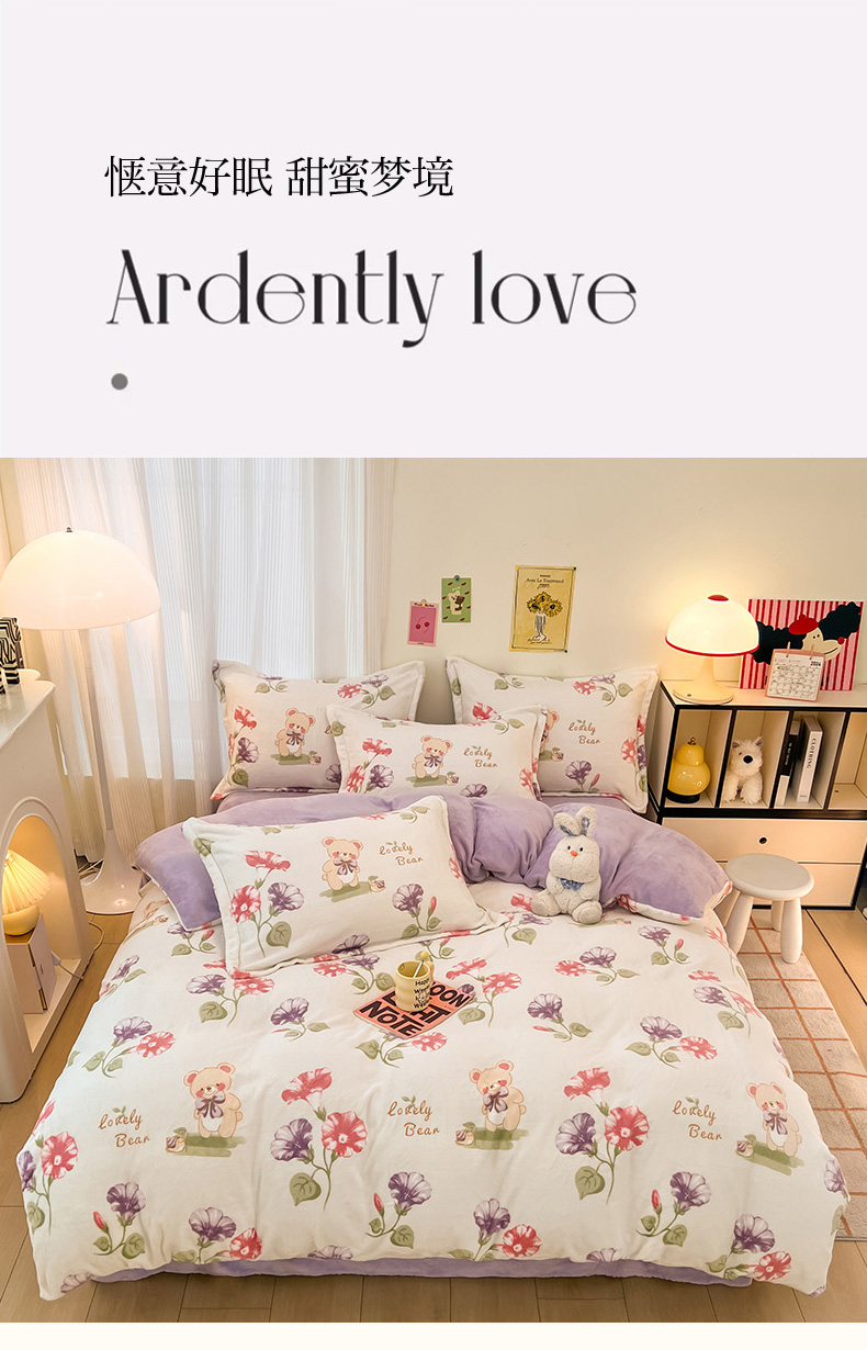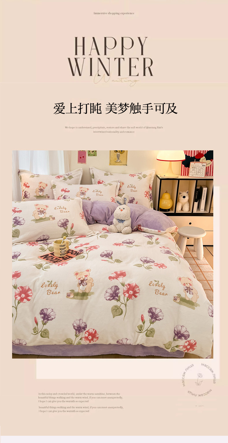 (总)倾慕家纺 2025新款卡通毛巾绣加厚保暖牛奶绒四件套,爱心女孩,咖啡小狗,猫咪熊兔,迷你小车,圣诞树熊,音乐企鹅