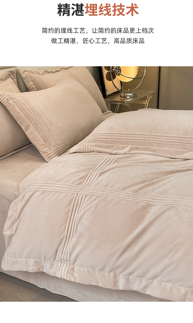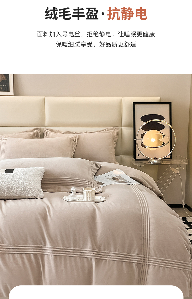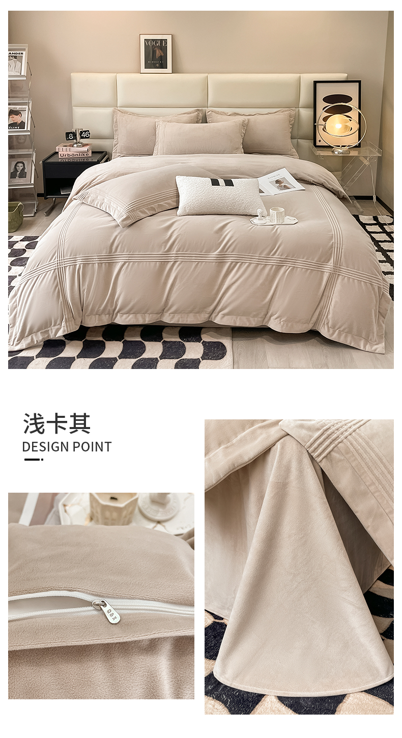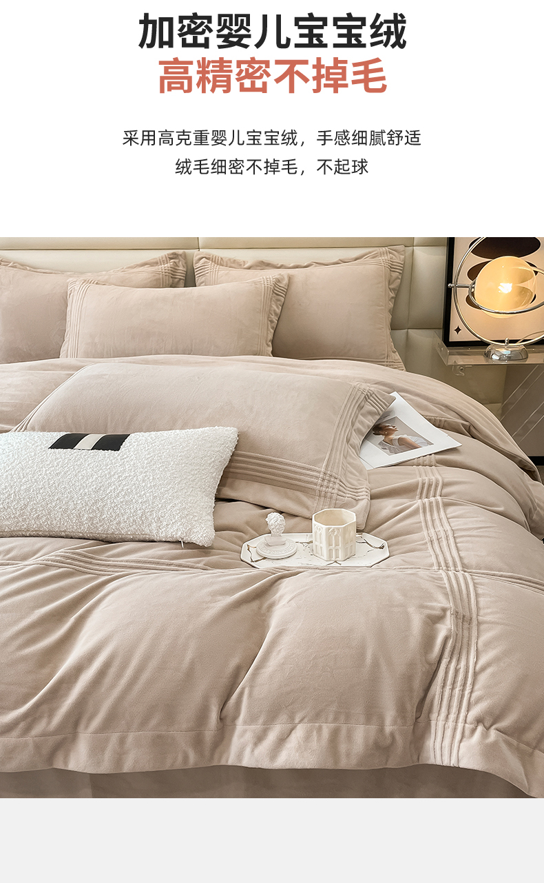 商品名称:禧澜庭 2024新款A类婴儿绒宝宝绒牛奶绒埋线款埋绳款纯色刺绣四件套 浅卡其