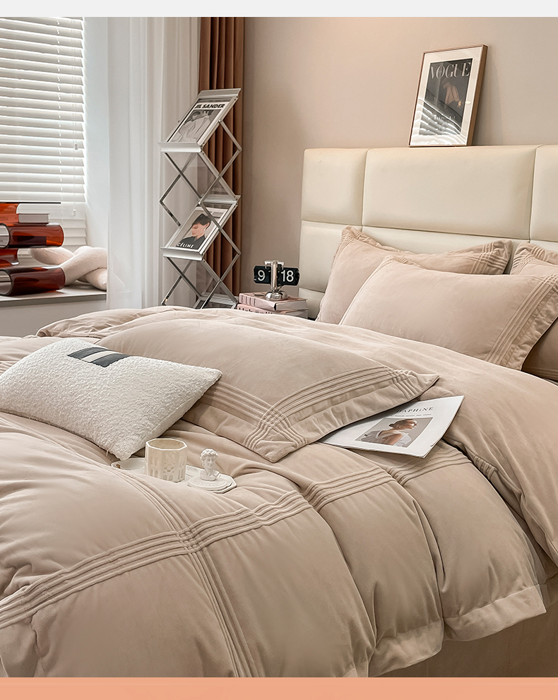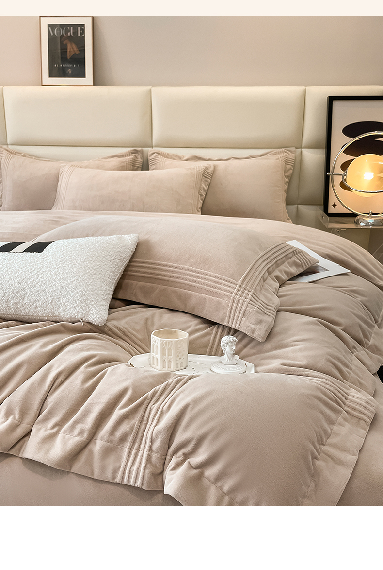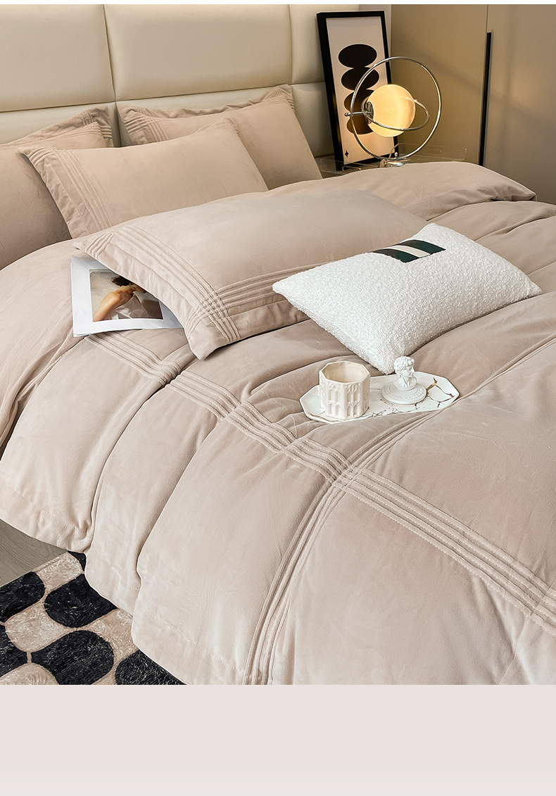 禧澜庭 2024新款A类婴儿绒宝宝绒牛奶绒埋线款埋绳款纯色刺绣四件套 浅卡其