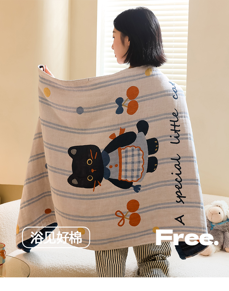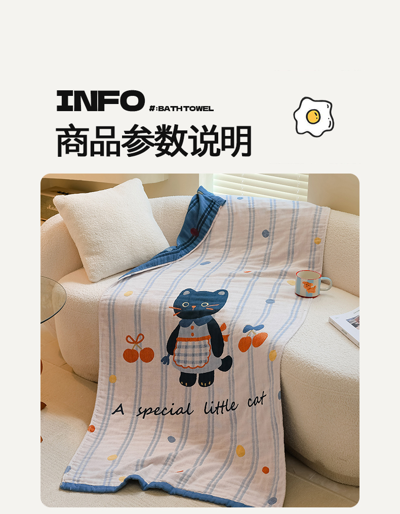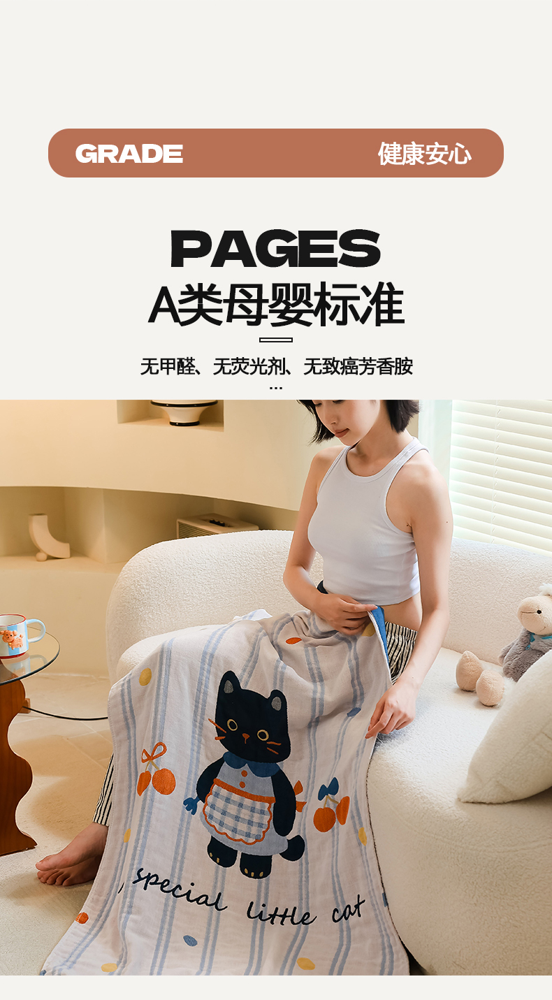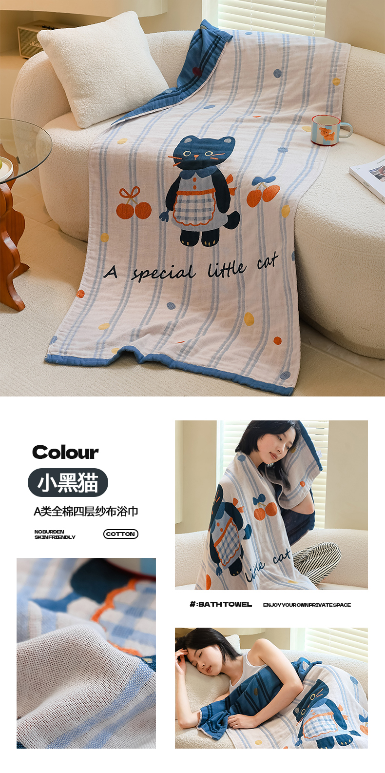 当前位置: 91家纺网 > 商品网购 > 居家日用 > 毛巾/浴巾/浴袍 > 浴巾 > 雯雨家纺 2024新款四层全棉纱布浴巾加大毛巾80*160cm 小黑猫