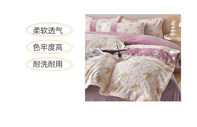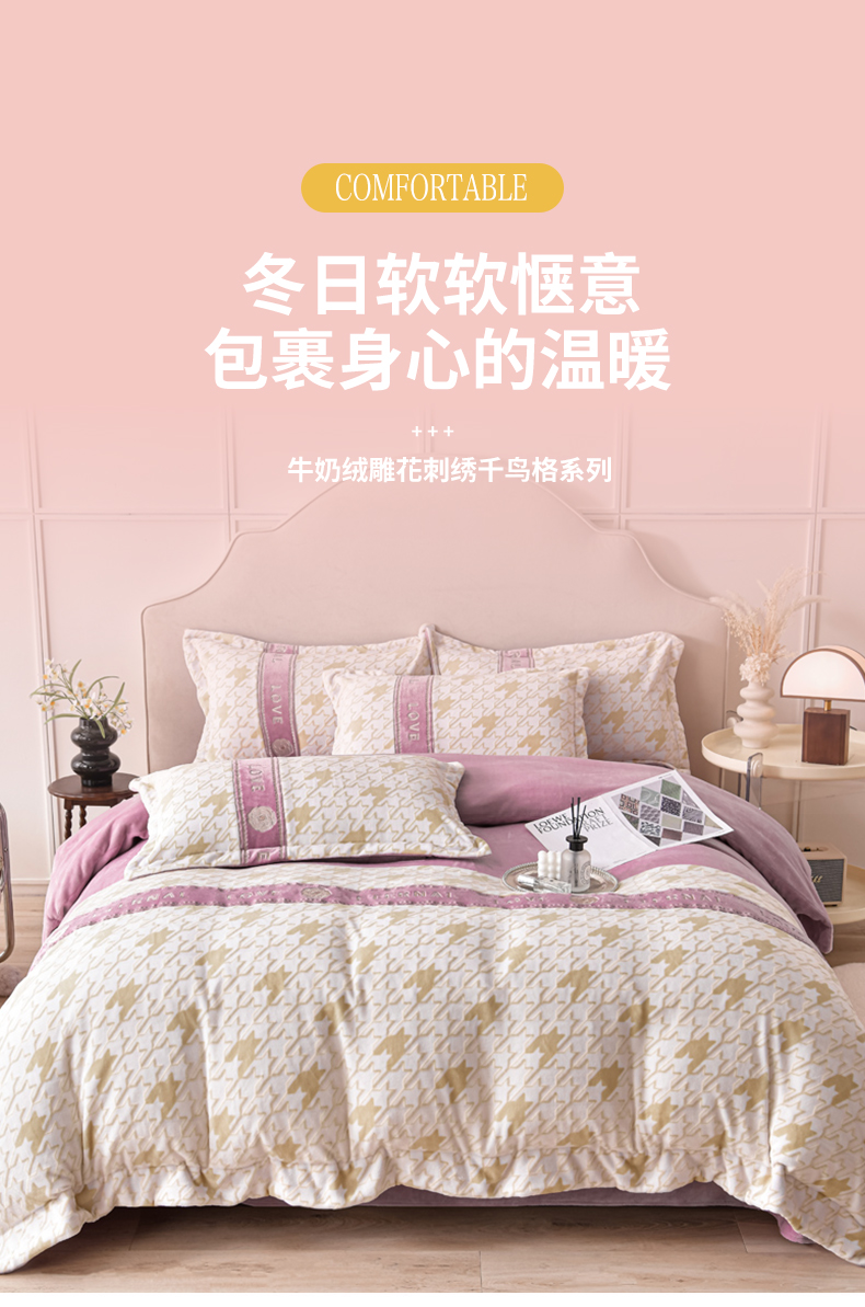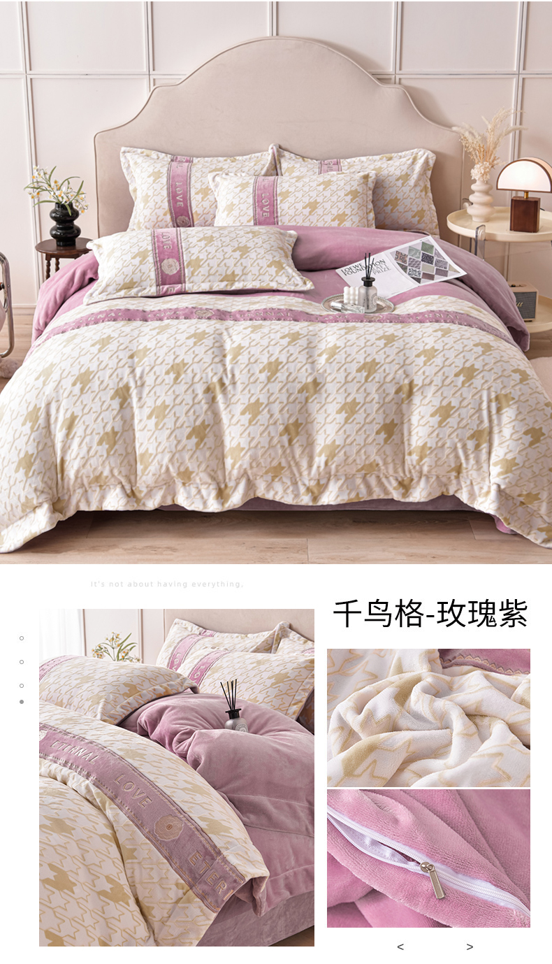 商品名称:妮恒美 2024新款牛奶绒四件套雕花刺绣千鸟格法莱绒四件套 千鸟格-玫瑰紫