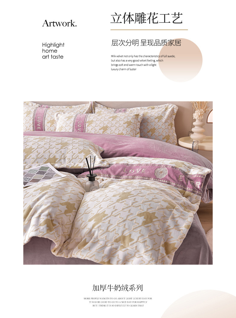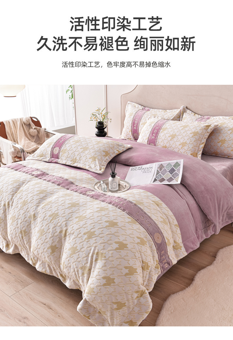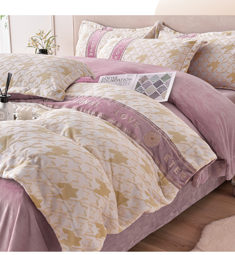 妮恒美 2024新款牛奶绒四件套雕花刺绣千鸟格法莱绒四件套 千鸟格-玫瑰紫