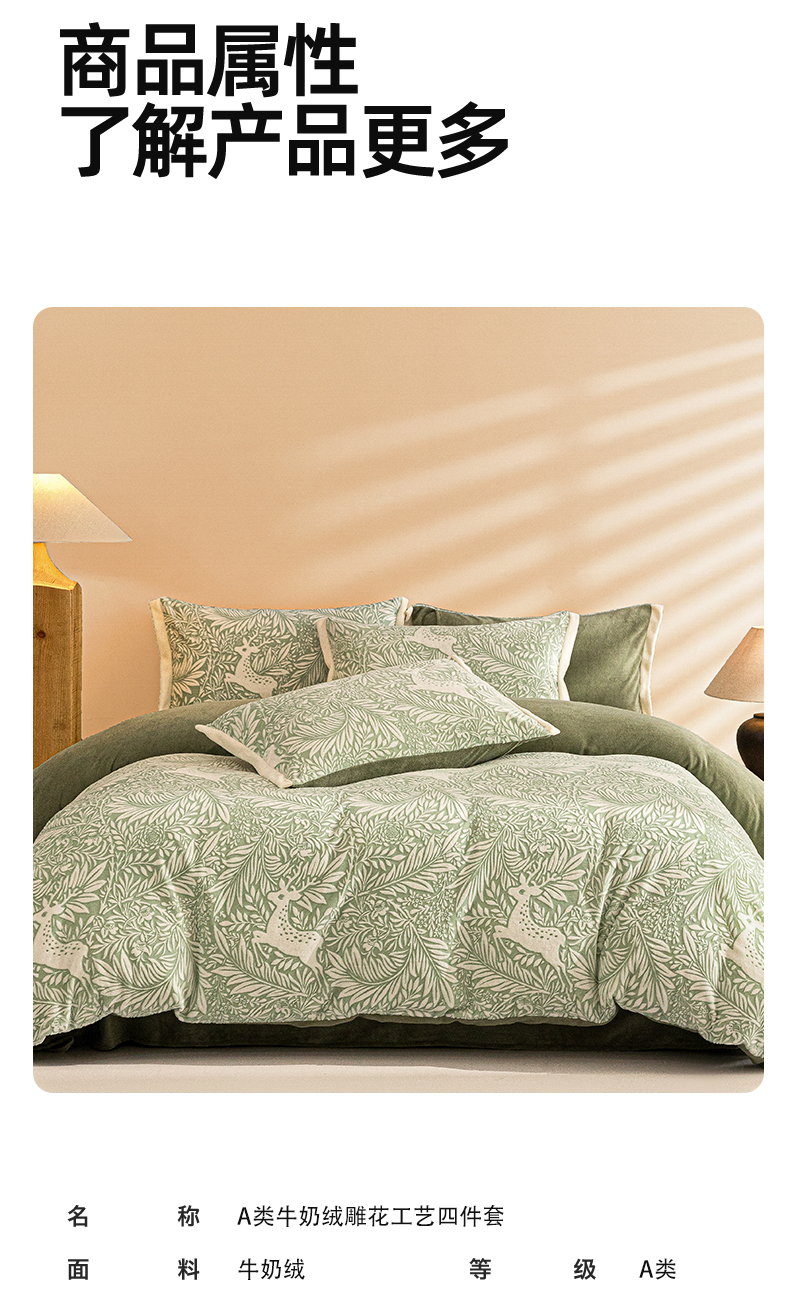 商品名称:2024新保暖-秋冬A类高端加厚牛奶绒雕花四件套系列 维亚纳-绿色