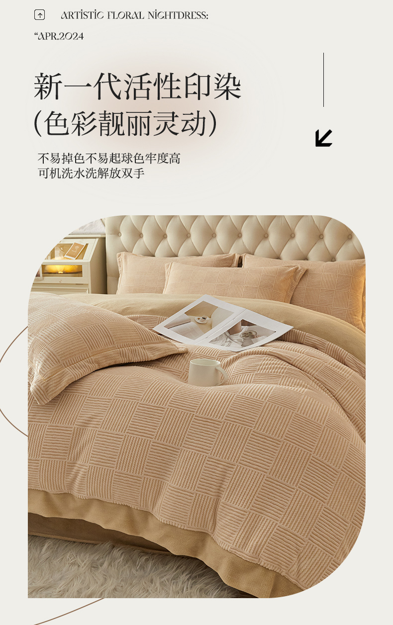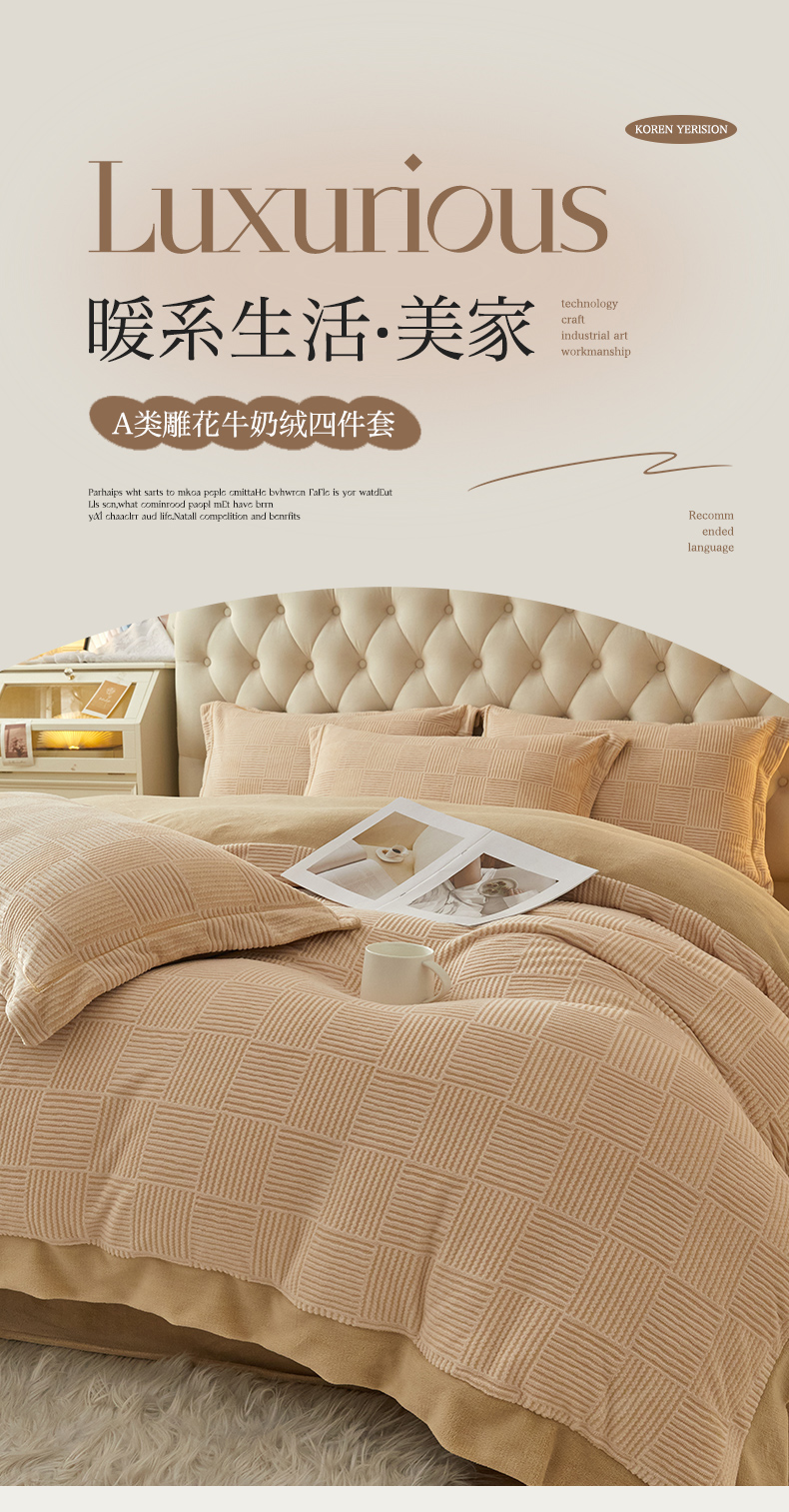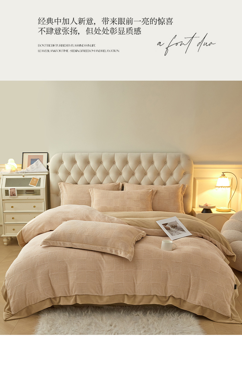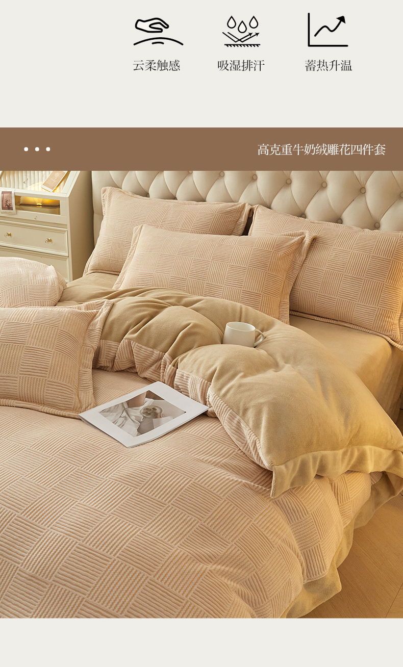 商品名称:简如 2025新款A类230克加厚立体雕花绒四件套 米兰-米驼