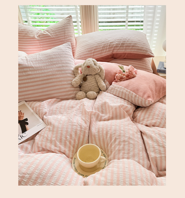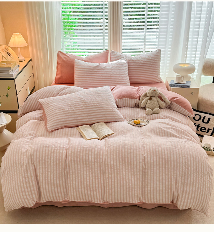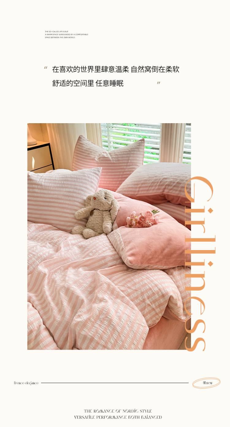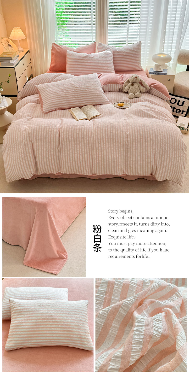 当前位置: 91家纺网 > 商品网购 > 床品套件 > 四件套 > 牛奶绒四件套 > 恩和 2024新款水洗棉提花拼牛奶绒套件 粉白条