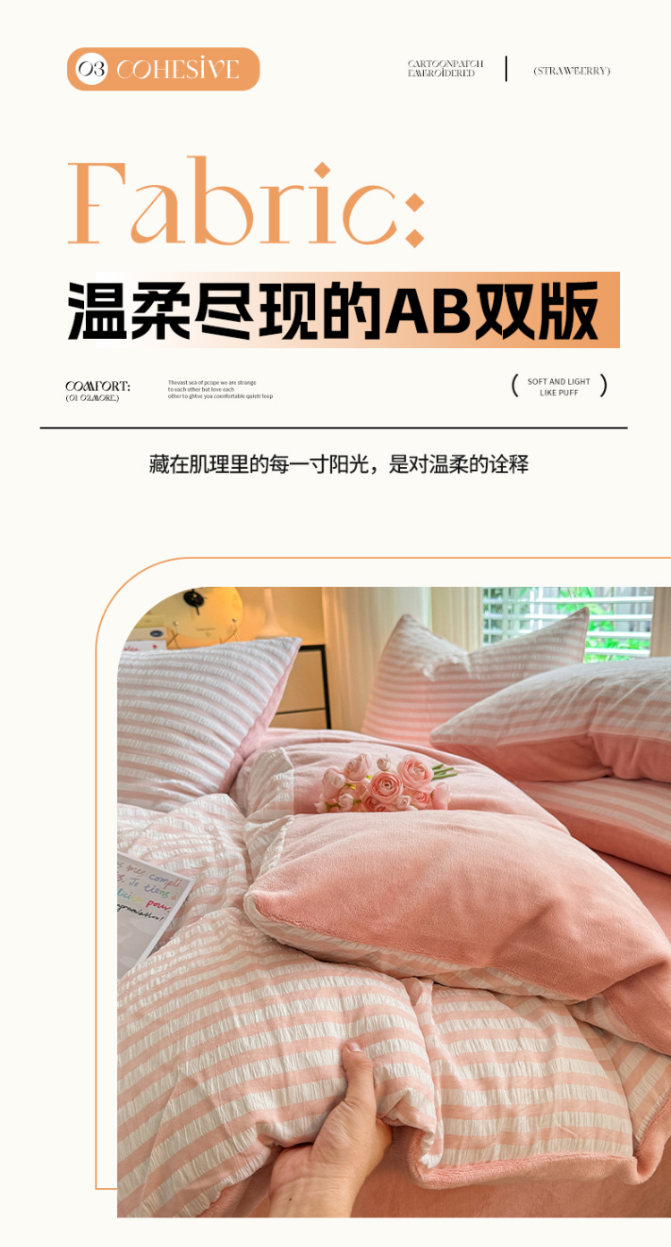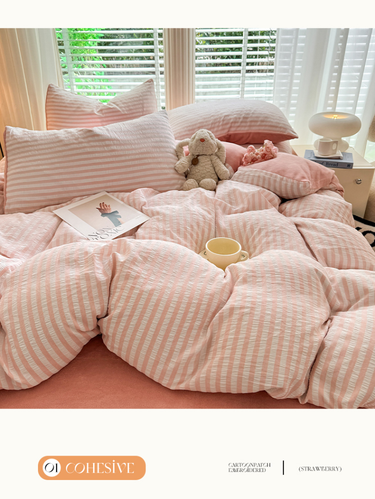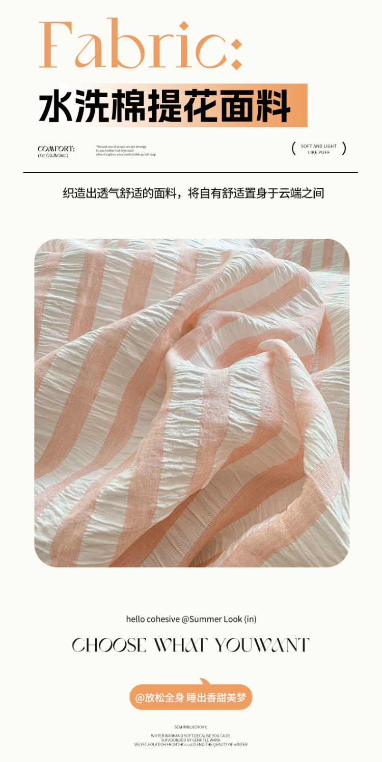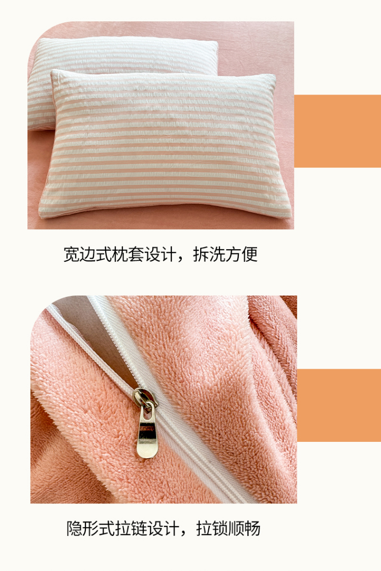 当前位置: 91家纺网 > 商品网购 > 床品套件 > 四件套 > 牛奶绒四件套 > 恩和 2024新款水洗棉提花拼牛奶绒套件 粉白条