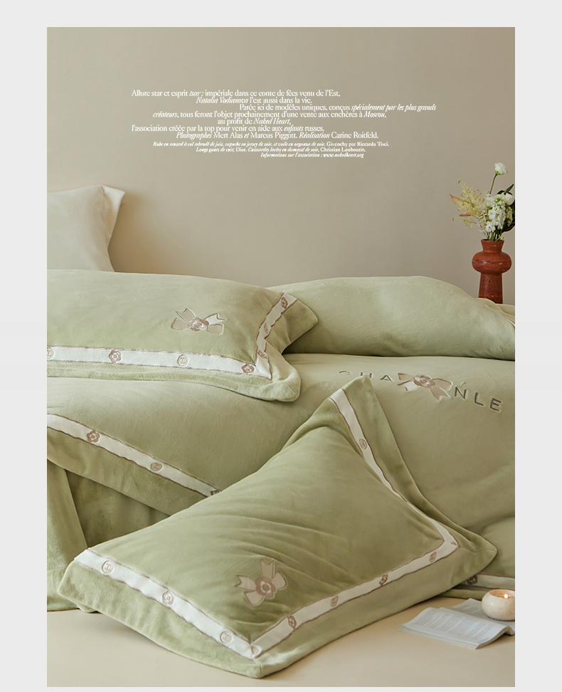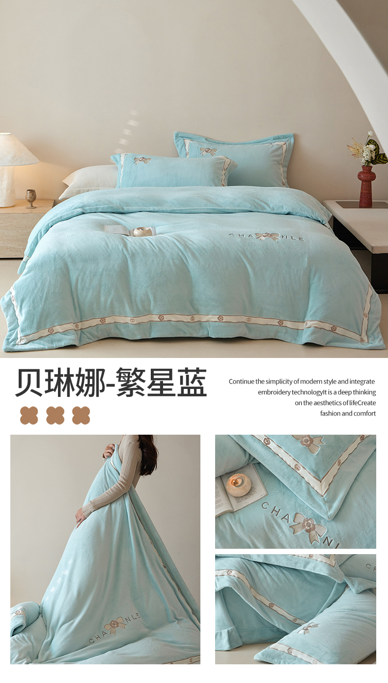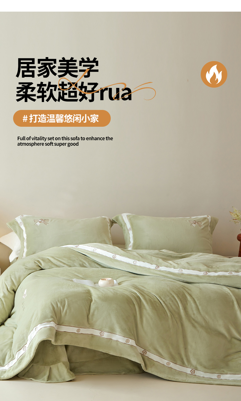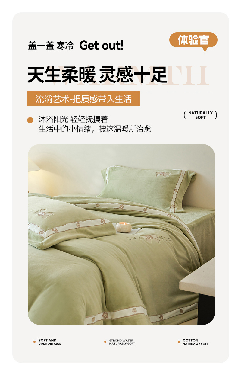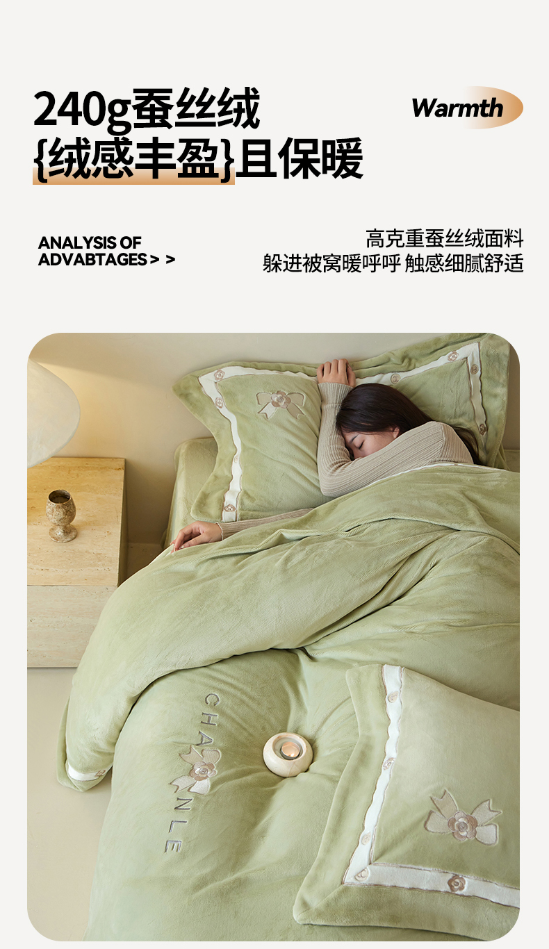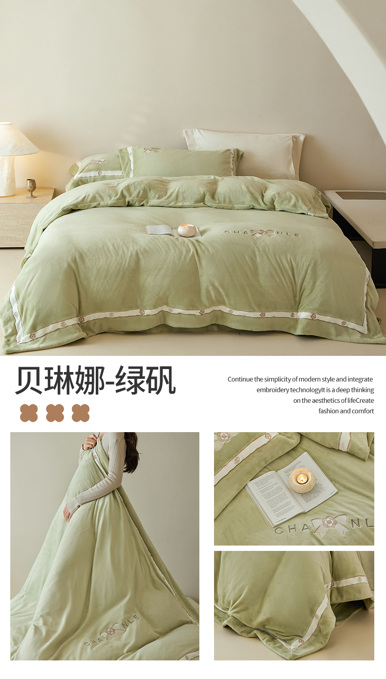 商品名称:泽西家纺 2024秋冬新款高端加厚保暖A类蚕丝绒刺绣拼角牛奶绒四件套-贝琳娜 贝琳娜-绿矾