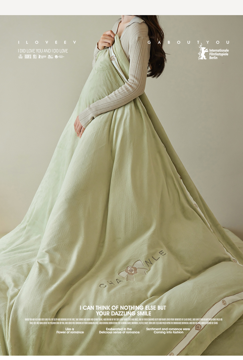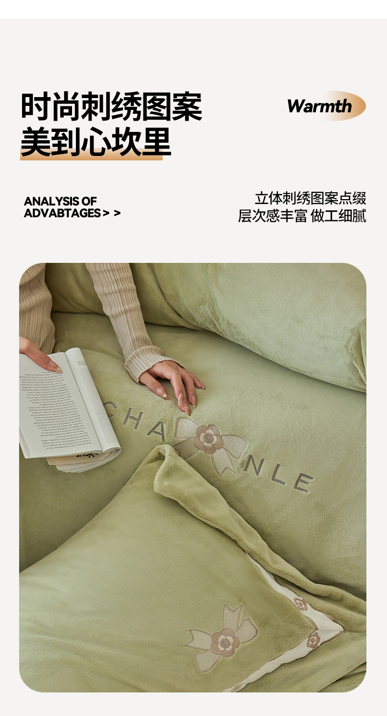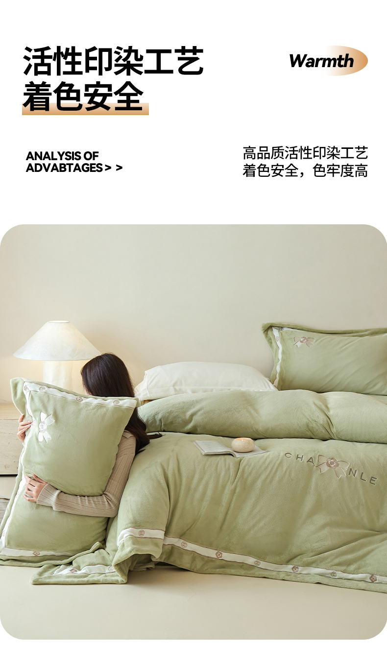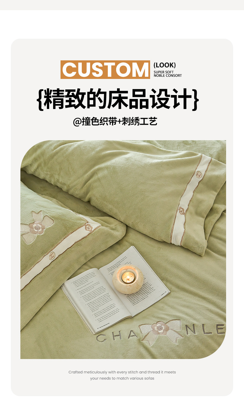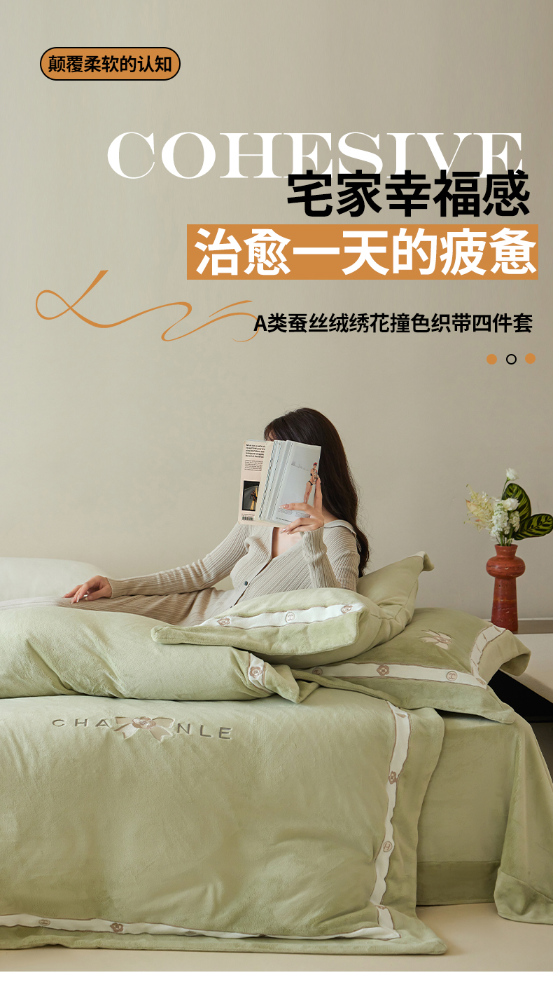 商品名称:泽西家纺 2024秋冬新款高端加厚保暖A类蚕丝绒刺绣拼角牛奶绒四件套-贝琳娜 贝琳娜-绿矾