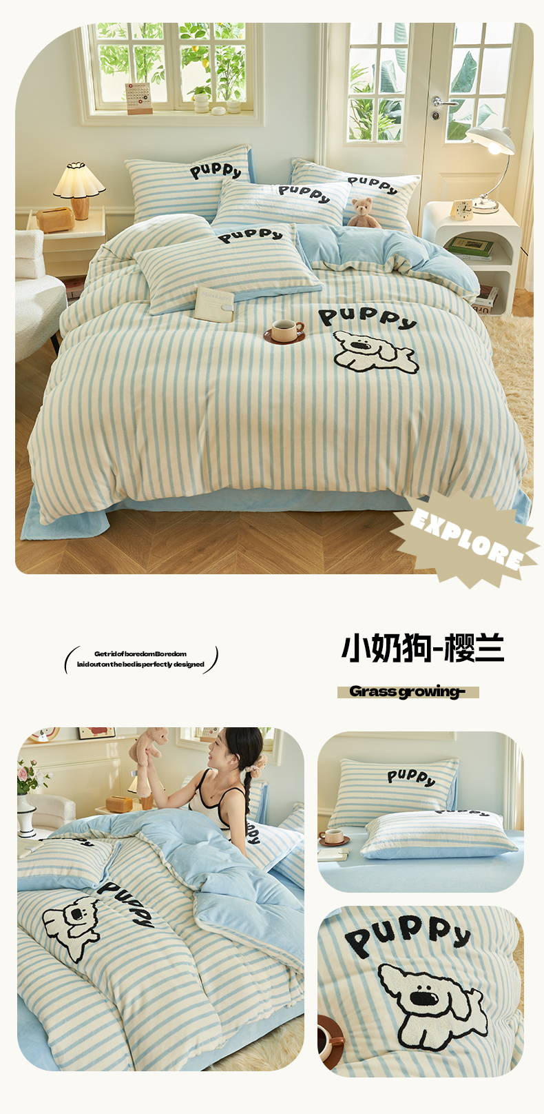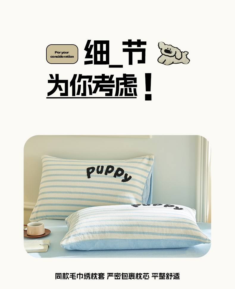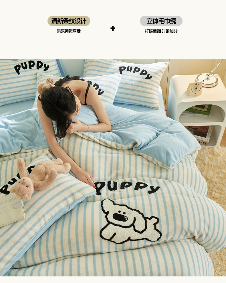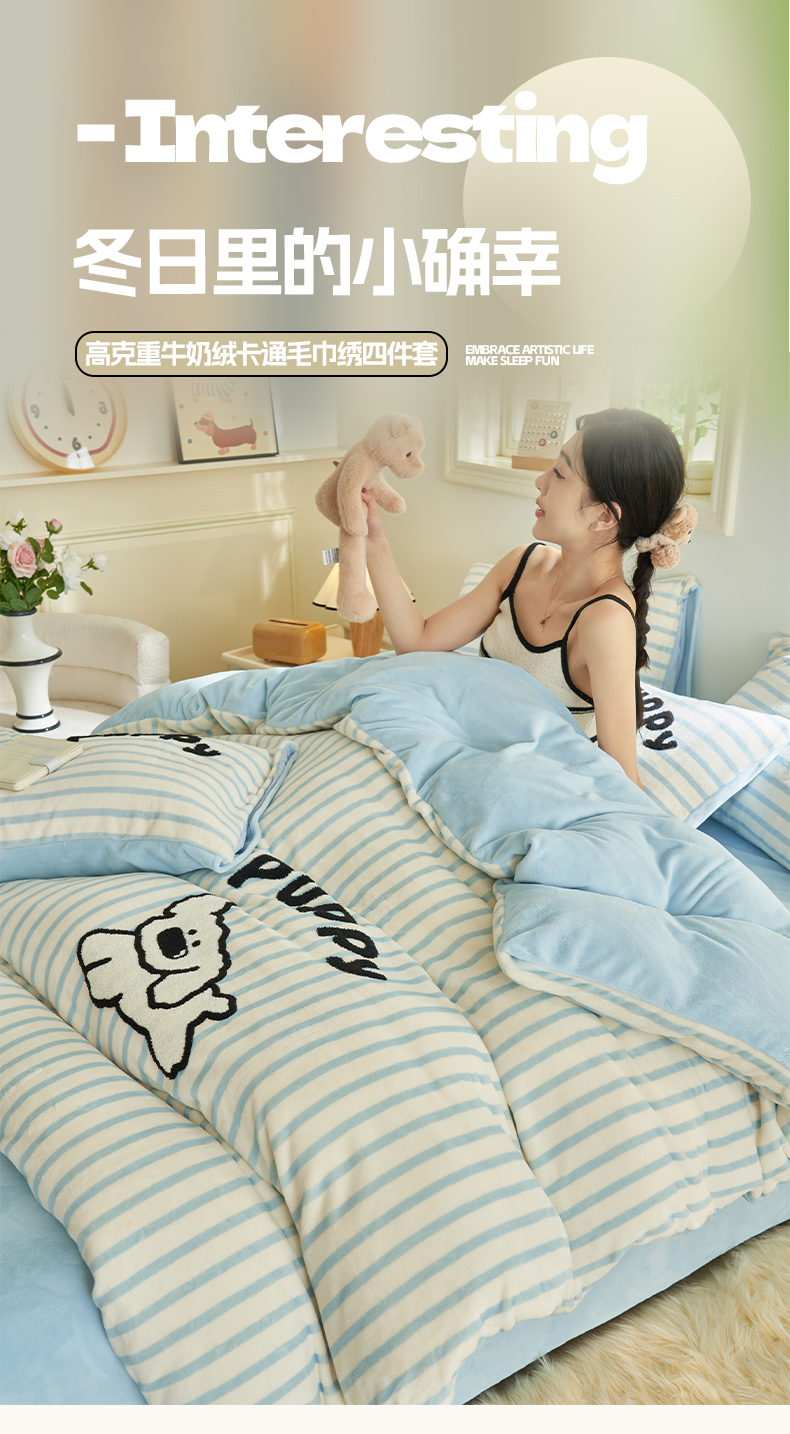 当前位置: 91家纺网 > 商品网购 > 床品套件 > 四件套 > 牛奶绒四件套 > 晨曦家纺 2024新款卡通毛巾绣牛奶绒卡通四件套 小奶狗-樱兰