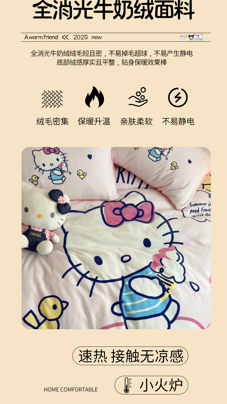 (总)三朵家纺 2024新款全消光三丽鸥印花牛奶绒系列四件套,爱心凯蒂,街舞库洛米,凯蒂公主,乐园KT,漫画帕恰,美好帕恰,美乐蒂格格,淘气帕恰,甜蜜公主KT,童心帕恰,艺术家库洛米,运动帕恰,字母帕恰