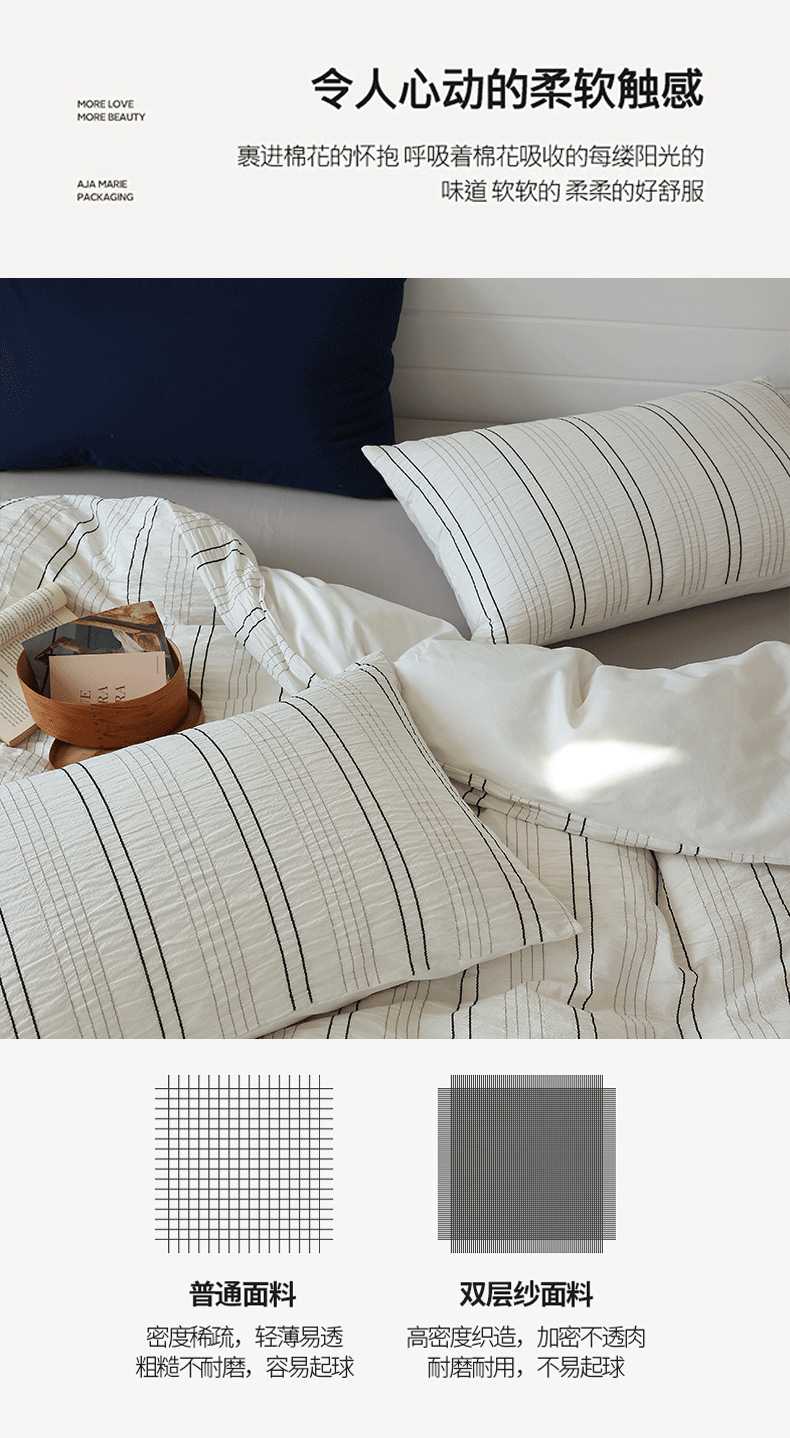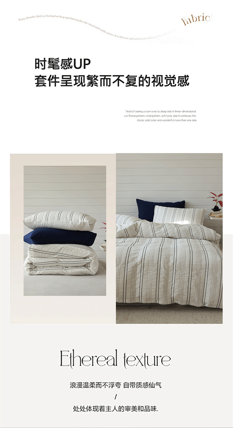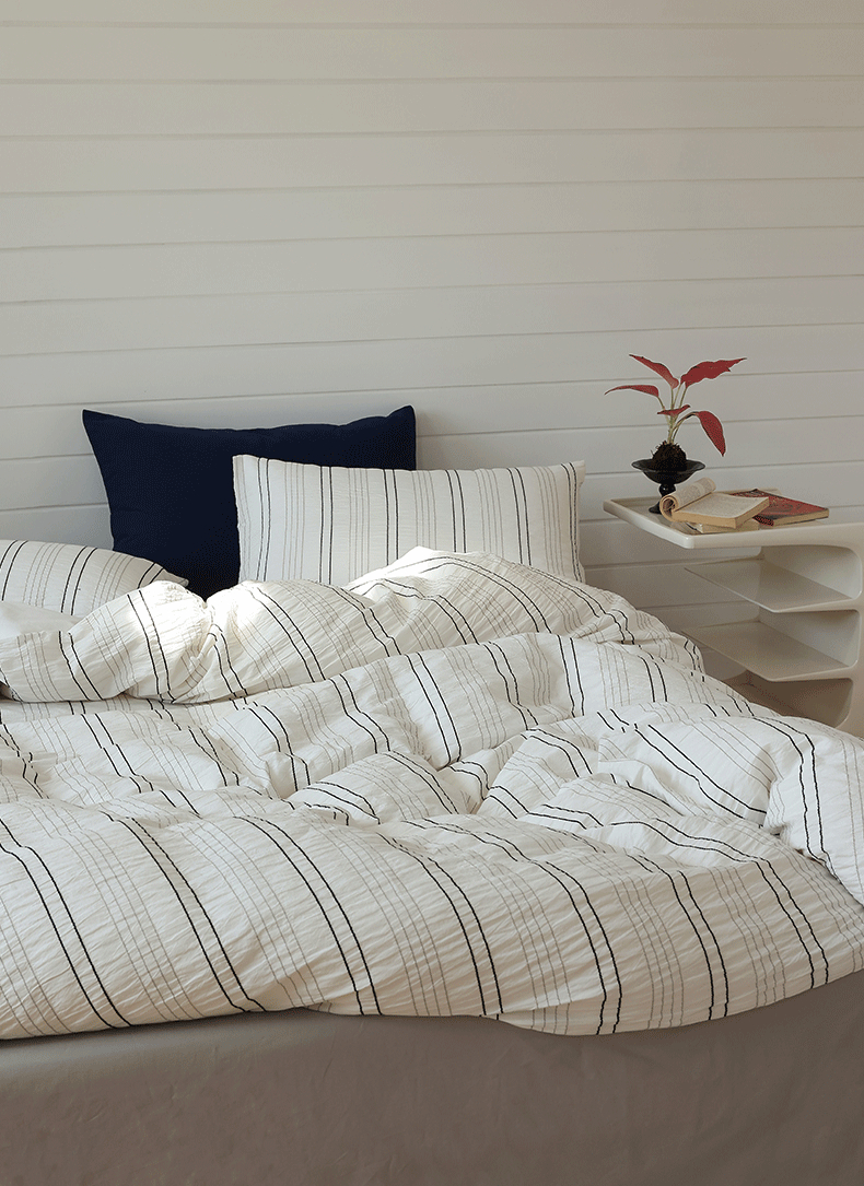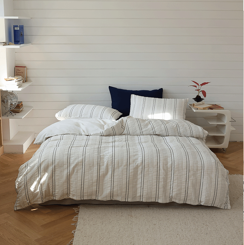 当前位置: 91家纺网 > 商品网购 > 床品套件 > 四件套 > 水洗棉四件套 > 棉眠 2024新款水洗皱皱纱色织提花线条混搭系列四件套 黑灰细条配灰