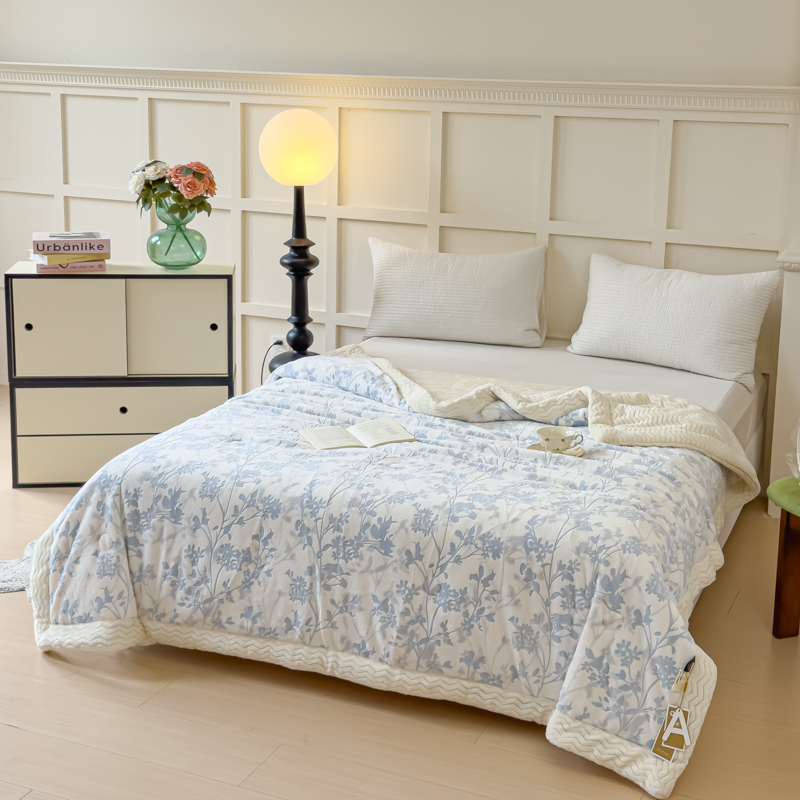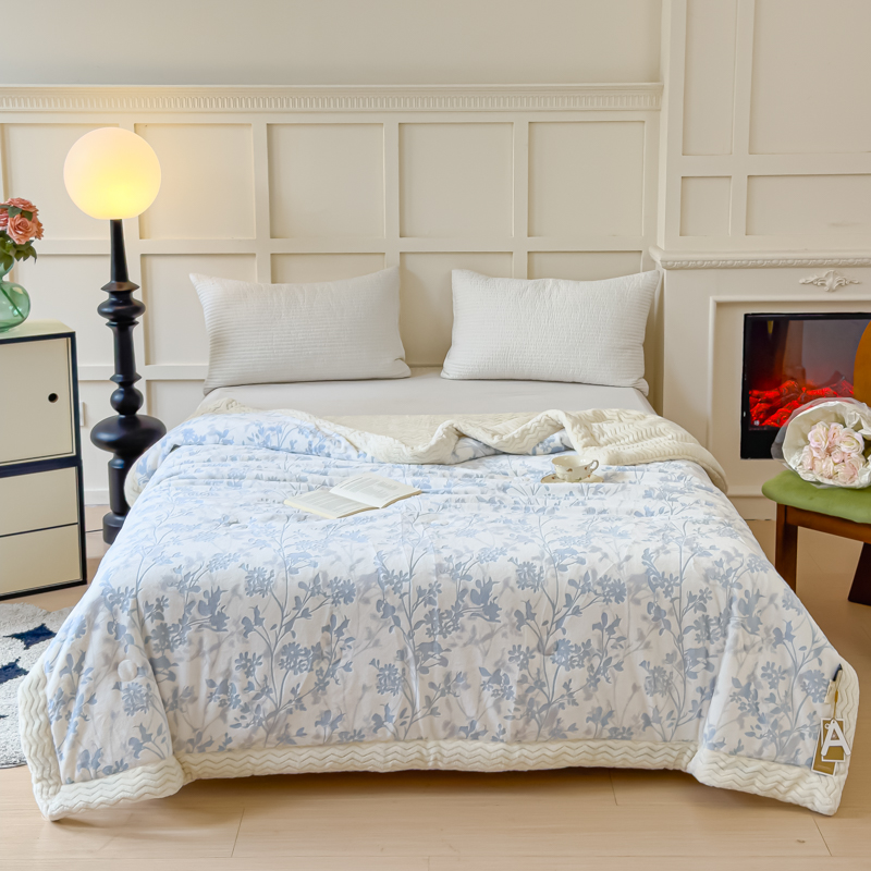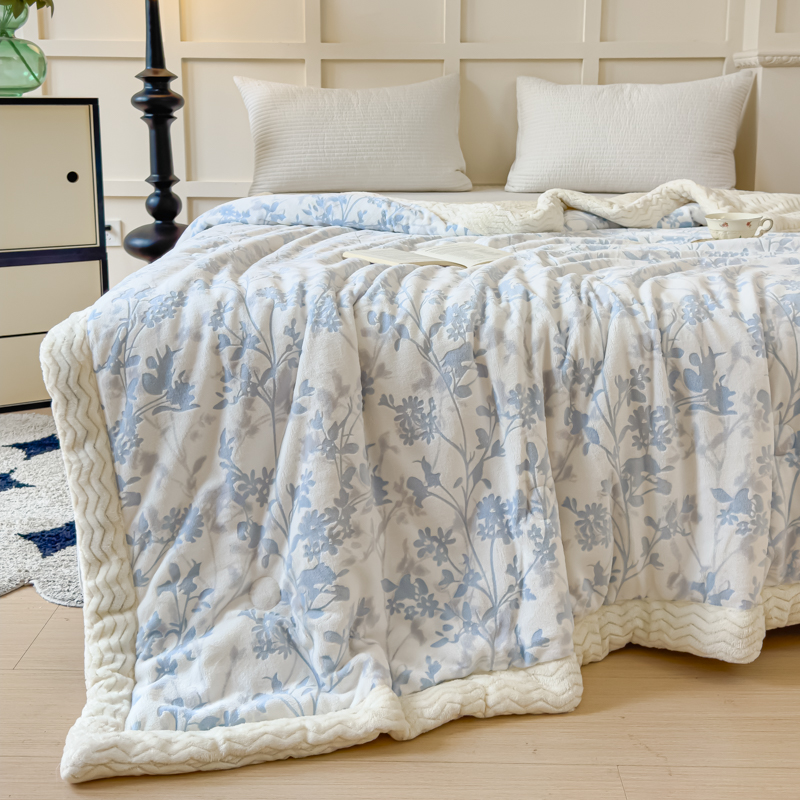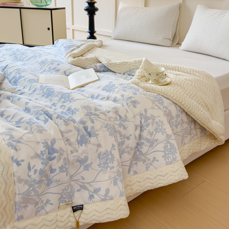 商品名称:金丝鸟 2024加厚240g立体雕花牛奶绒夹棉绗缝手包毛毯毯子 繁花蓝 手包毯