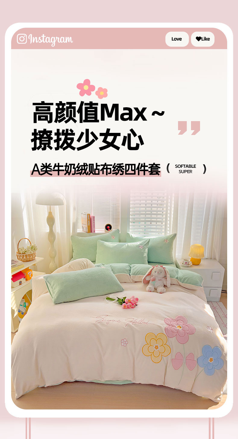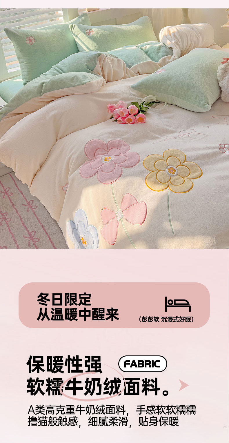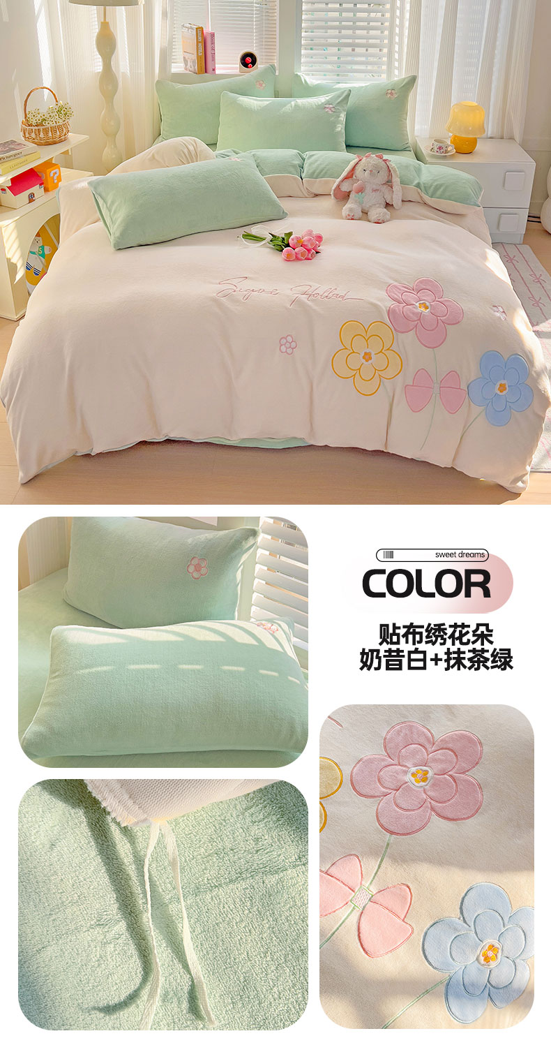 当前位置: 91家纺网 > 商品网购 > 床品套件 > 四件套 > 牛奶绒四件套 > 灰鲸 2025新款高克重牛奶绒大版郁金香花朵贴布绣四件套 贴布绣花朵-奶昔白+抹茶绿