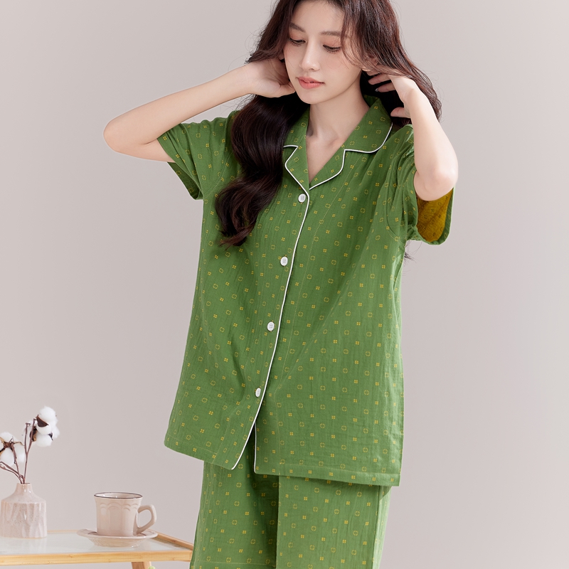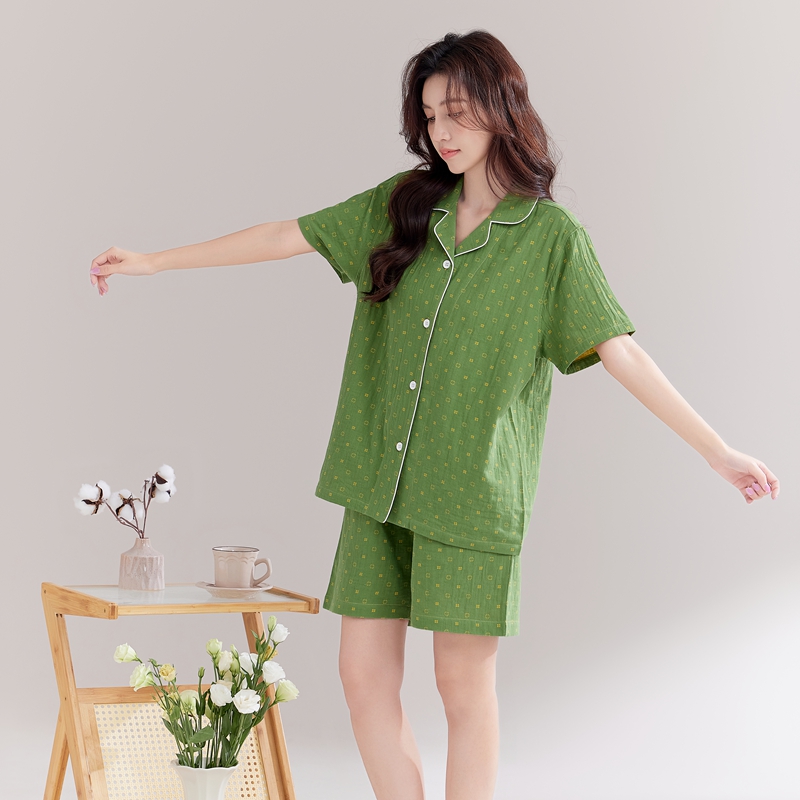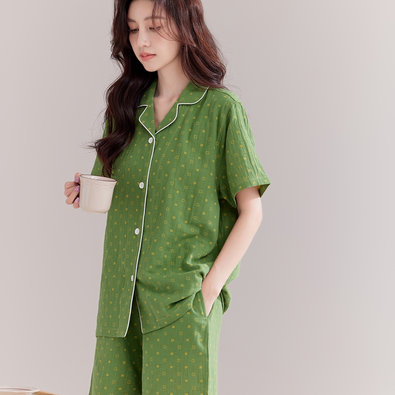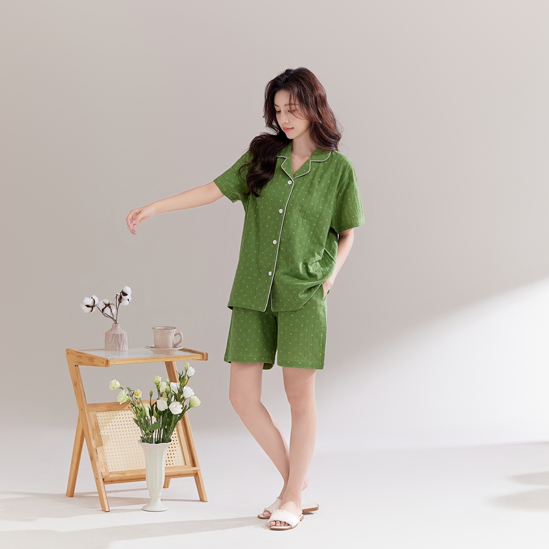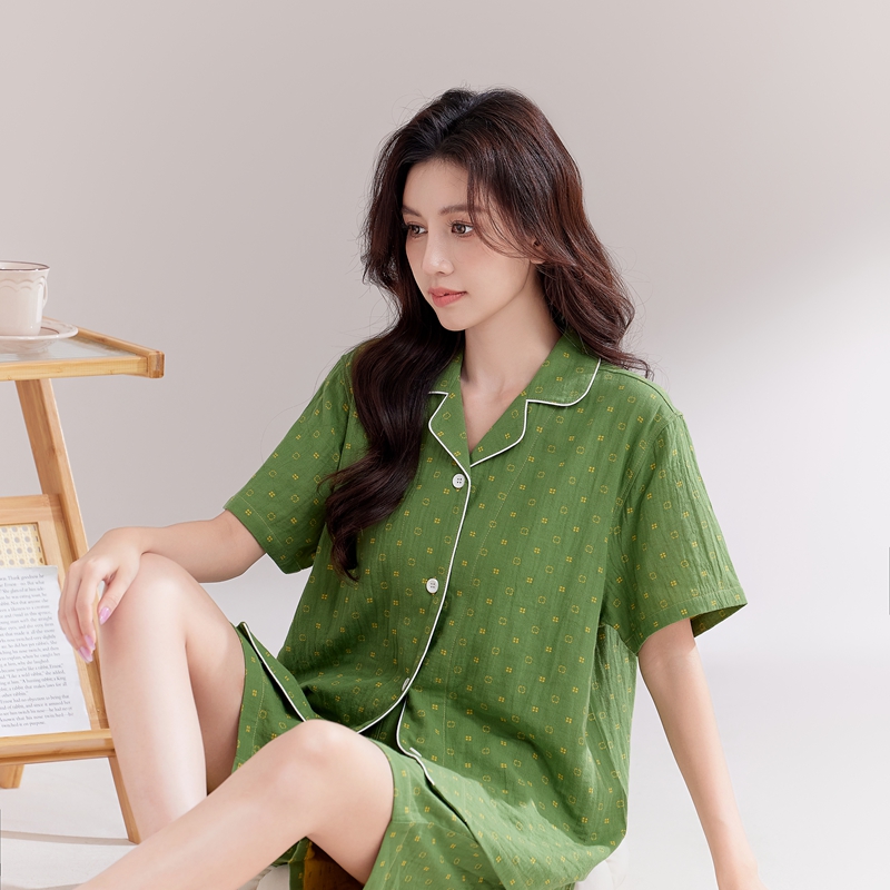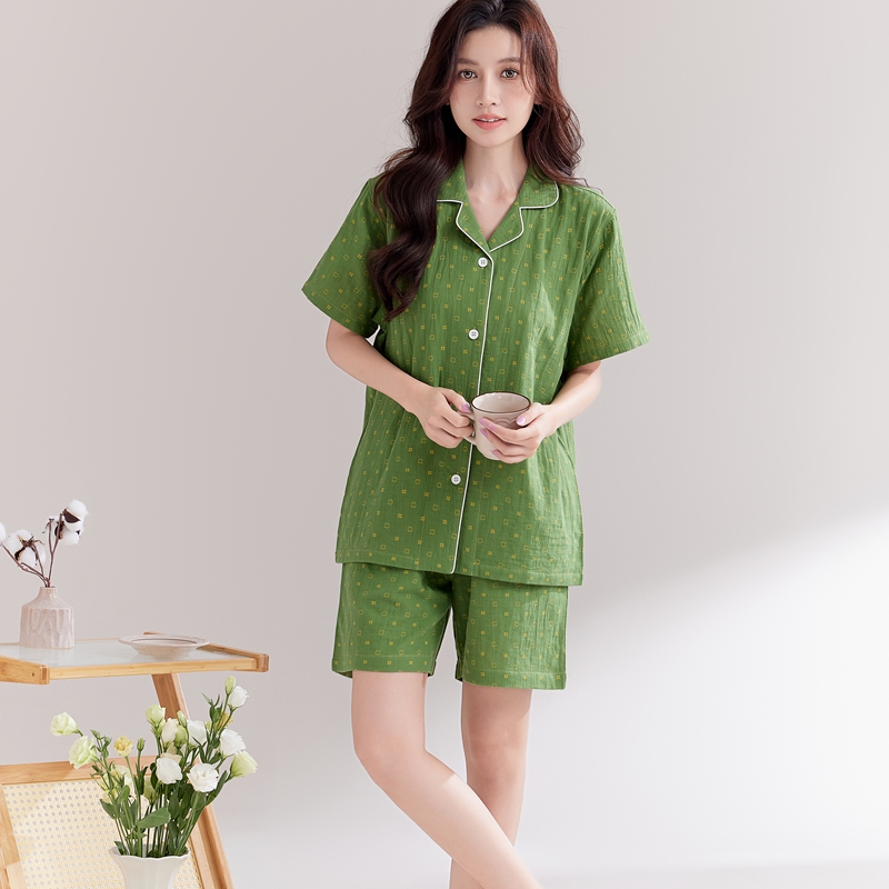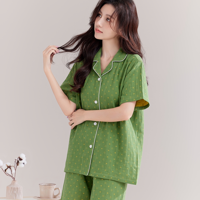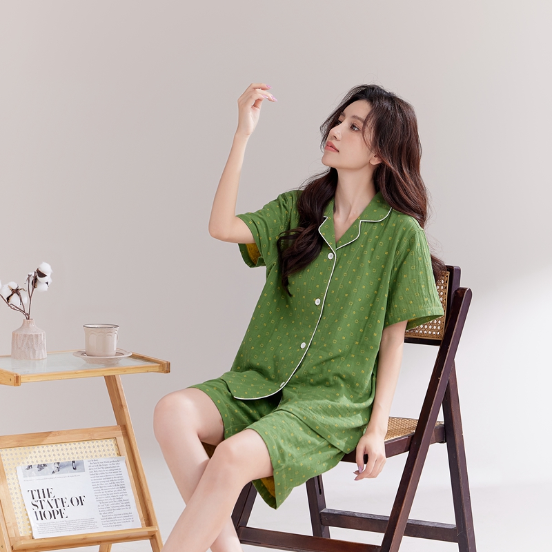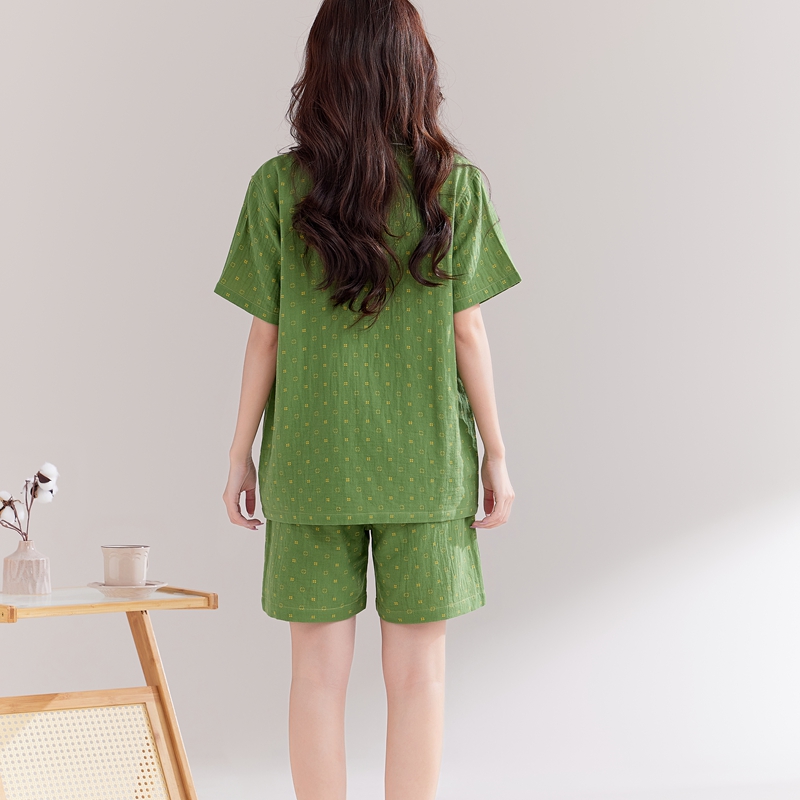 玖弘家居 2024新款家居服系列-花妍系列【控价 抖音69.9 视频号 89.9 小红书 89.9 】 短袖绿底黄点女款
