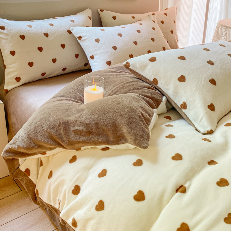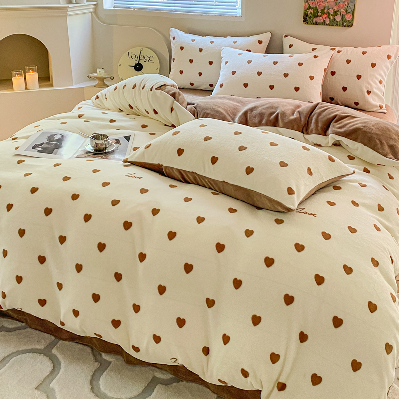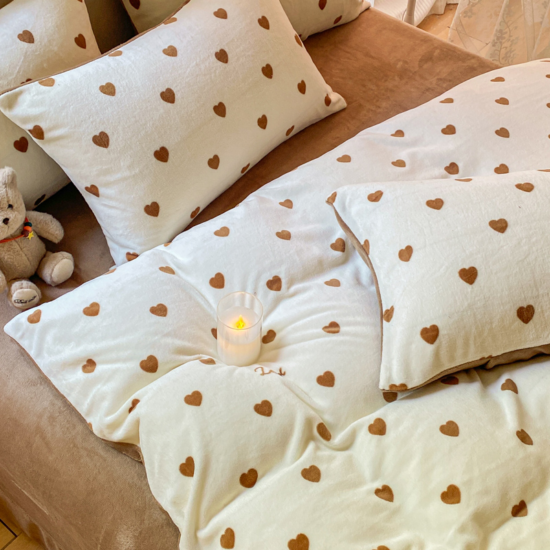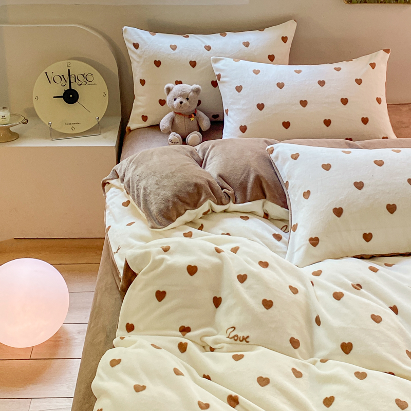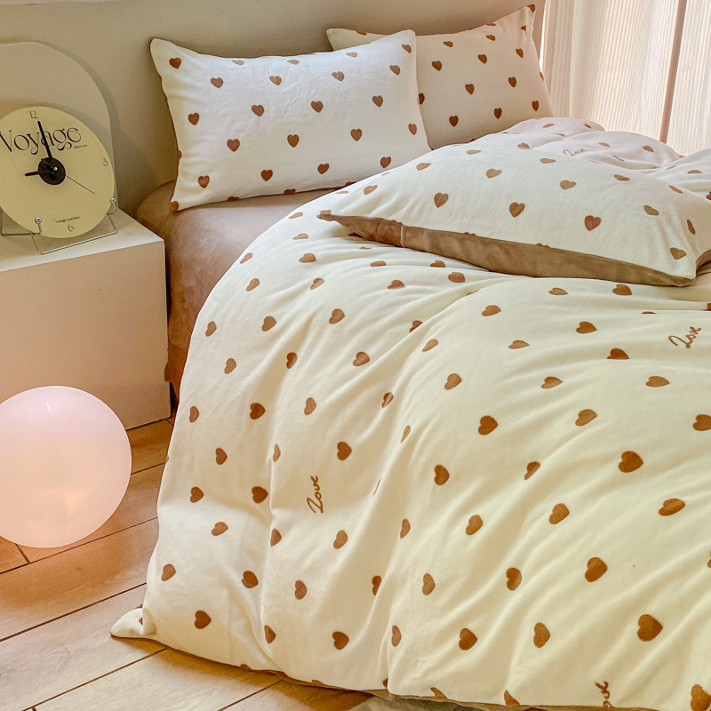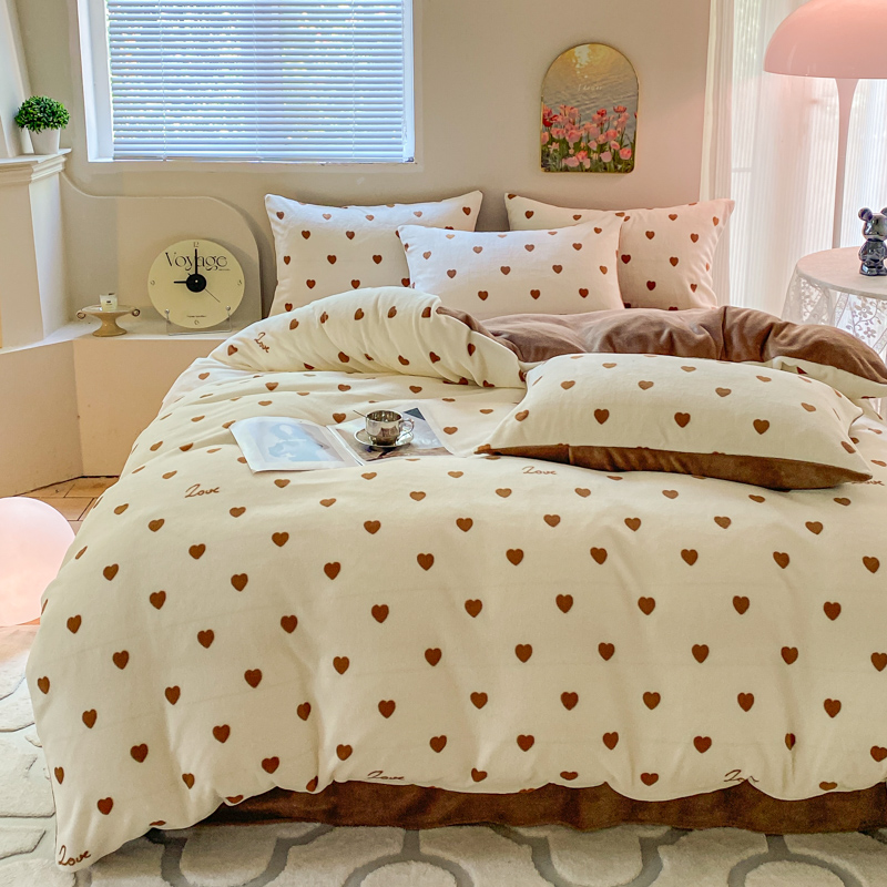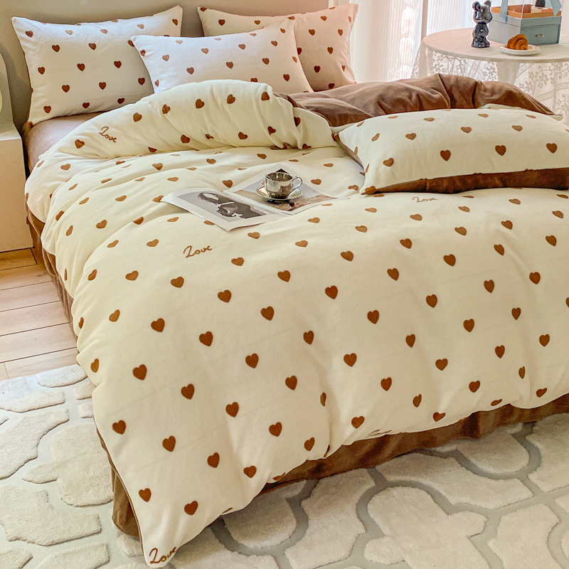 商品名称:斯卡诺家纺 2025新款小清新双面牛奶绒印花四件套 爱心咖