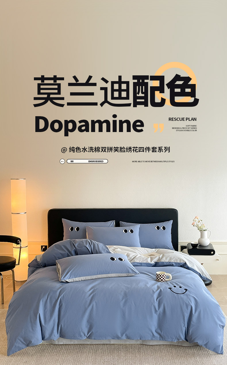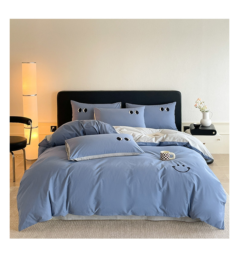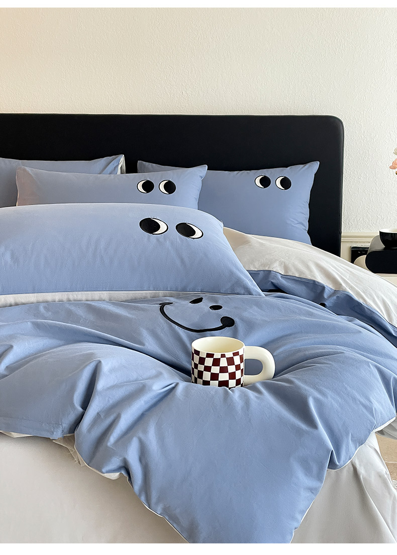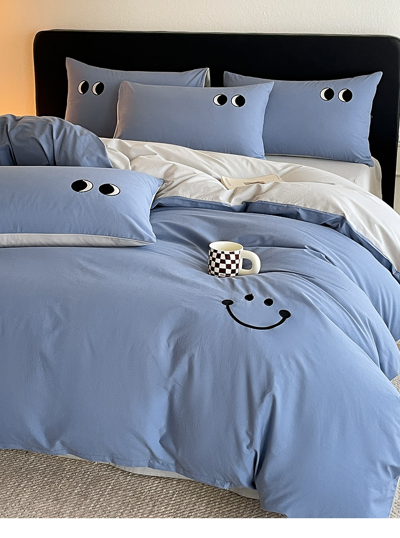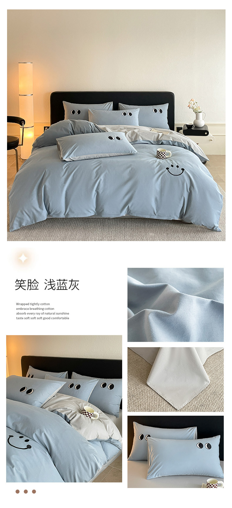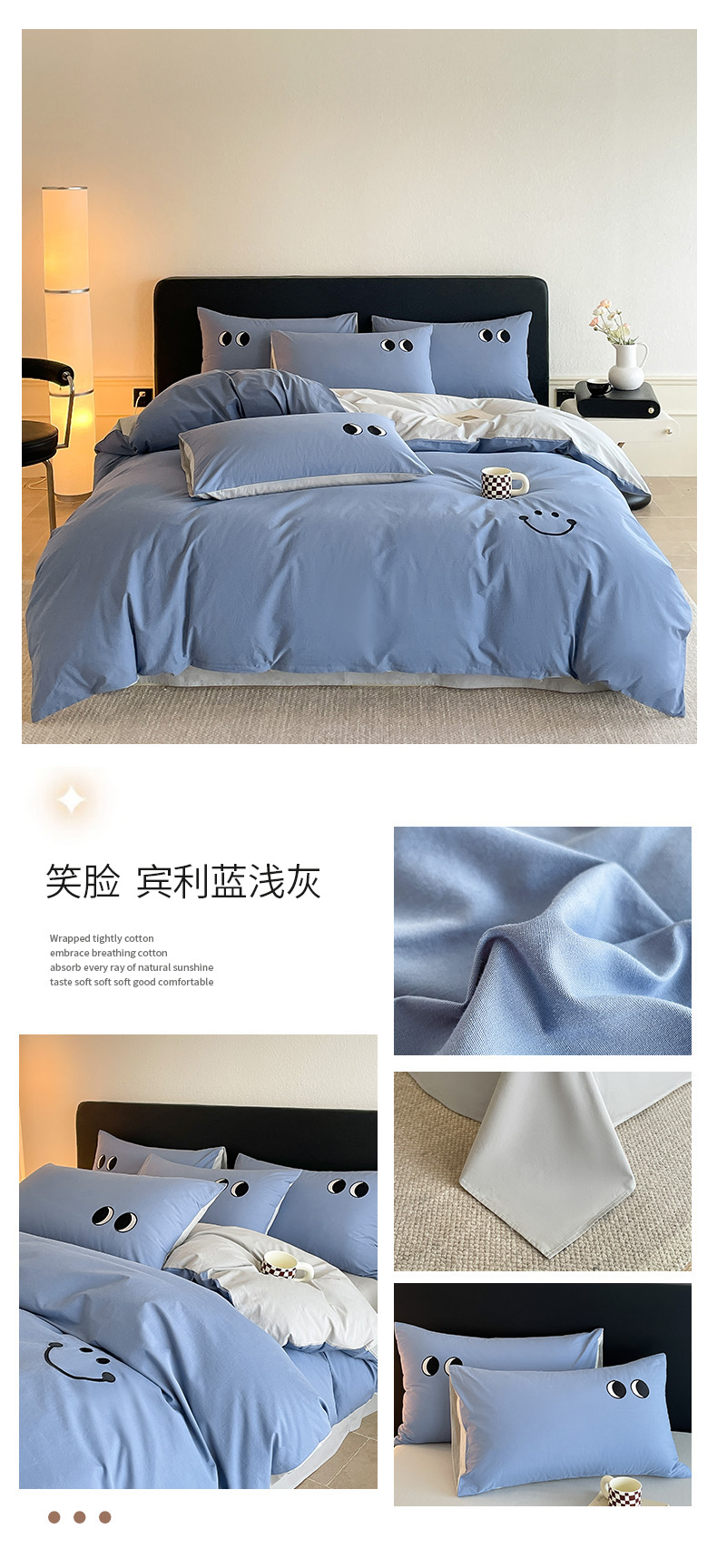 (总)ab家纺 2025新款纯色水洗棉笑脸双拼绣花四件套