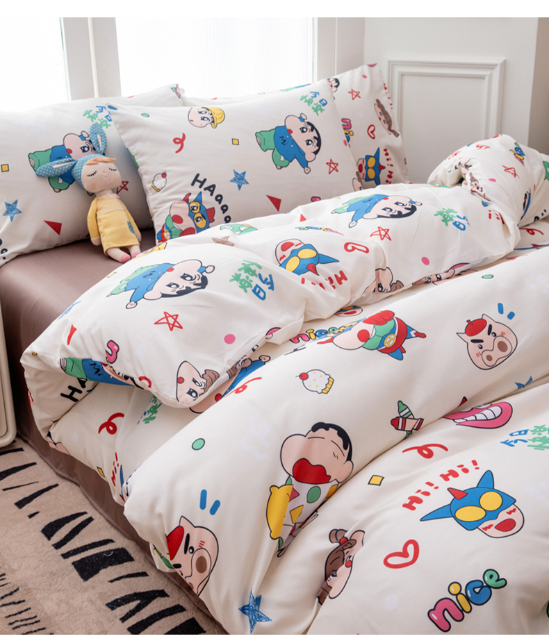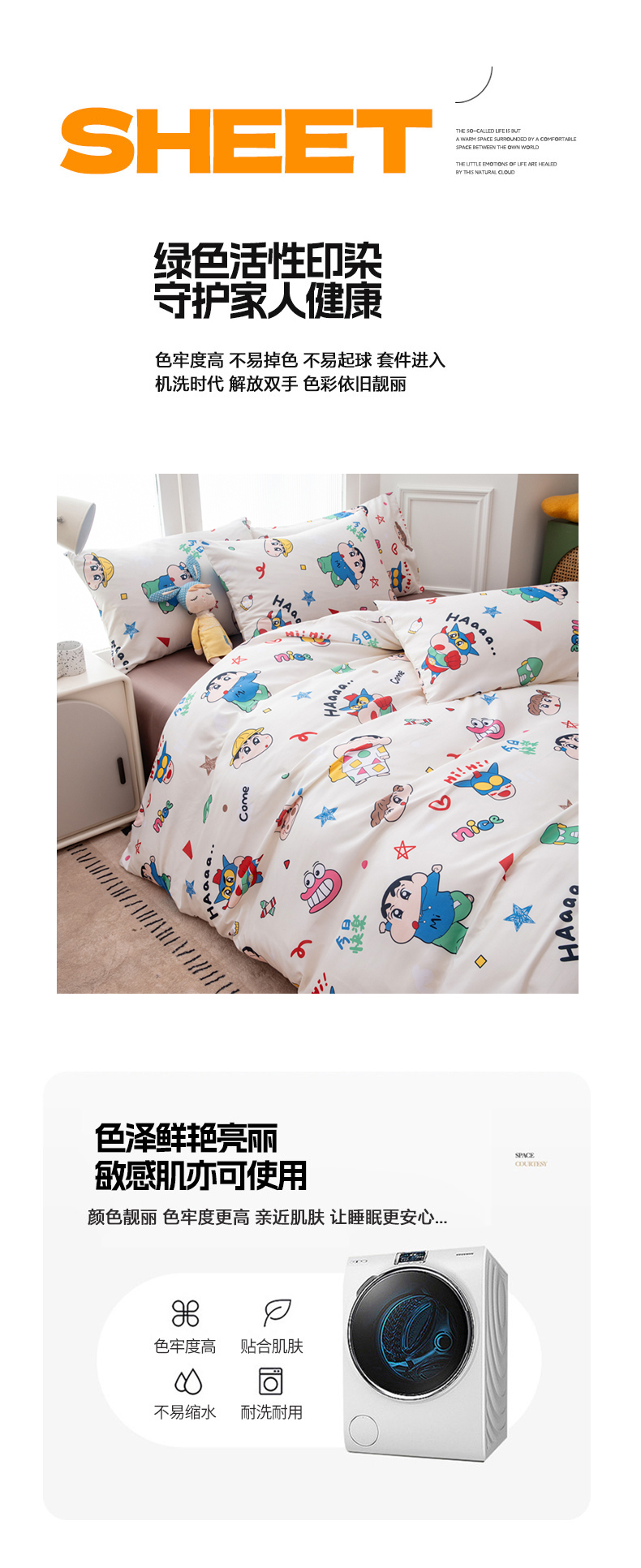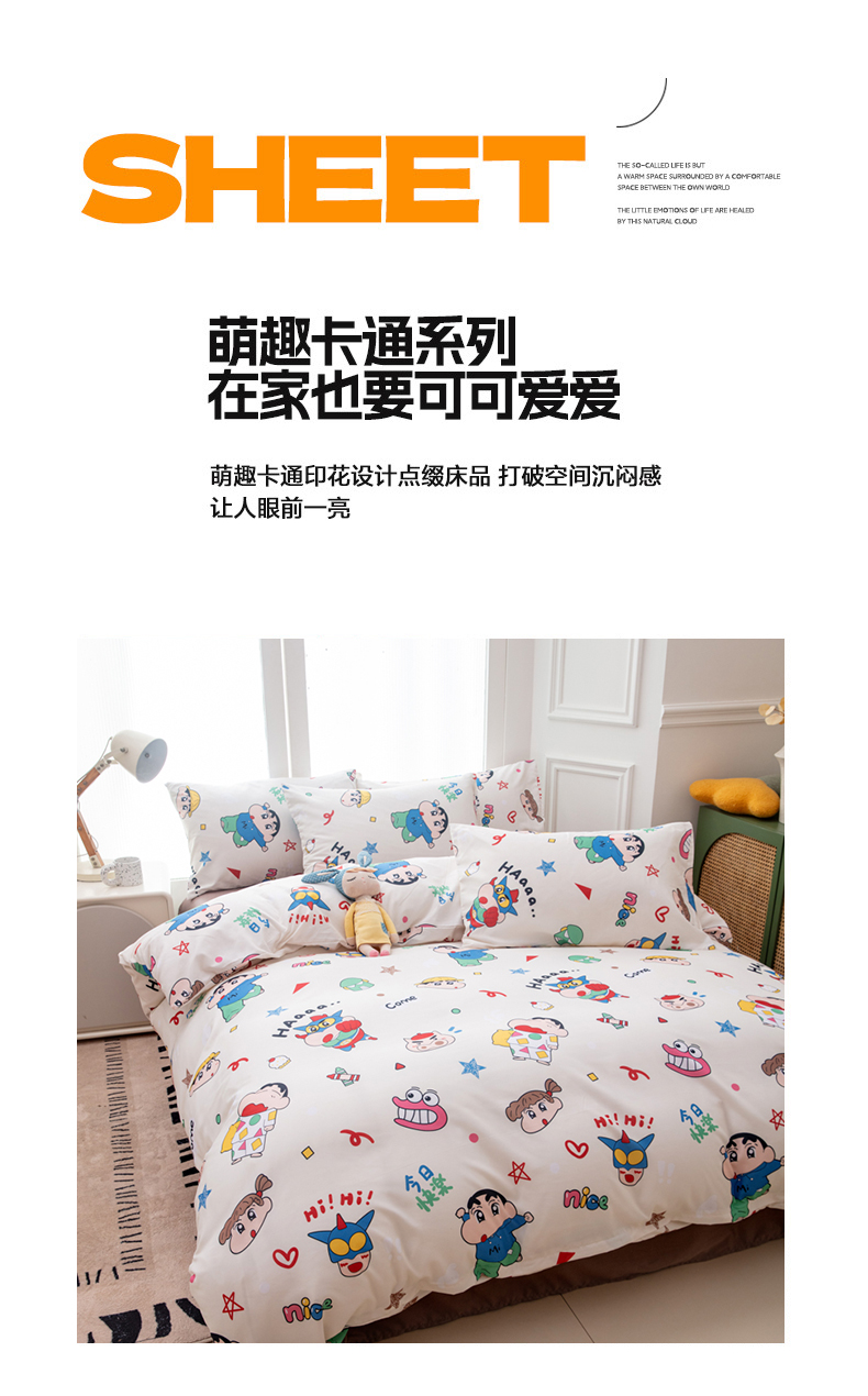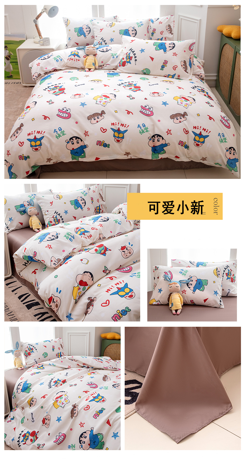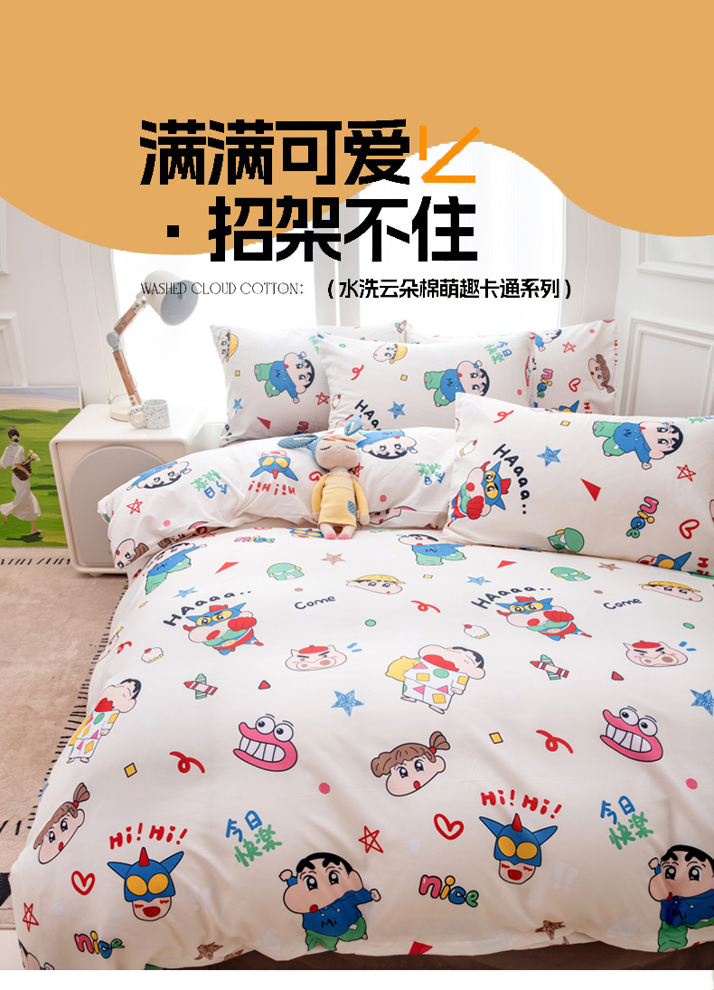 当前位置: 91家纺网 > 商品网购 > 床品套件 > 四件套 > 水洗棉四件套 > 乐居坊 2025新款亲肤舒适A类水洗云朵棉四件套-场景二 可爱小新