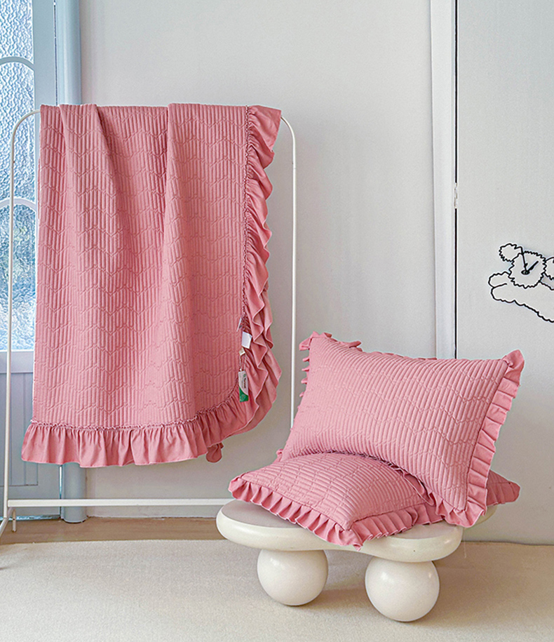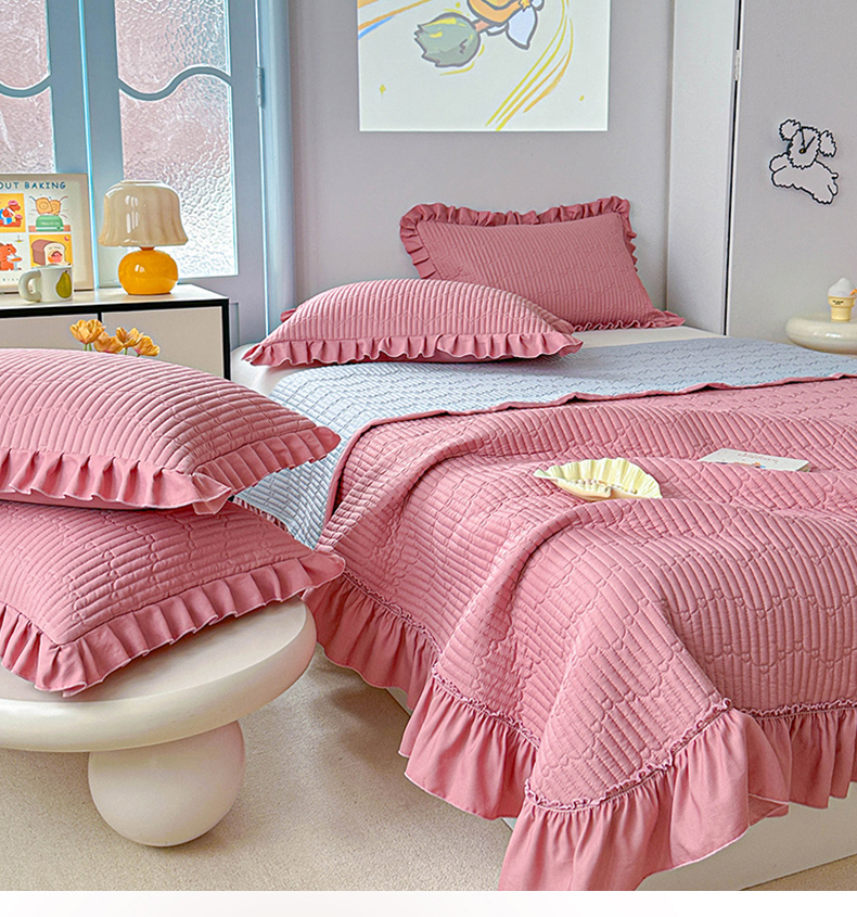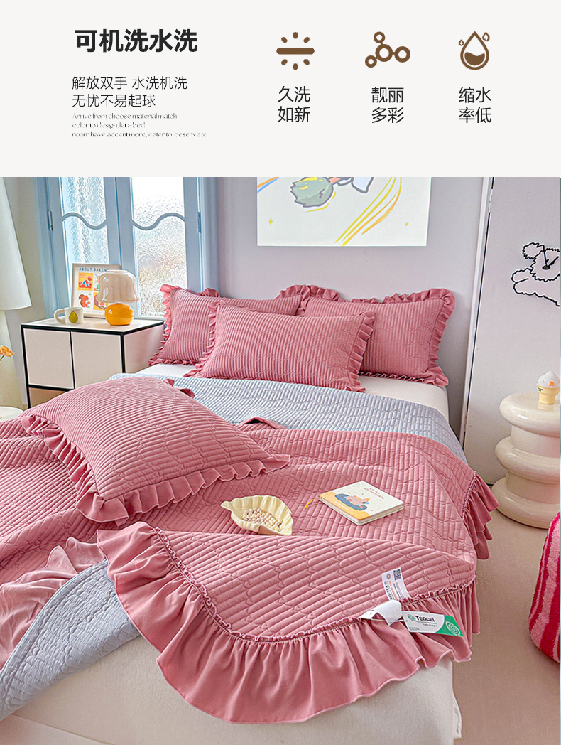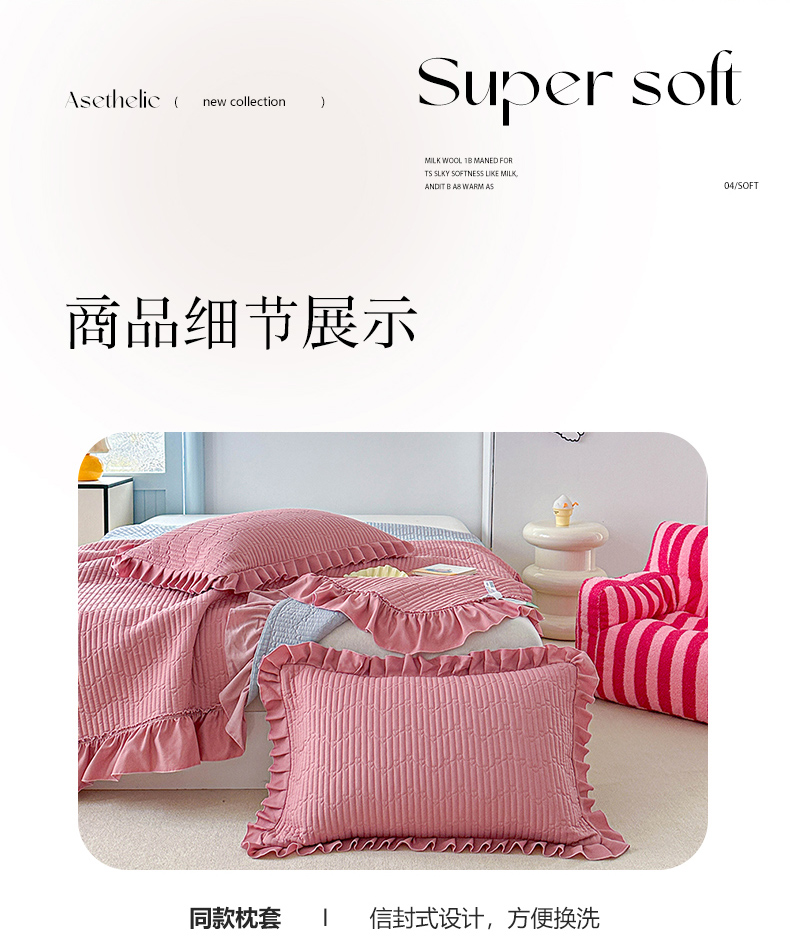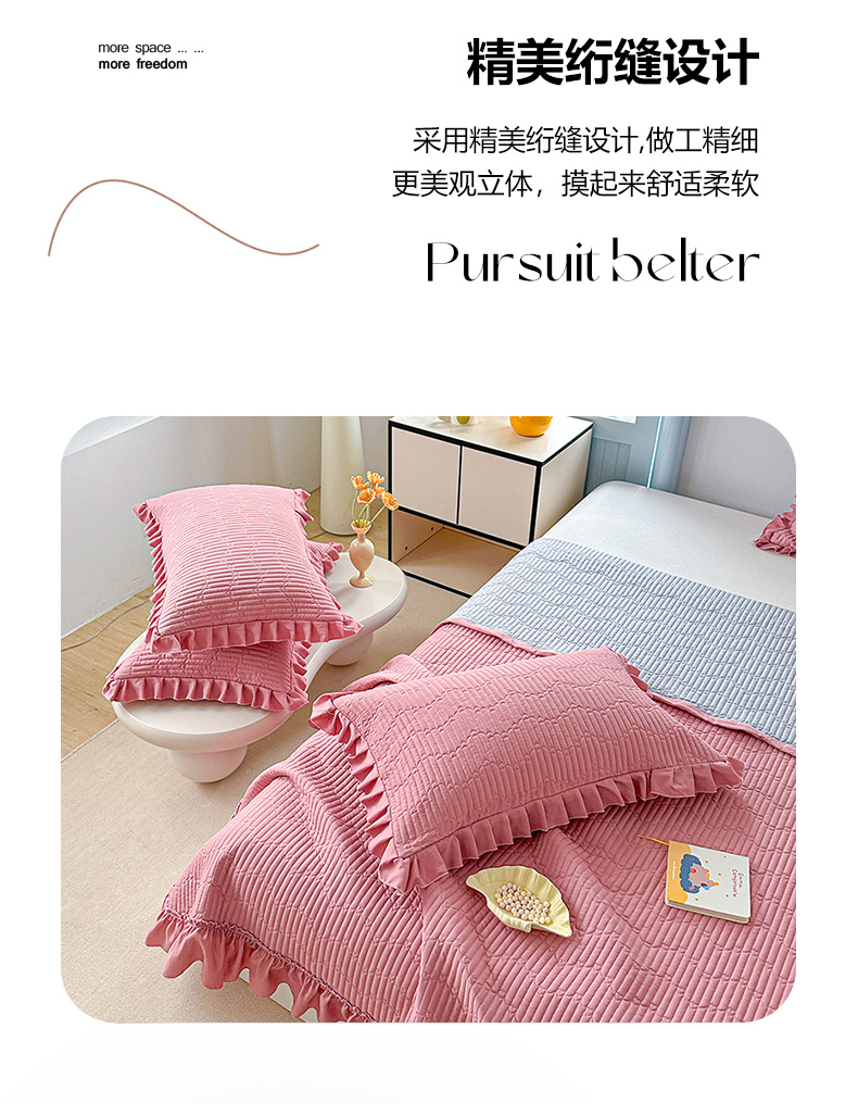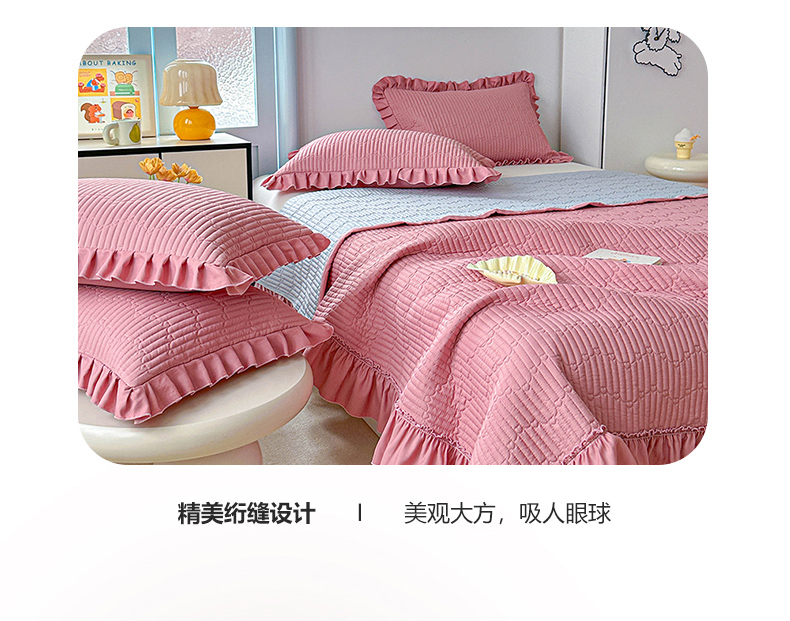 (总)源舜家纺 2025新款色织棉简约韩系花边床盖三件套,简约灰,简约粉,简约绿,简约驼,简约蓝