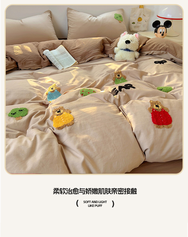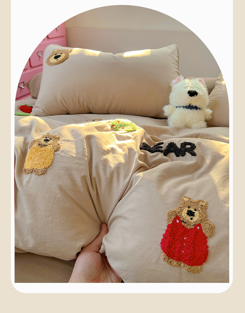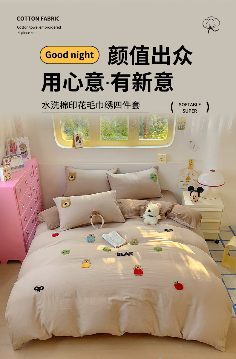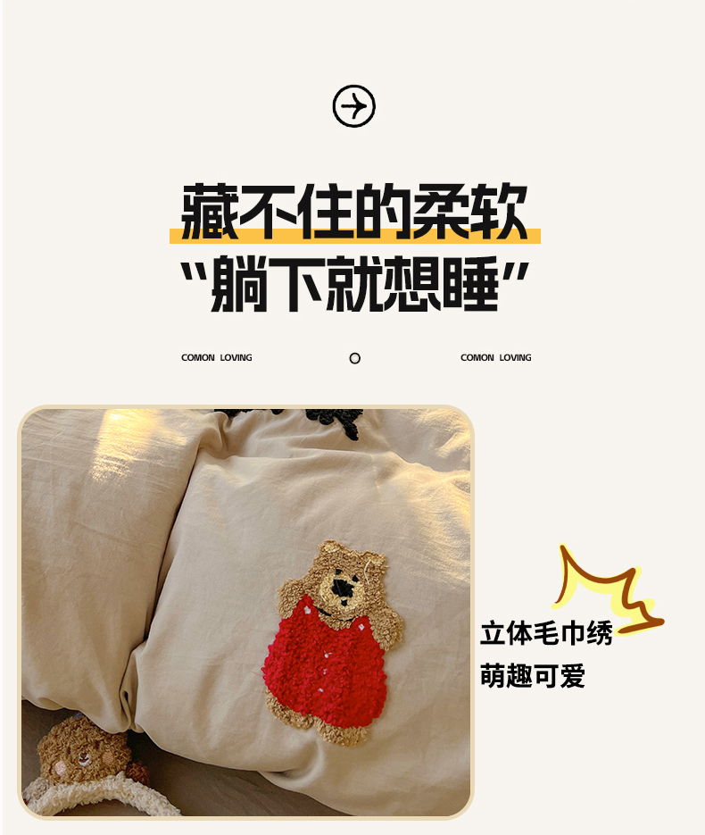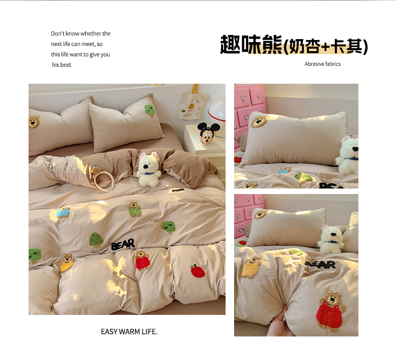 当前位置: 91家纺网 > 商品网购 > 床品套件 > 四件套 > 化纤普通四件套 > 易辰美 2025新款超柔水洗棉毛巾绣四件套 趣味熊(奶杏+卡其)