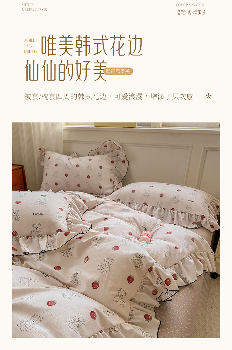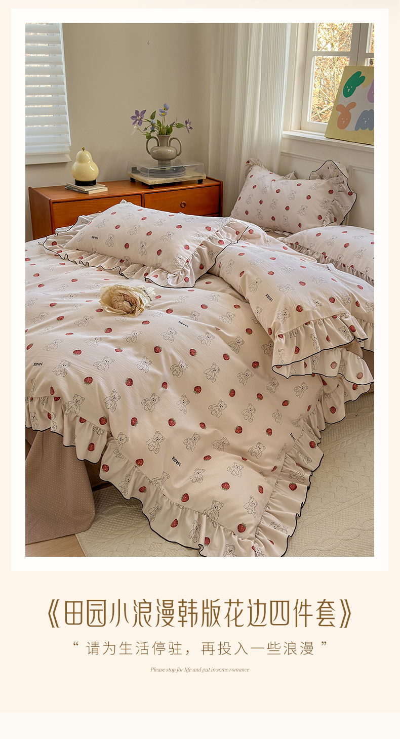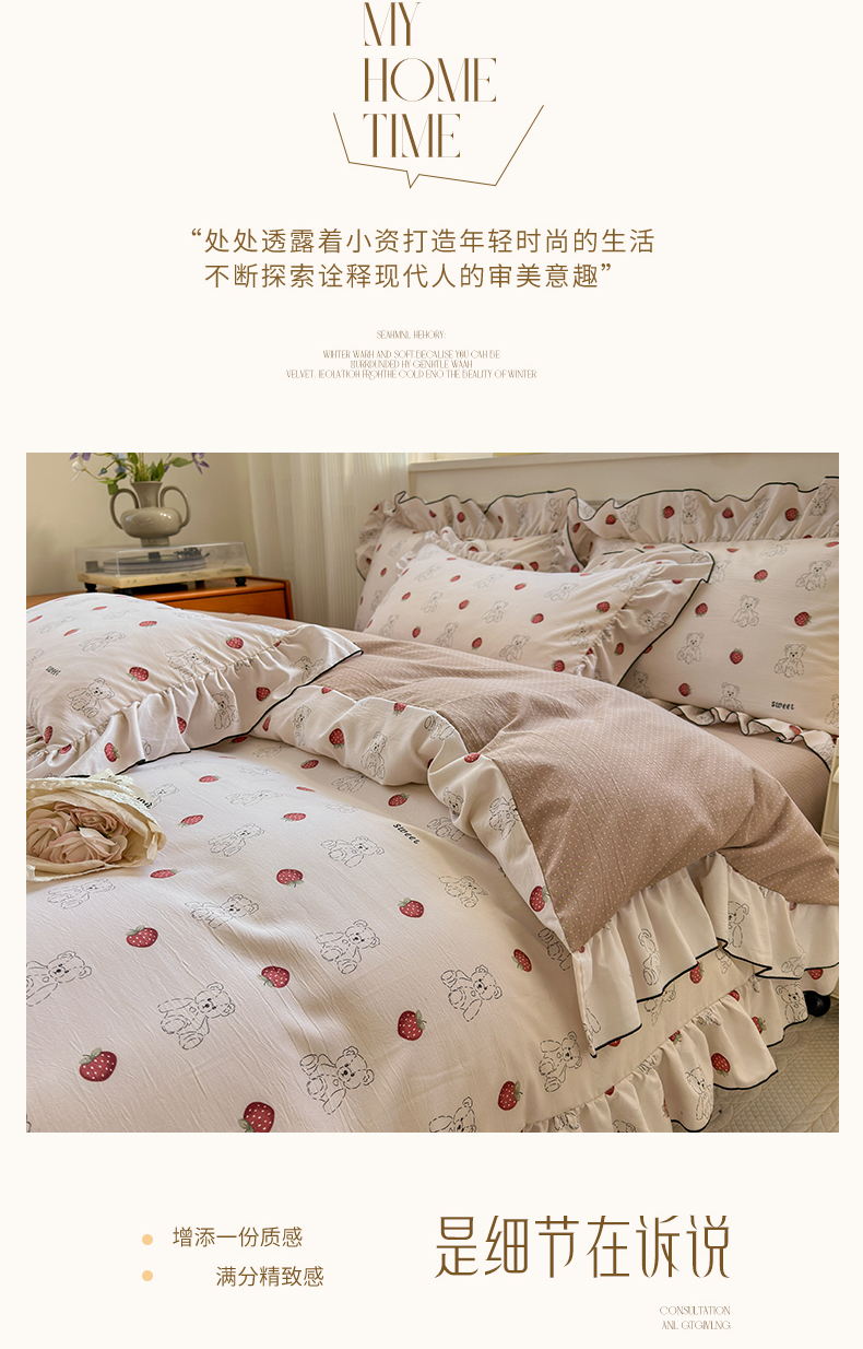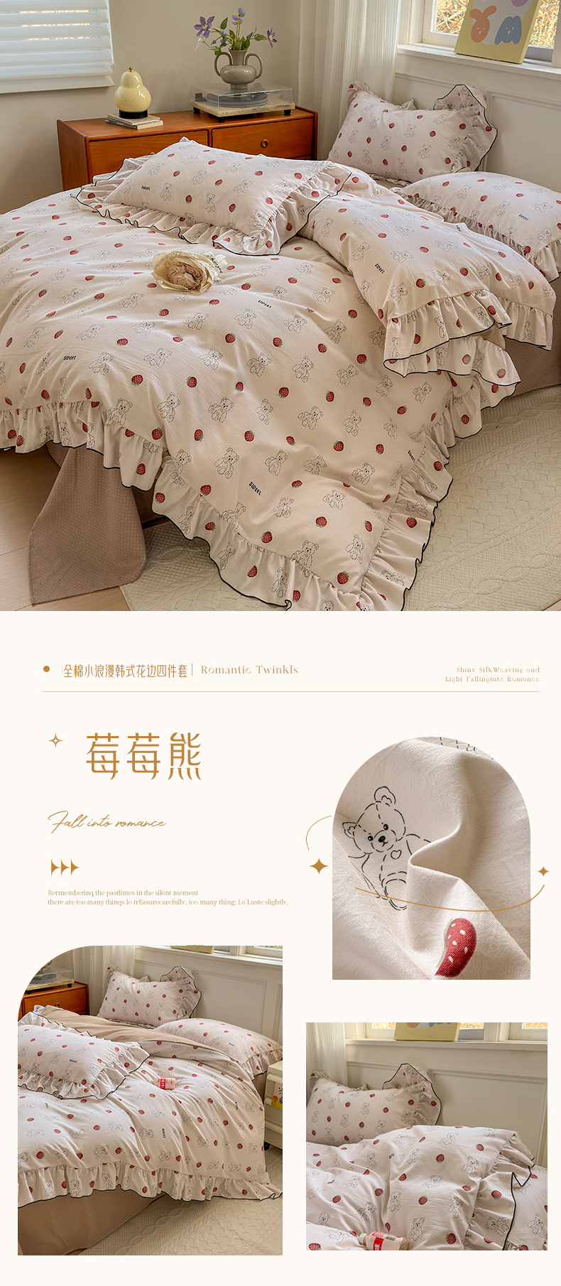 当前位置: 91家纺网 > 商品网购 > 床品套件 > 四件套 > 其它四件套 > 寐居家纺 2025新款韩版舒柔绵四件套 花边款-莓莓熊