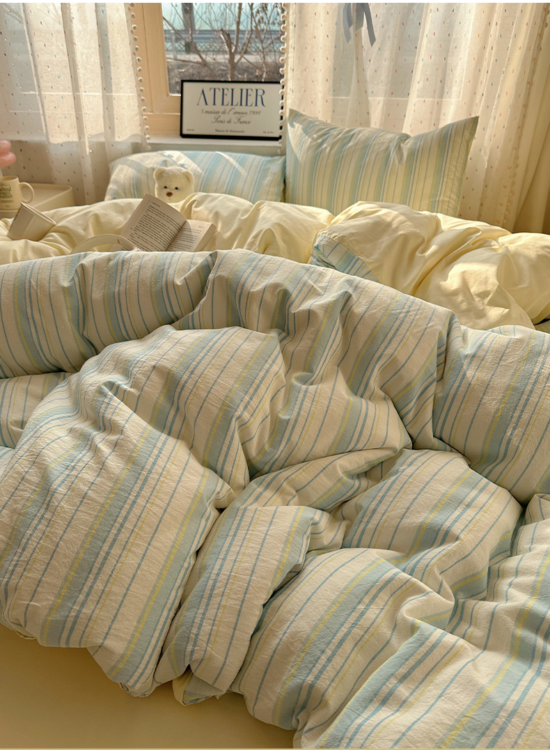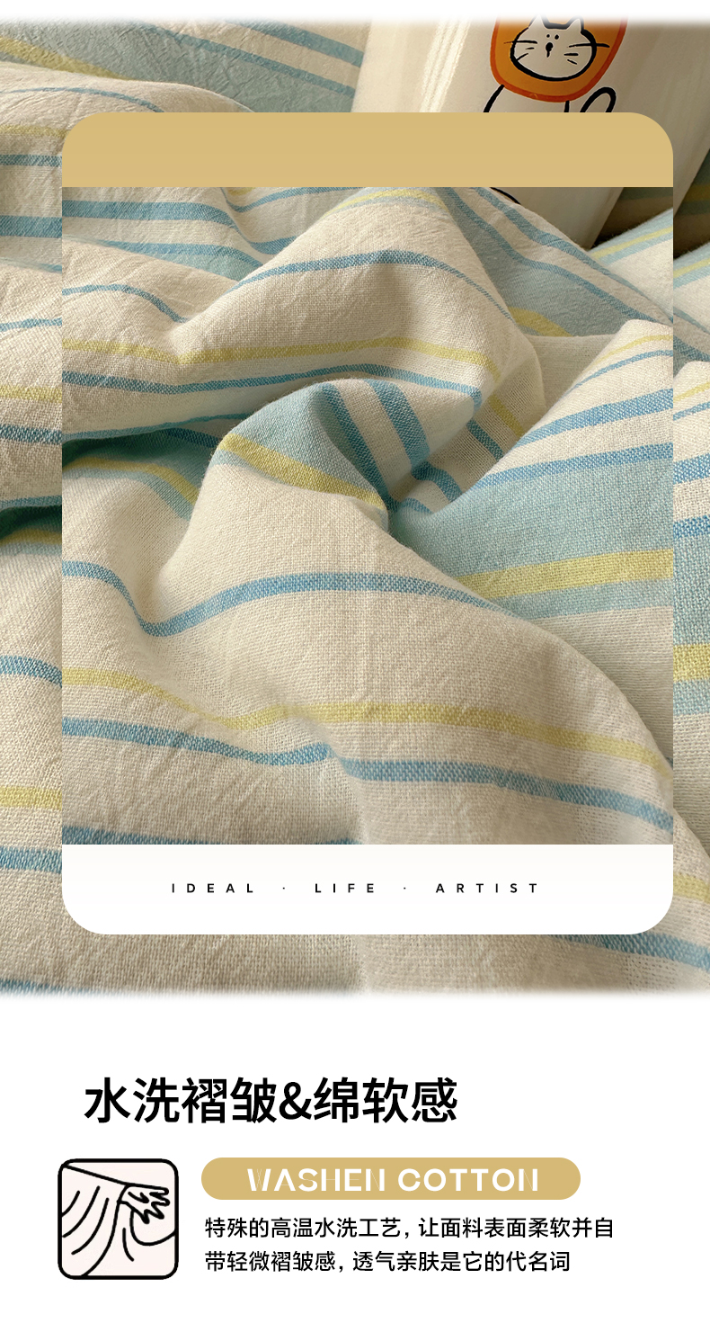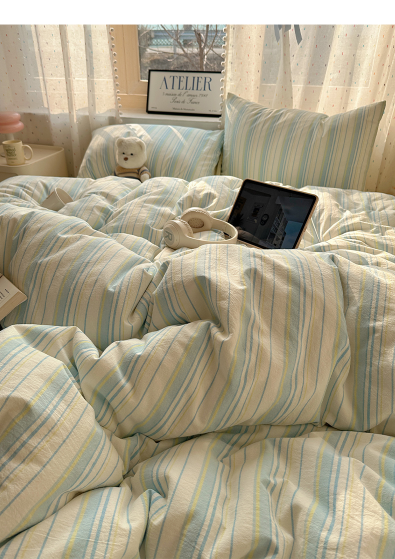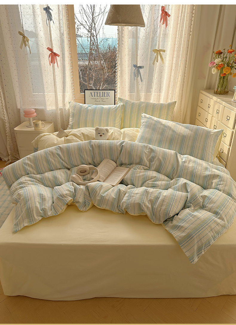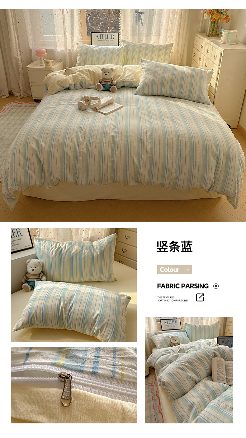 当前位置: 91家纺网 > 商品网购 > 床品套件 > 四件套 > 全棉普通四件套 > 雅居纺家纺 2025全棉色织水洗棉四件套 竖条蓝