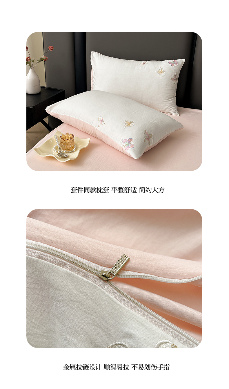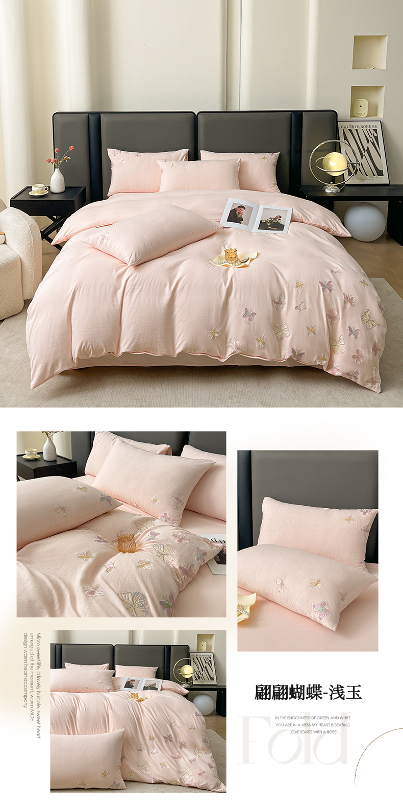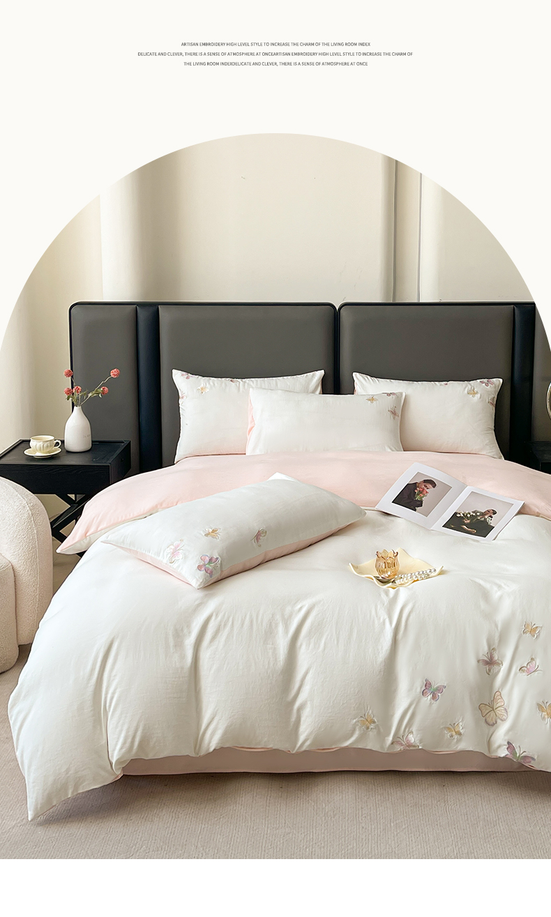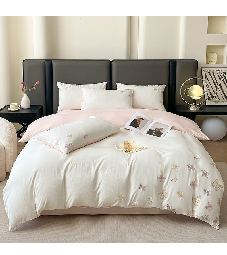 逸尚阁 2025新款水洗磨毛刺绣四件套--七彩蝴蝶系列(提供买家秀) 七彩蝴蝶-白粉色