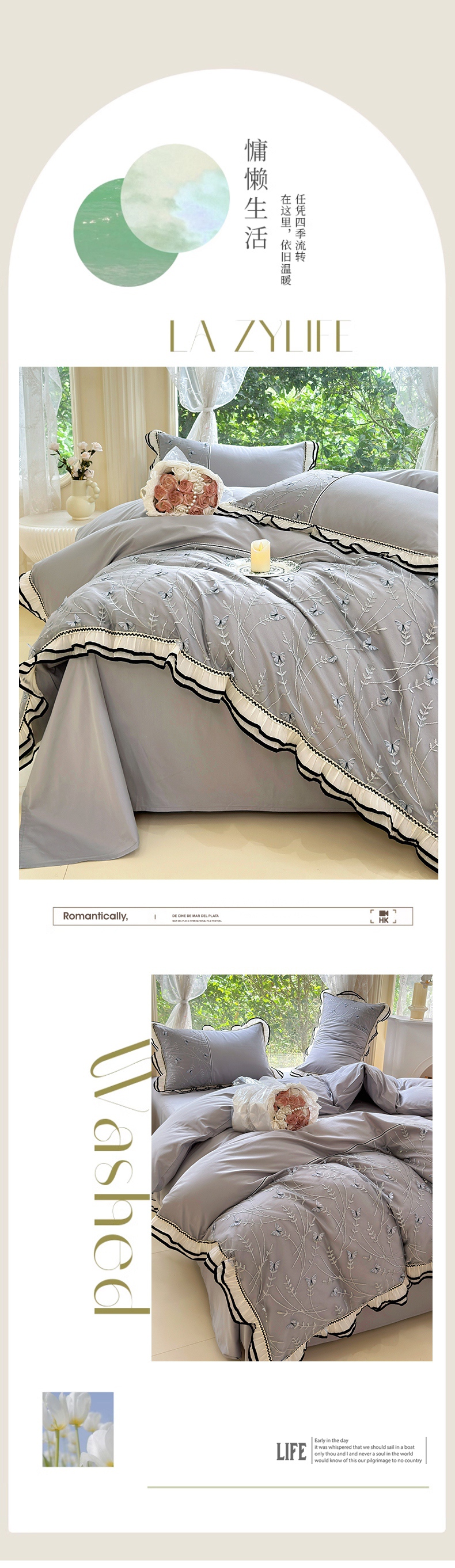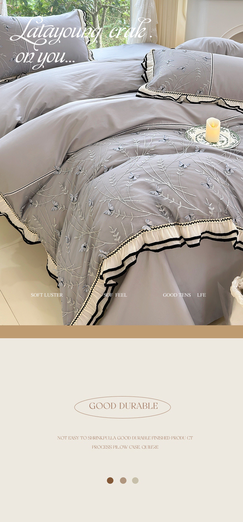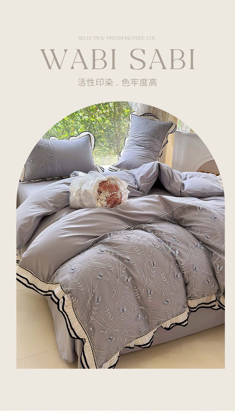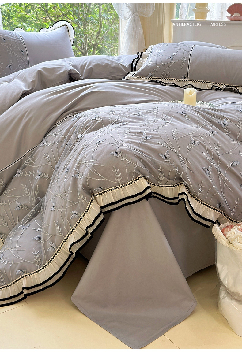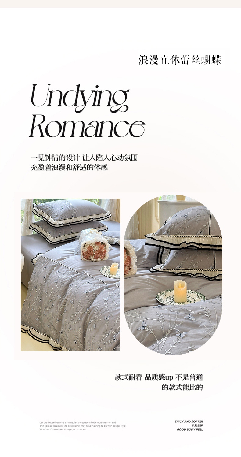 商品名称:TT.one 塔塔家居 2025新款全棉法式立体蝴蝶花边四件套--蝶语清风系列 蝶语清风-灰