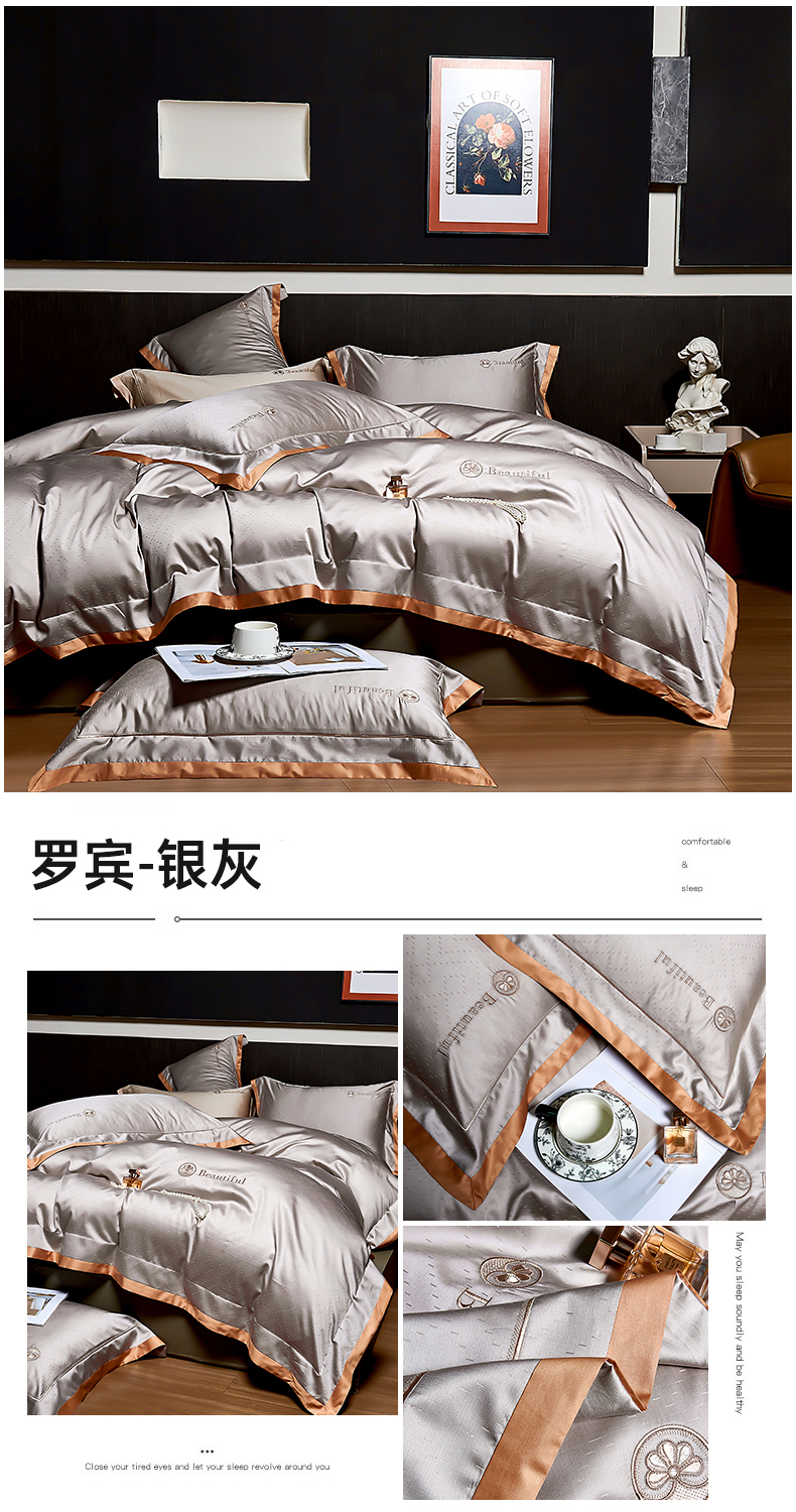 U品汇 2025新款60支双股120s天丝棉提花莱赛尔纤维刺绣花四件套纯棉全棉凉感丝滑(罗宾) 罗宾-银灰