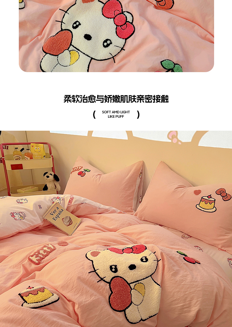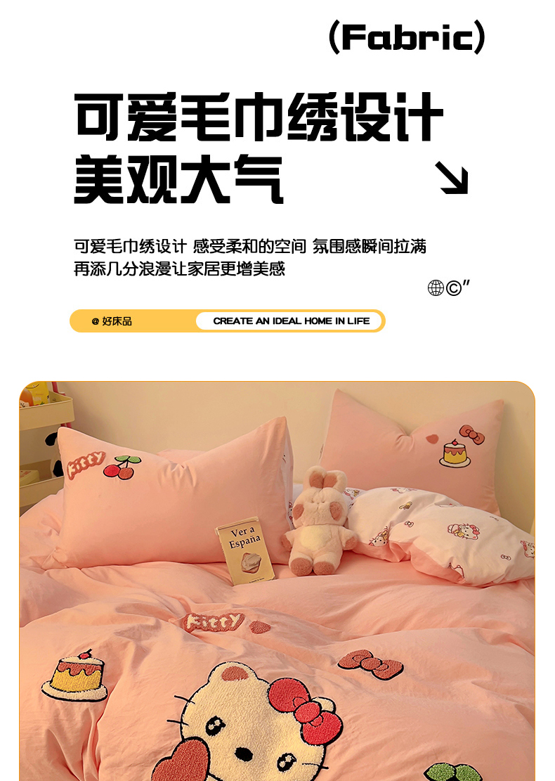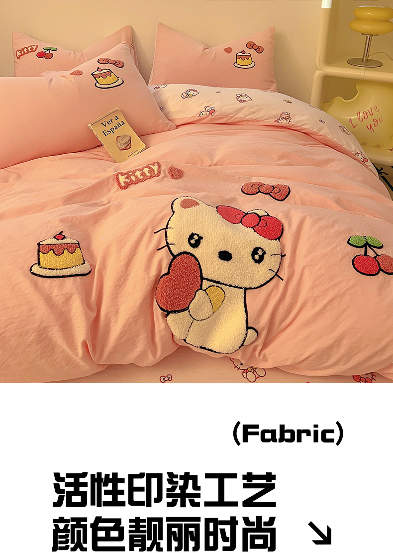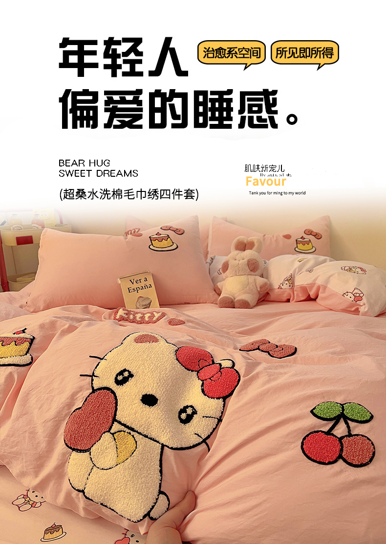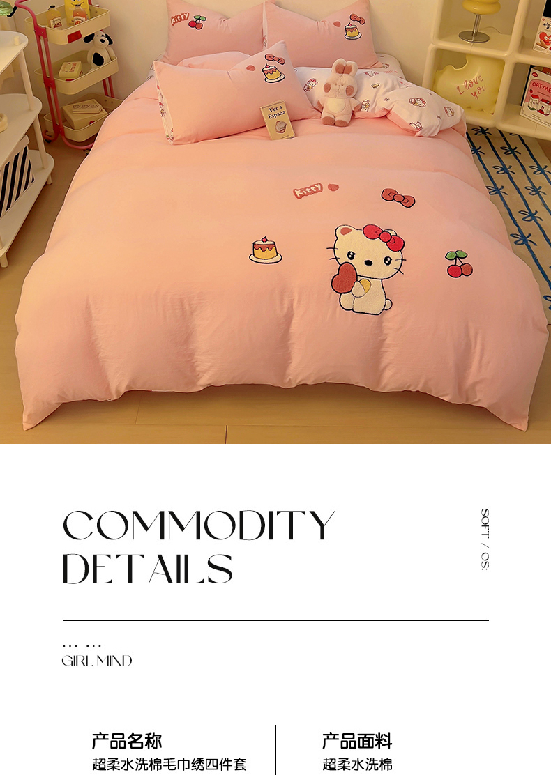 当前位置: 91家纺网 > 商品网购 > 床品套件 > 四件套 > 毛巾绣四件套 > 易辰美家纺2025新款超柔水洗棉印花毛巾绣四件套 Kitty猫