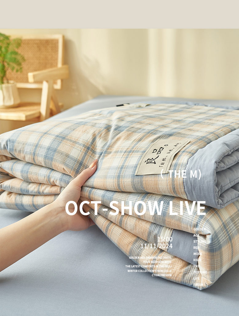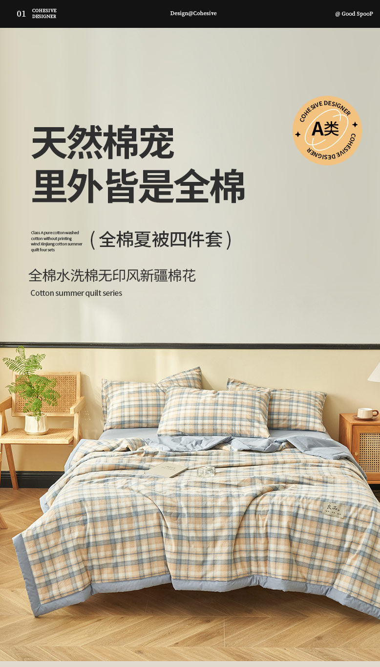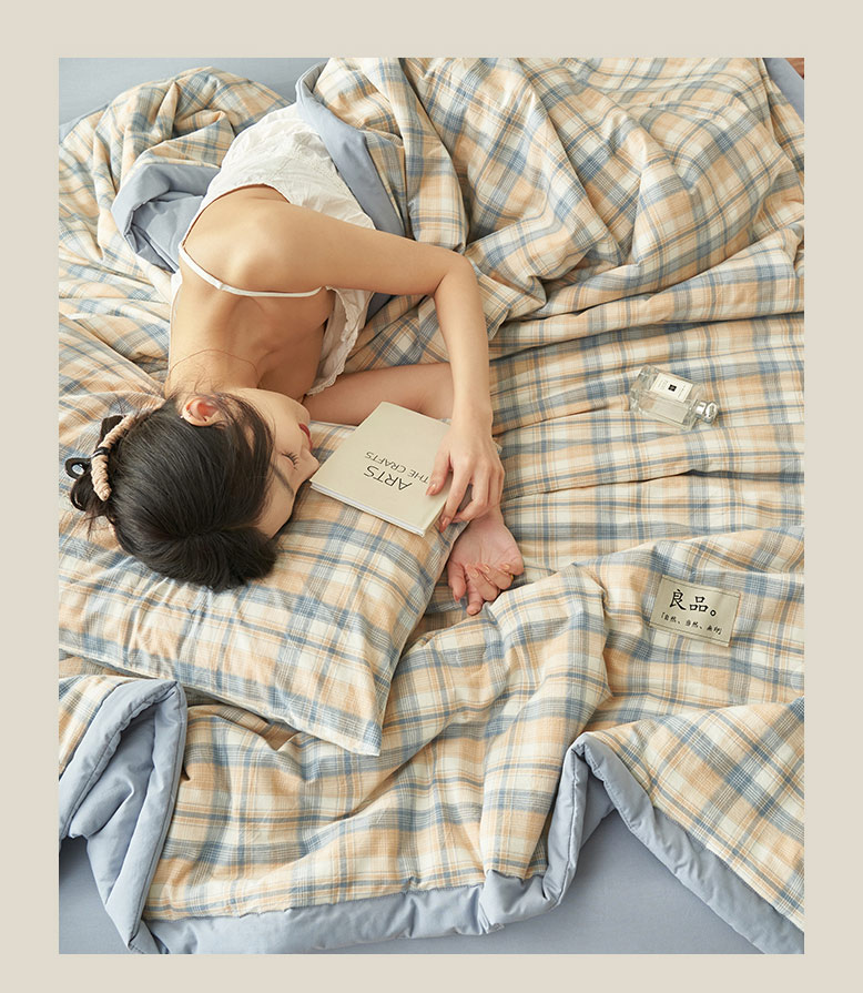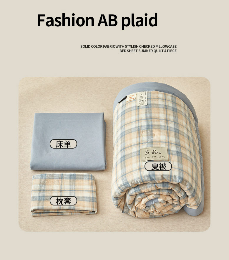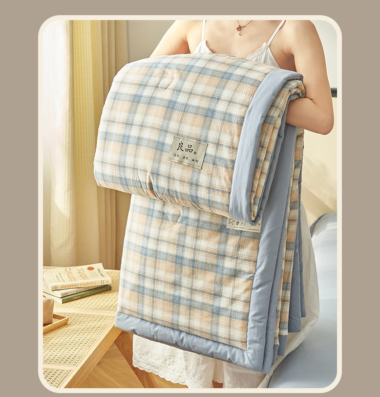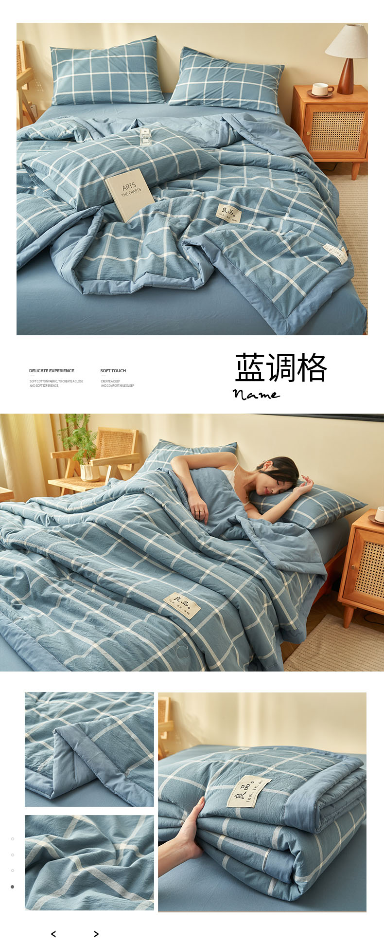 • 91家纺网 家纺一手货源 找家纺 寐绸家纺 2025新款纯棉水洗棉无印风新疆棉花夏被四件套 炫彩蓝格