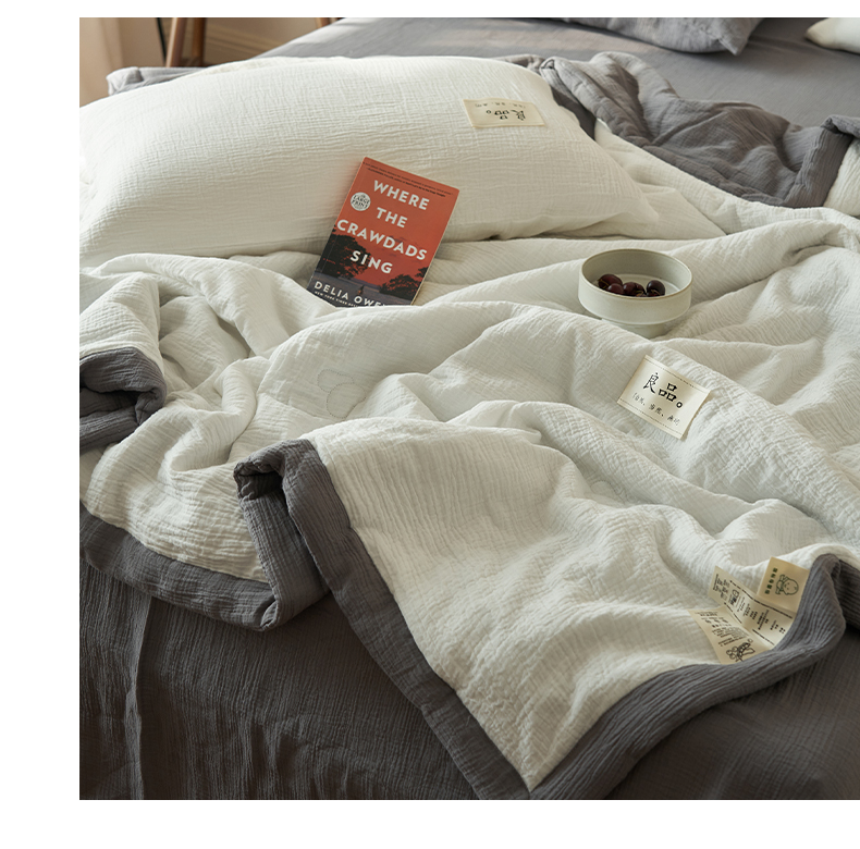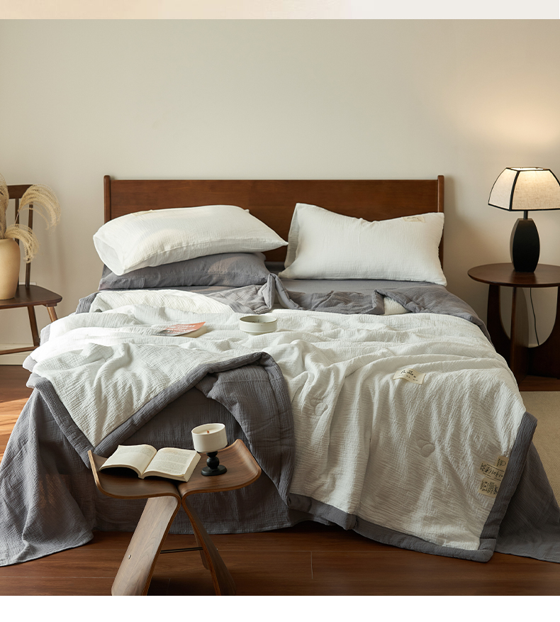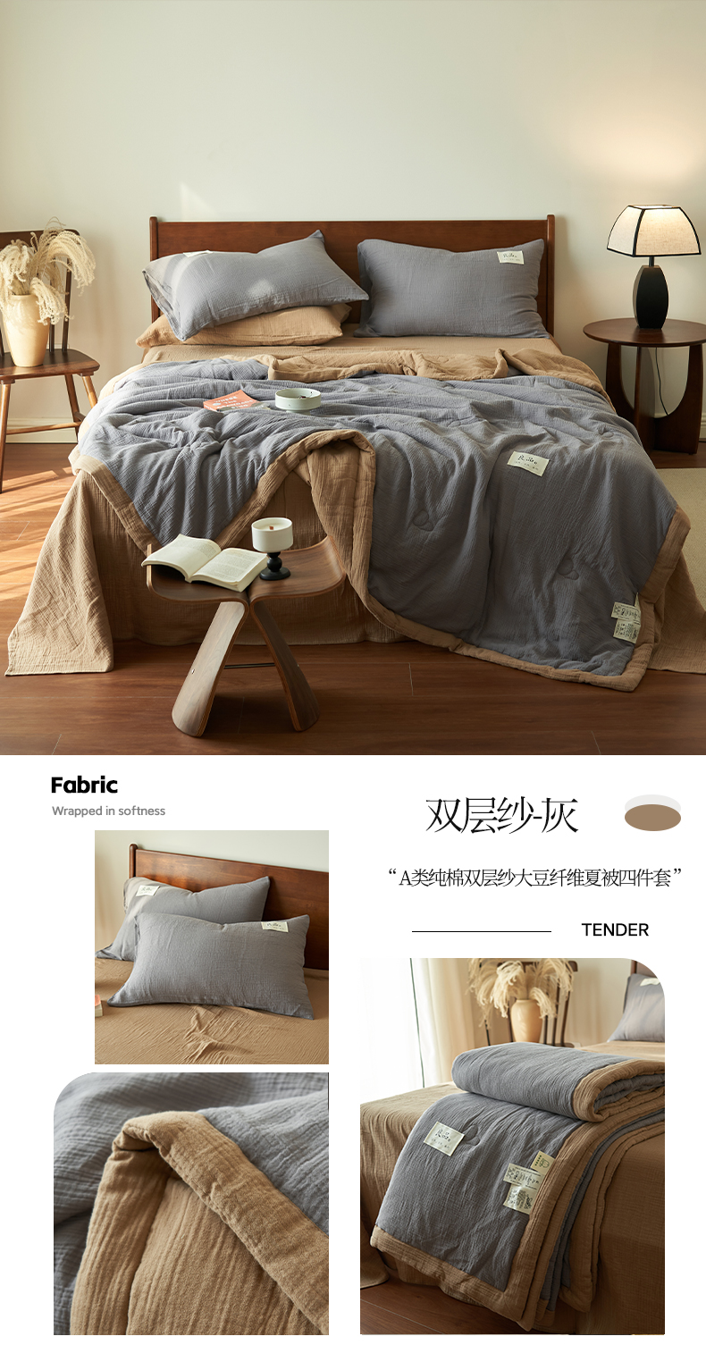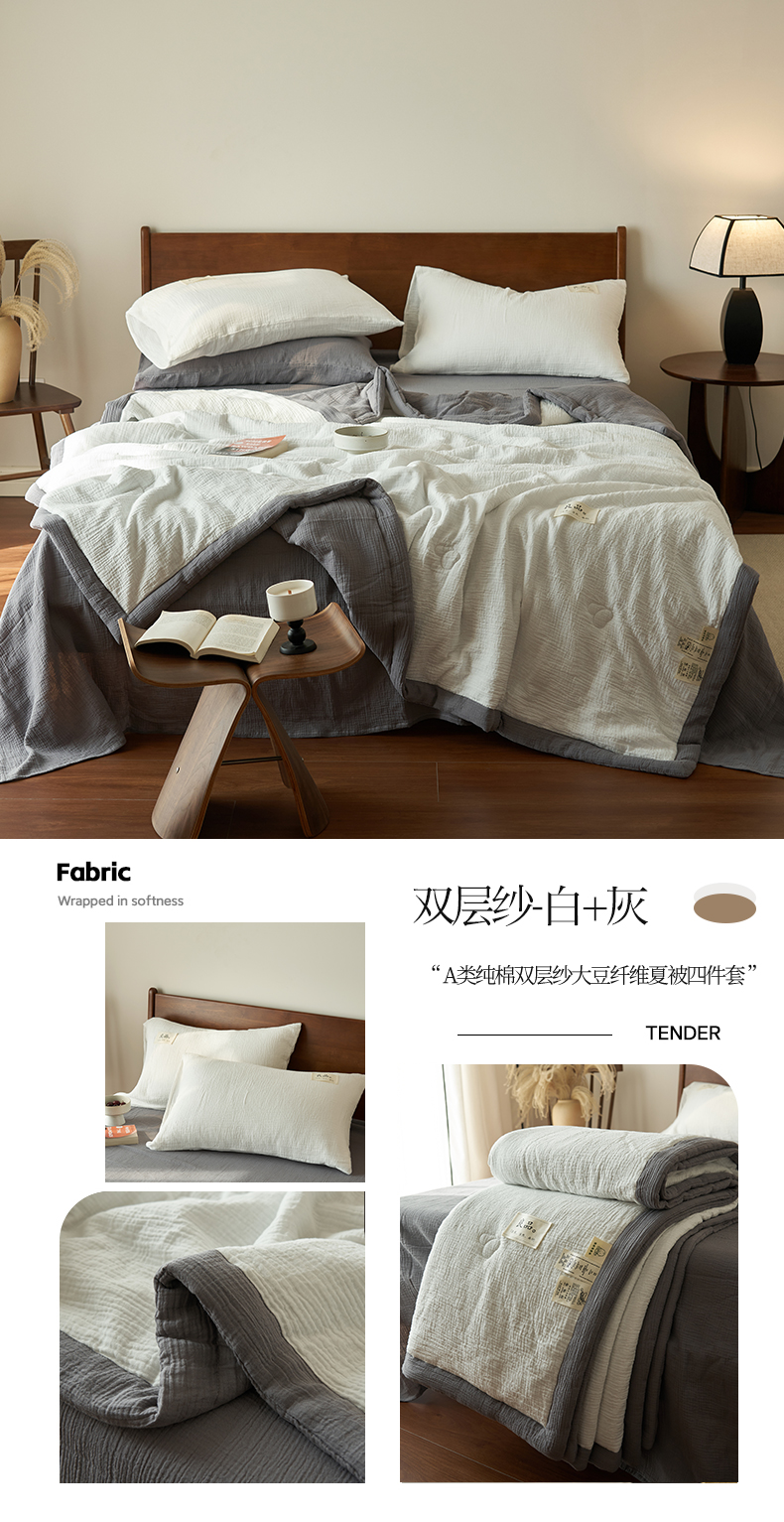 • 91家纺网 家纺一手货源 找家纺 寐绸家纺 2025新款纯棉双层纱大豆纤维夏被四件套 双层纱-白+灰