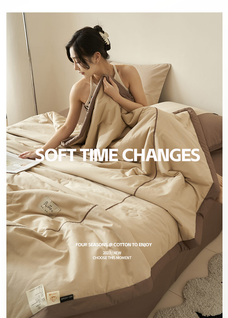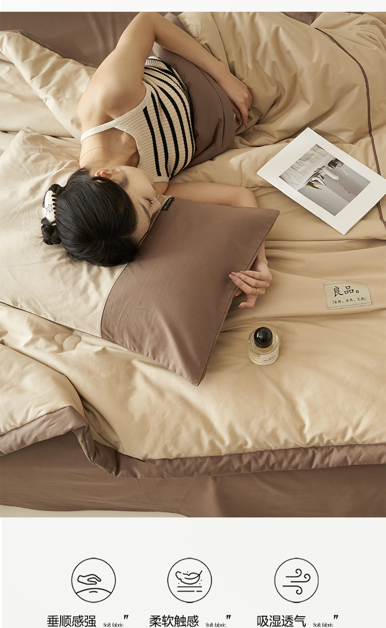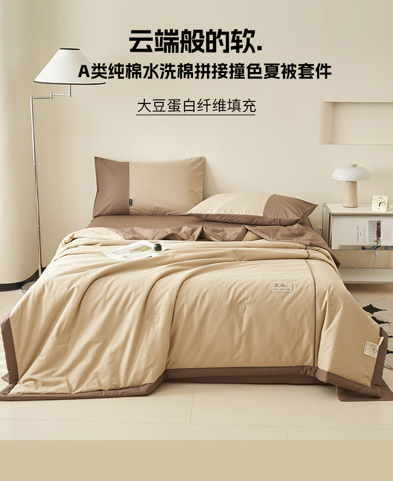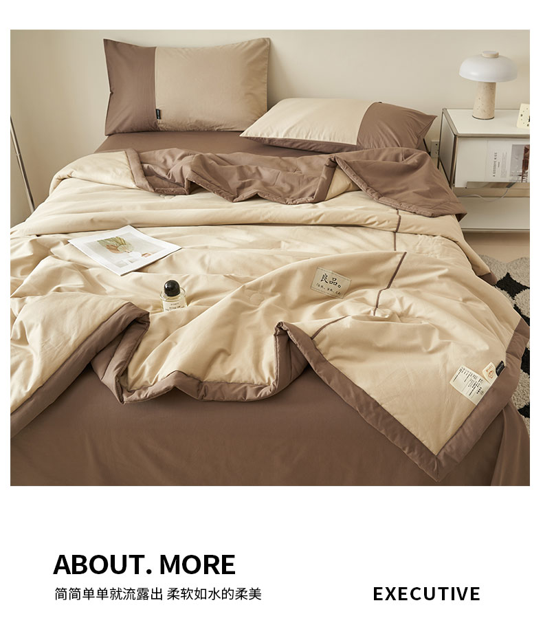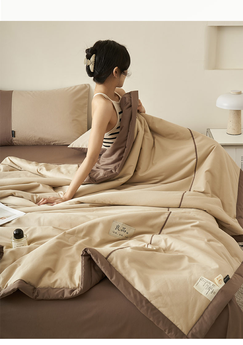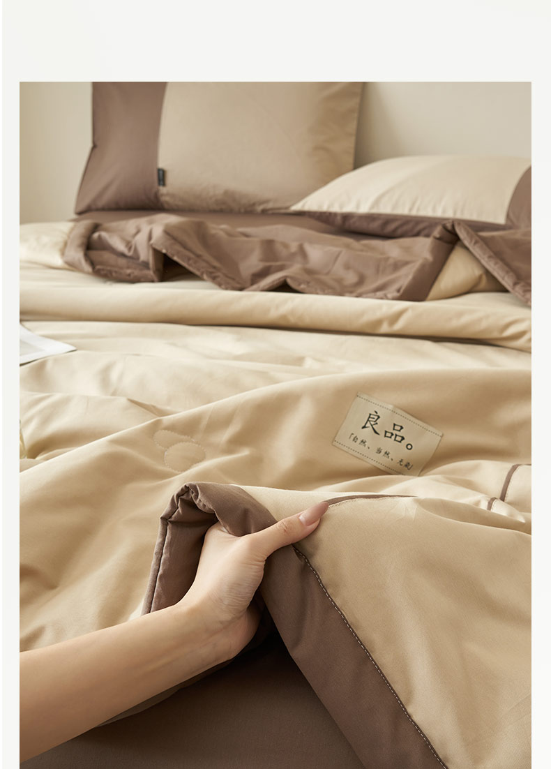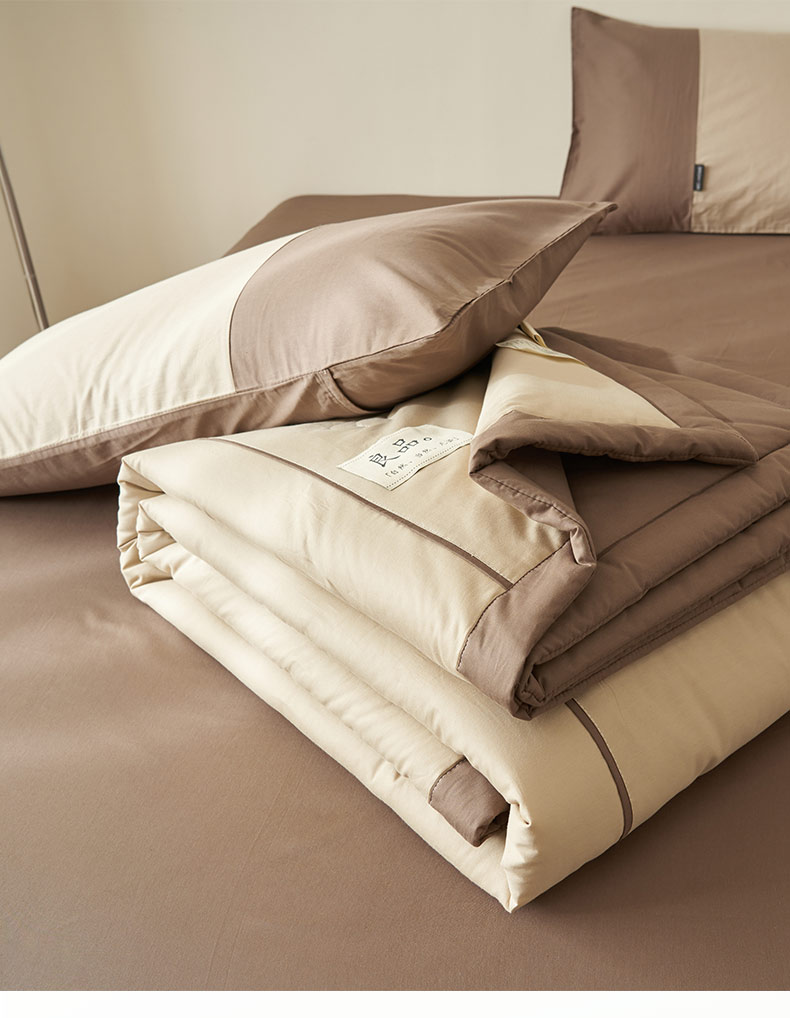 • 91家纺网 家纺一手货源 找家纺 寐绸家纺 2025新款纯棉水洗北欧拼接撞色大豆纤维夏被四件套 北欧-浅驼