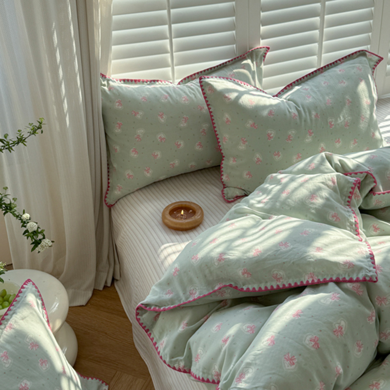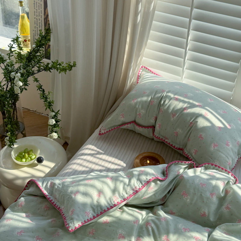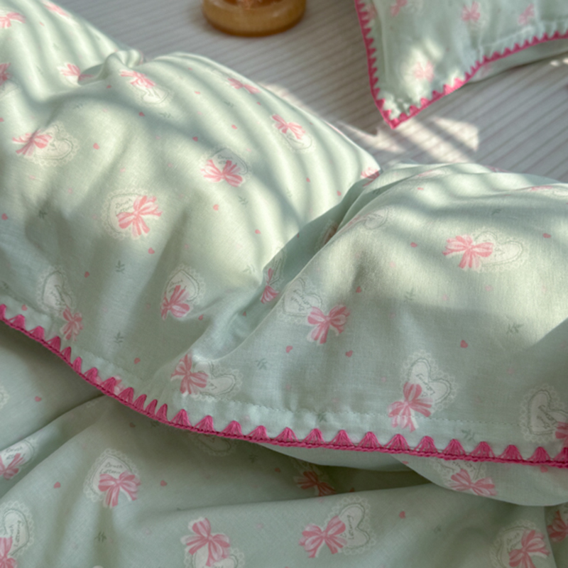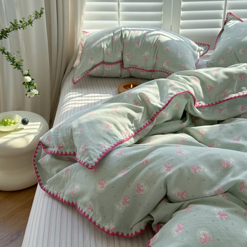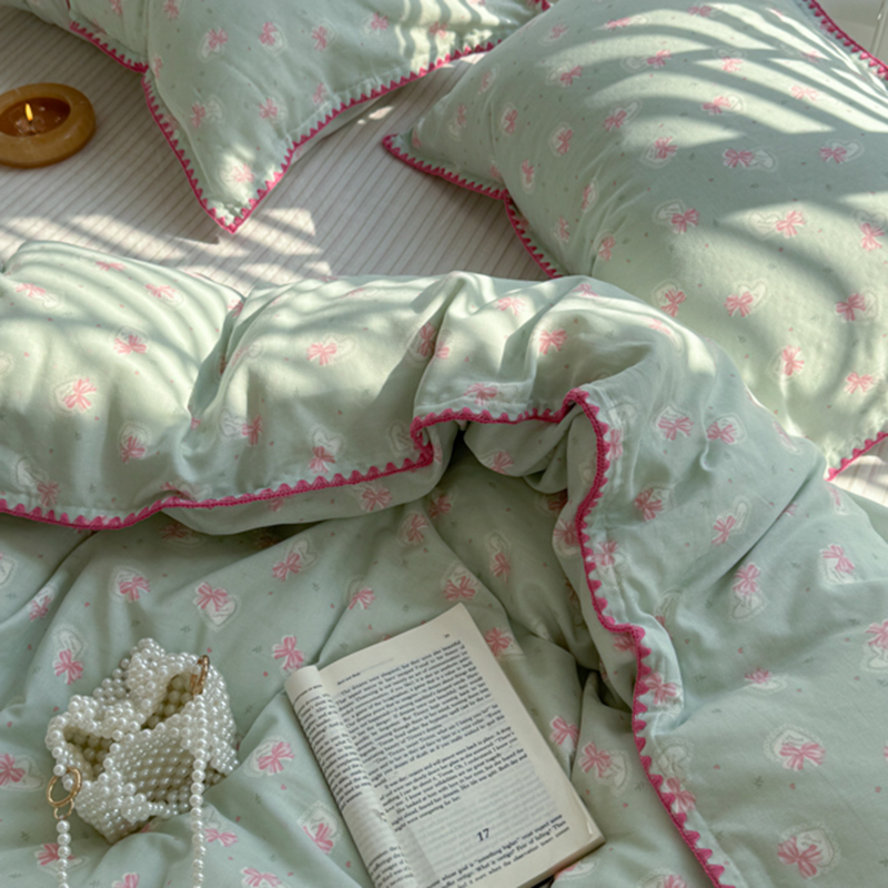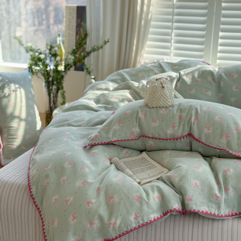 当前位置: 91家纺网 > 商品网购 > 床品套件 > 四件套 > 全棉普通四件套 > 金丝鸟家纺 2025新款全棉双层纱贝壳边四件套花卉系列 绿色蝴蝶结