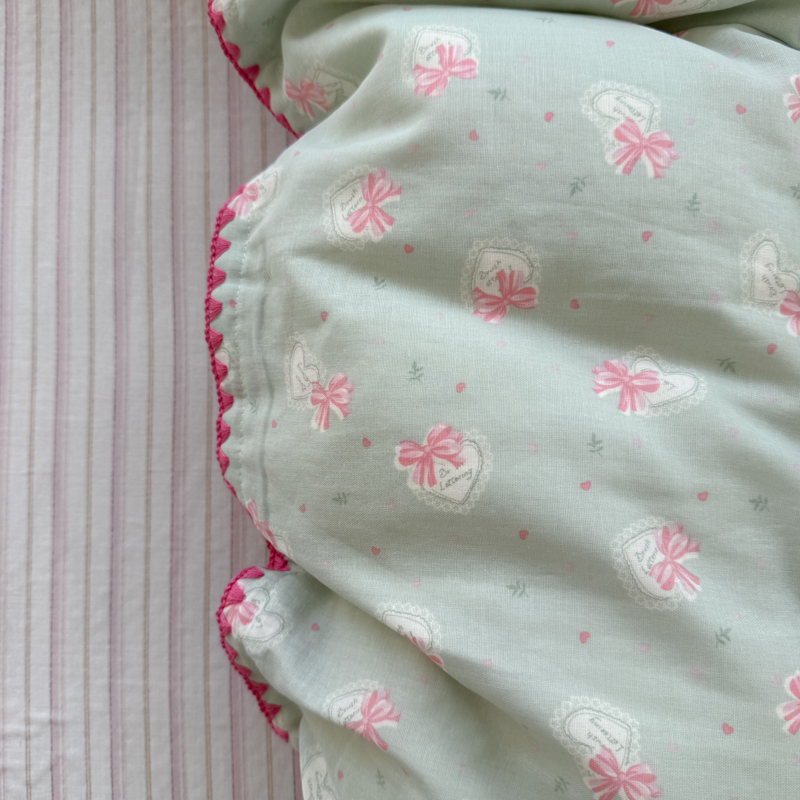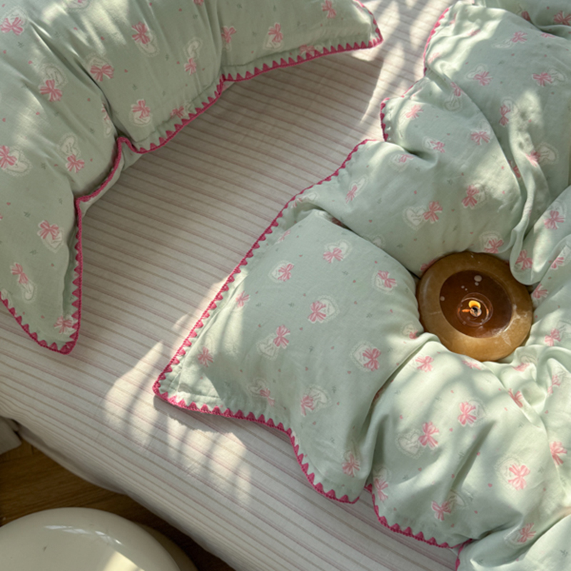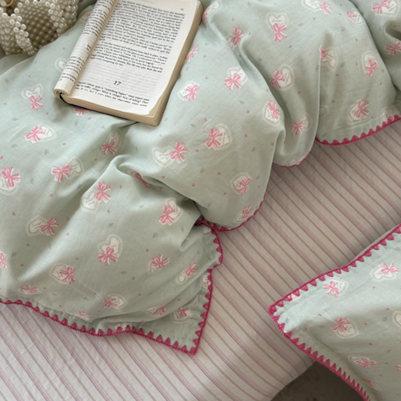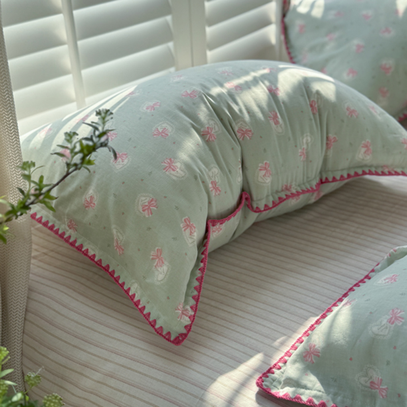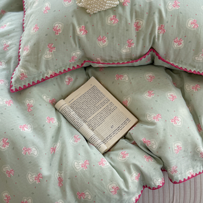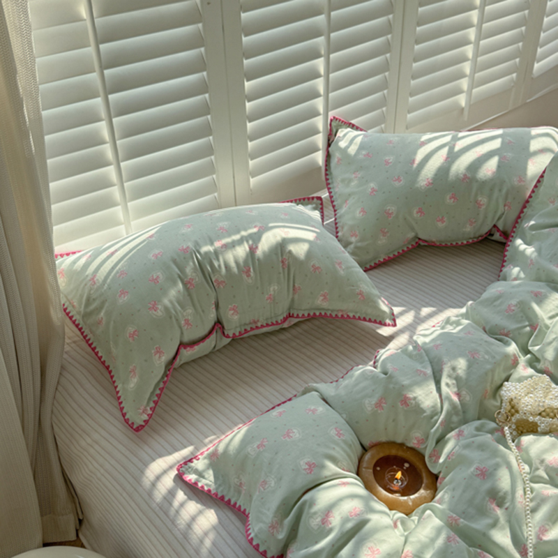 当前位置: 91家纺网 > 商品网购 > 床品套件 > 四件套 > 全棉普通四件套 > 金丝鸟家纺 2025新款全棉双层纱贝壳边四件套花卉系列 绿色蝴蝶结