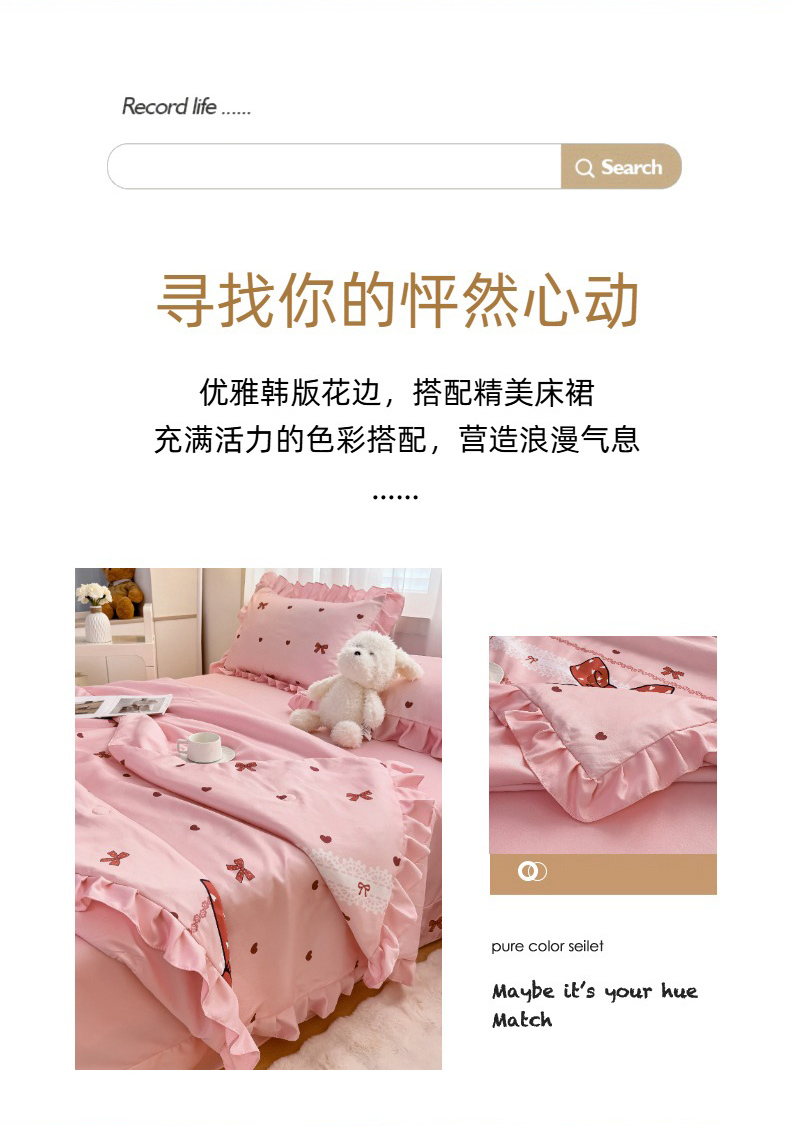 (总)找底底家纺 2022新款水晶绒蕾丝花边韩版四件套,大红,黛蓝,豆沙色,姜黄,墨绿,浅灰,玉女粉