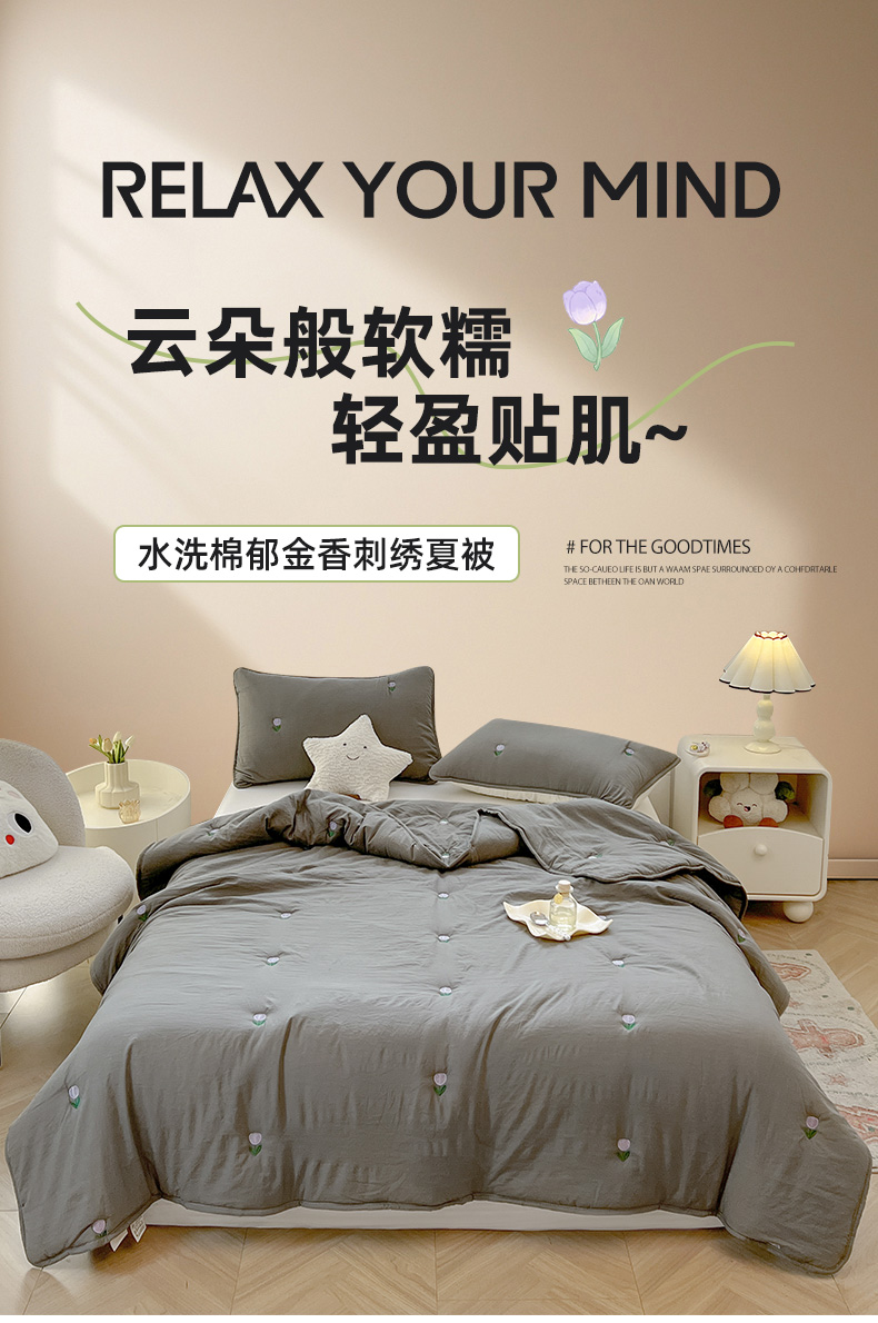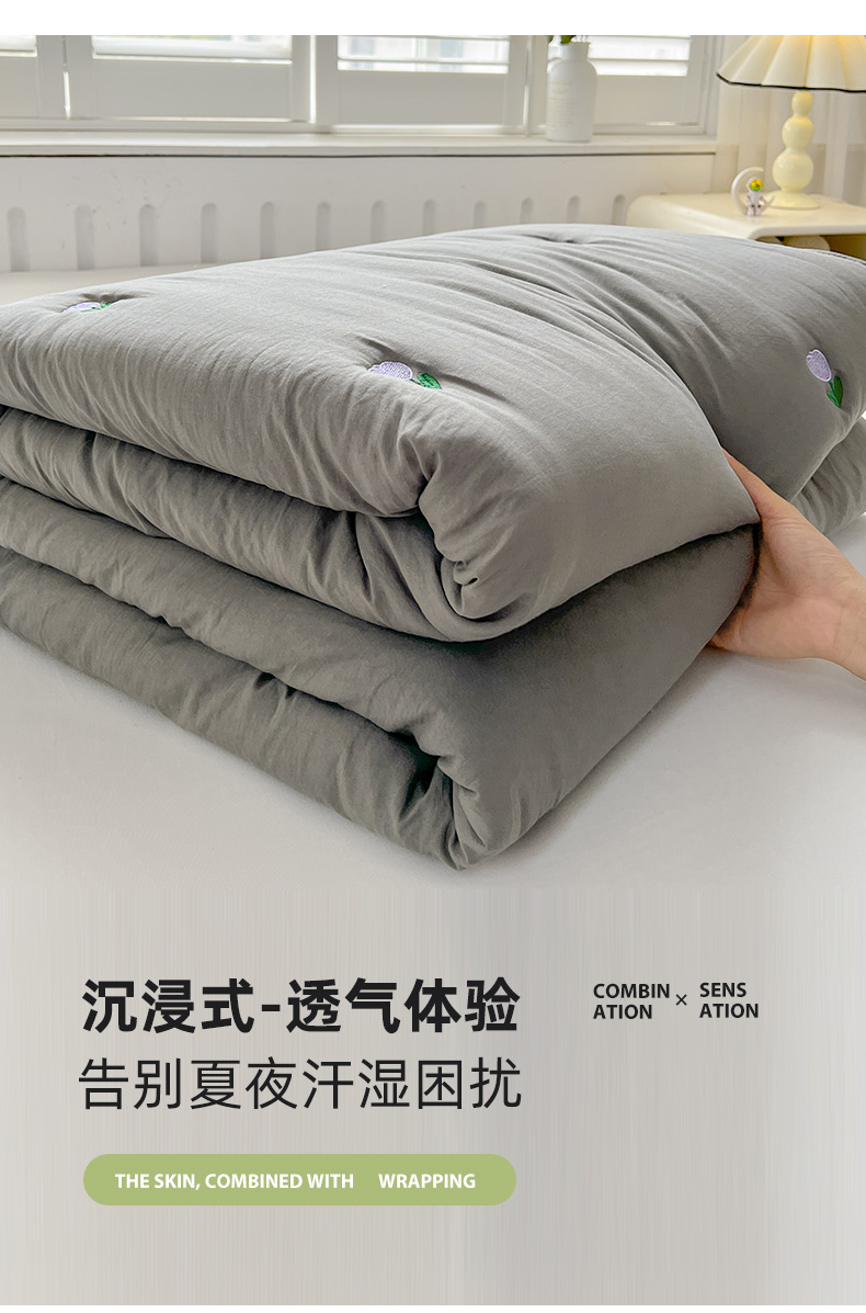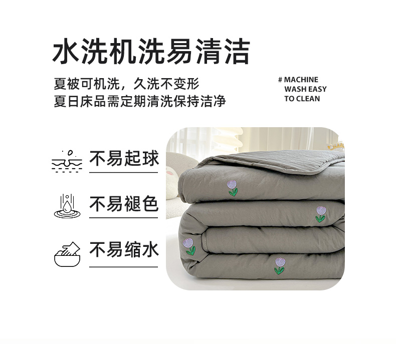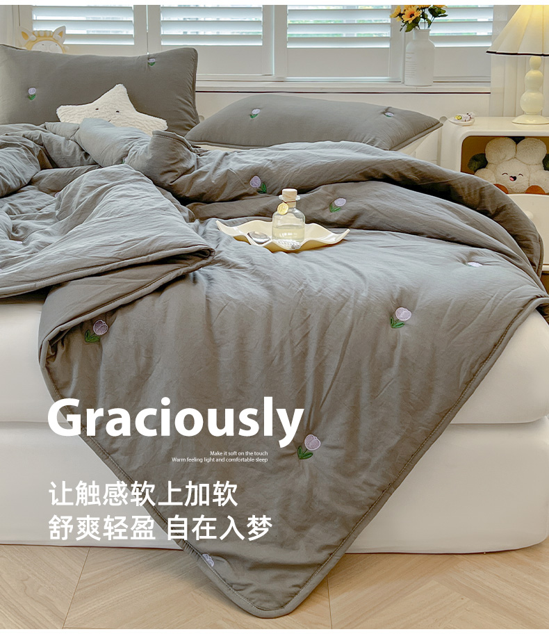 推推家纺 2025新款水洗棉玫瑰刺绣夏被 郁金香-灰色