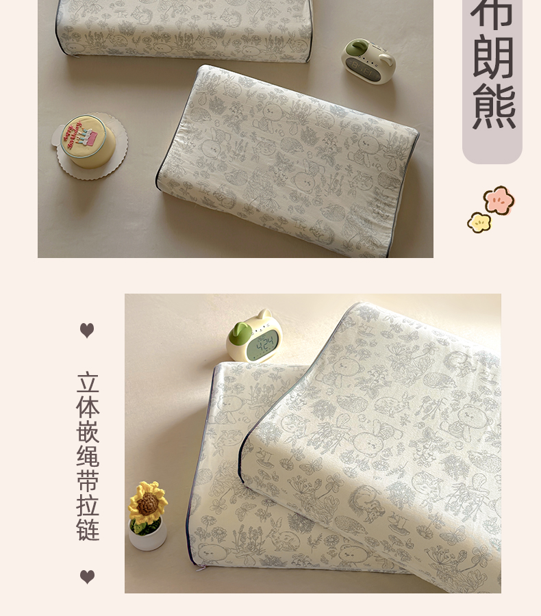 百寐 2025新款13372全棉立体滚边立体记忆枕套30×50/40×60碎花卡通枕套 布朗熊
