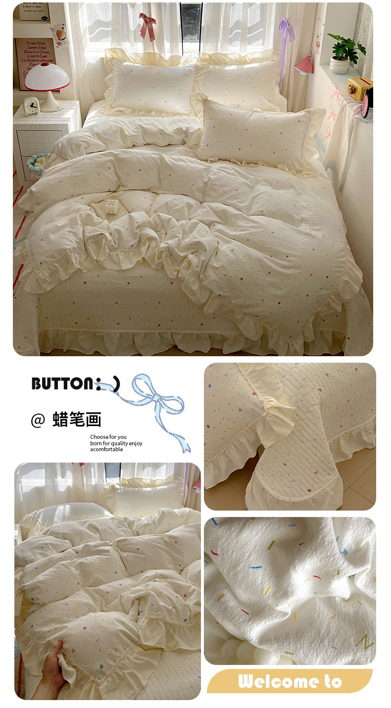 商品名称:美梦家纺2025新款皱皱纱花边被套床盖四件套 蜡笔画