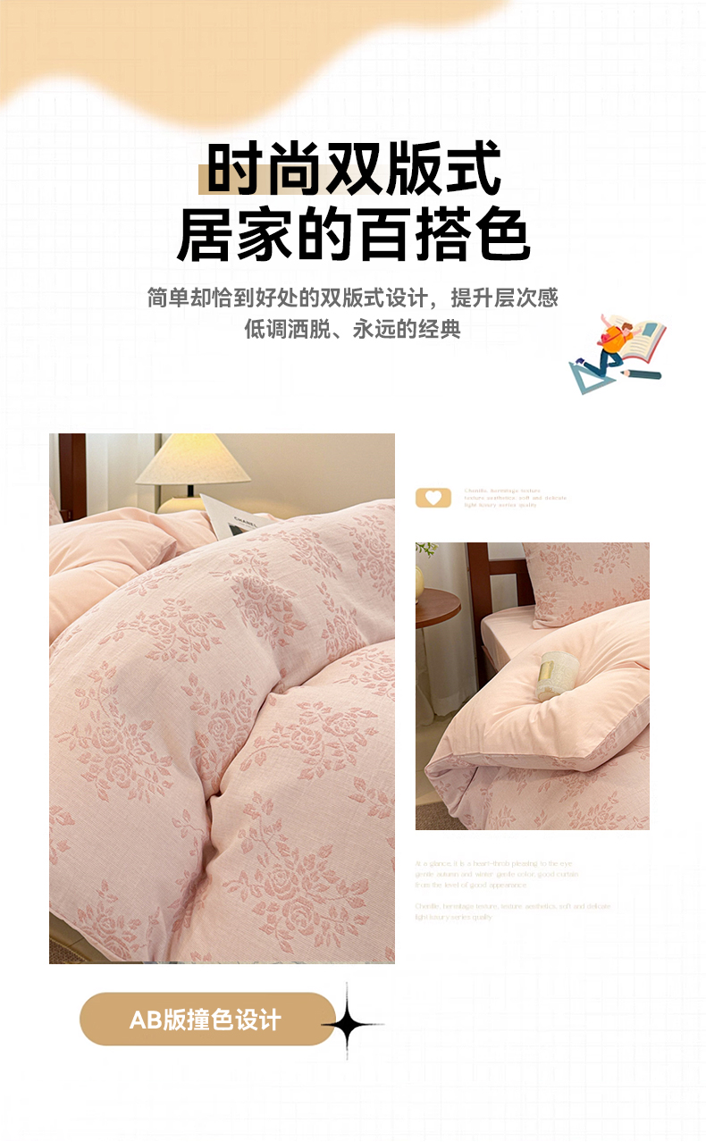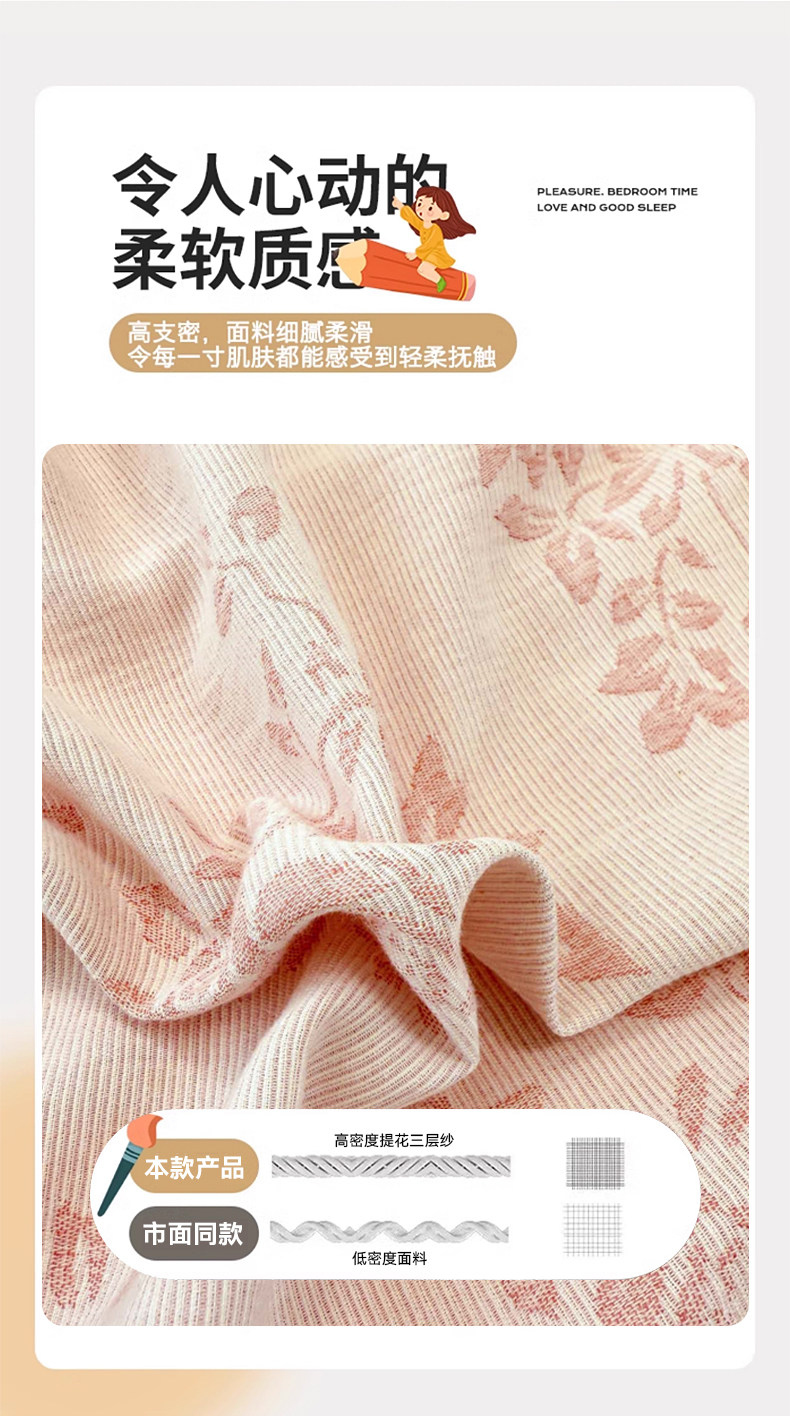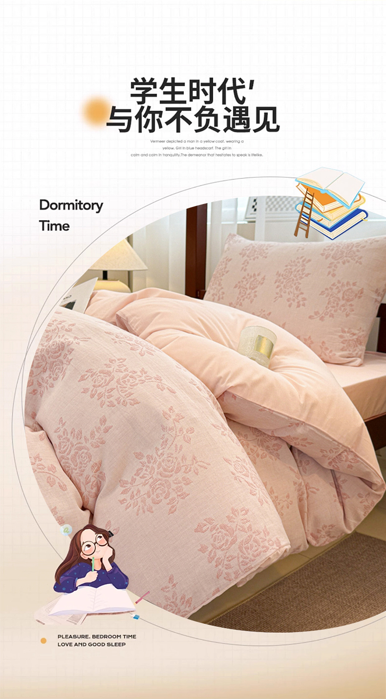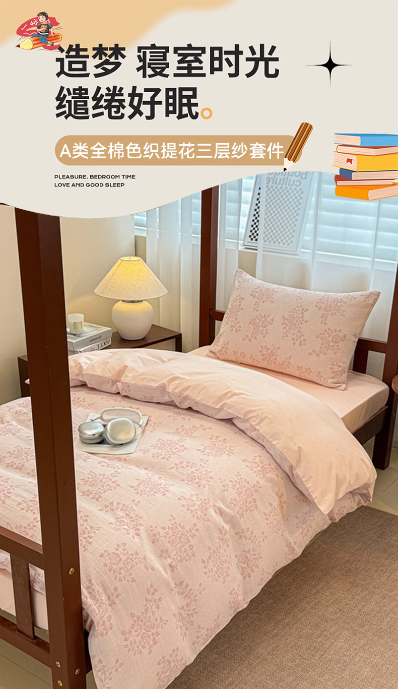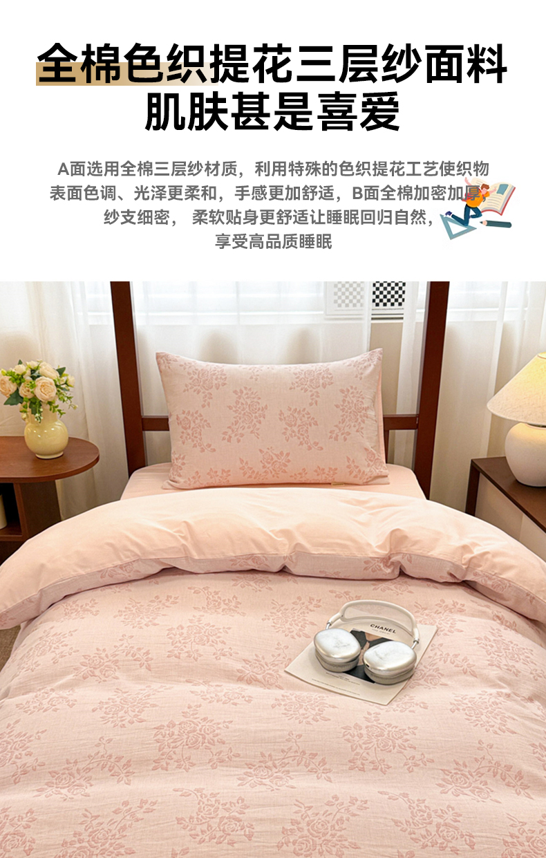 当前位置: 91家纺网 > 商品网购 > 床品套件 > 三件套 > 眠博士 2025新款A类全棉纯棉色织提花三层纱三四件套学生三件套宿舍上下铺 三层纱套件-玫瑰花-粉