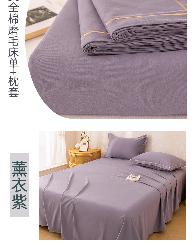 • 91家纺网 家纺一手货源 找家纺 2025新款A类100%全棉纯色加厚磨毛枕套+床单单件/简约组合 磨毛-熏衣紫