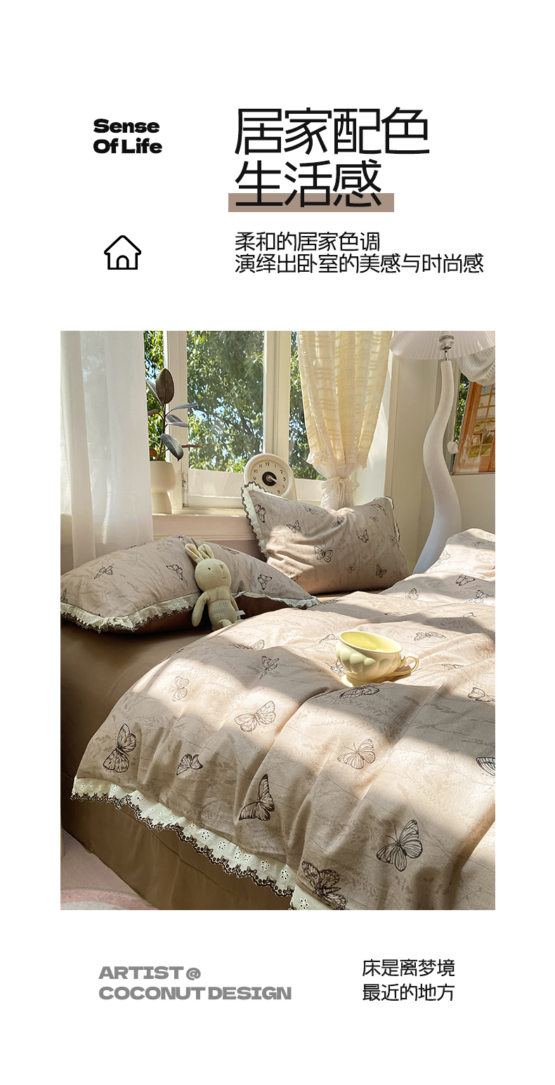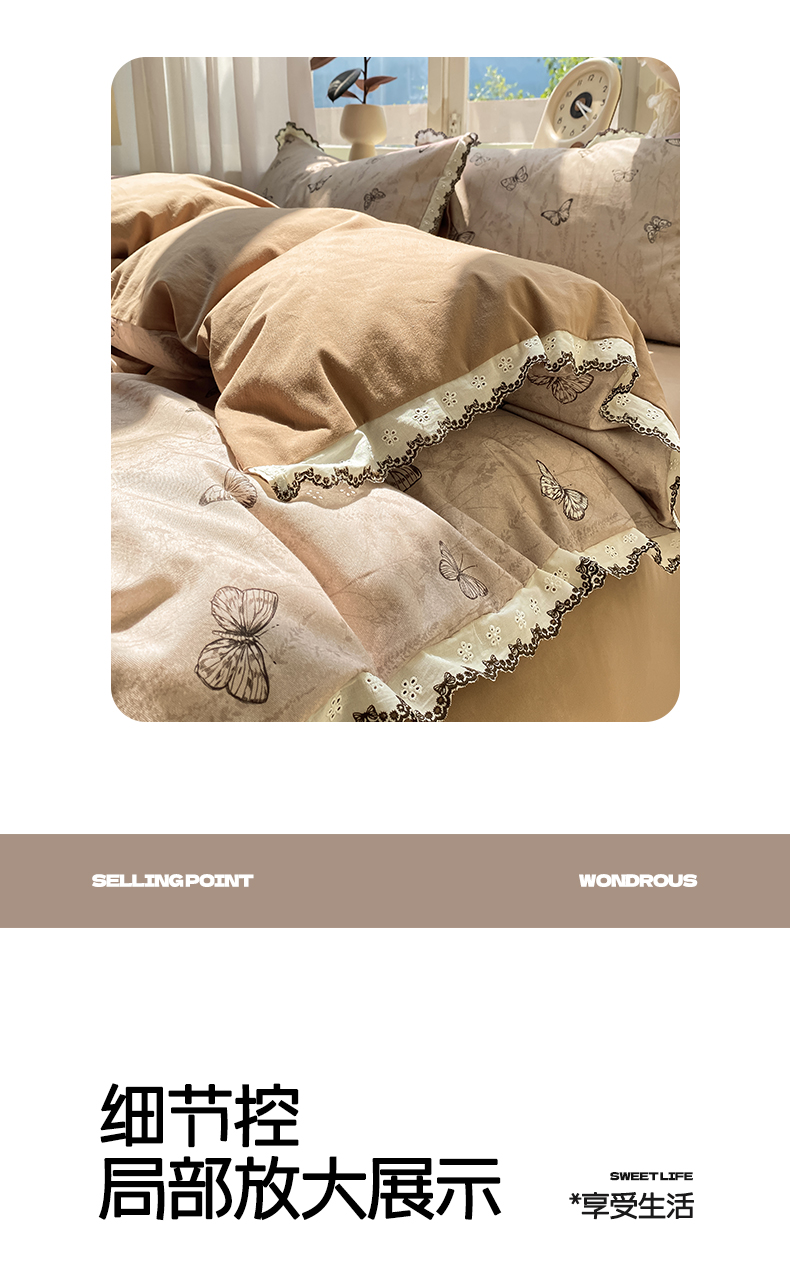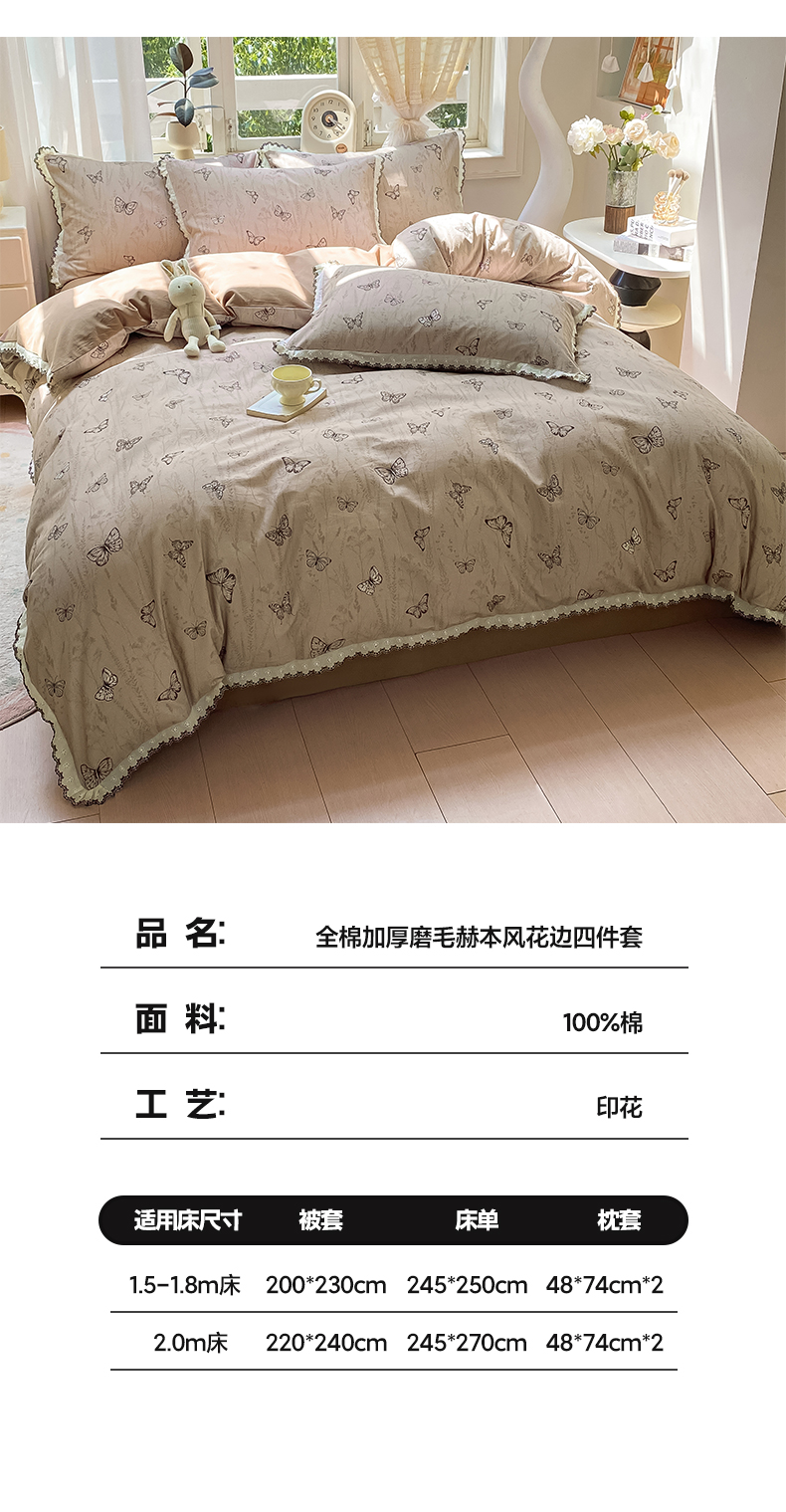 商品名称:慕希家纺 2025新款全棉纯棉加厚赫本风花边磨毛四件套 梦蝶-咖
