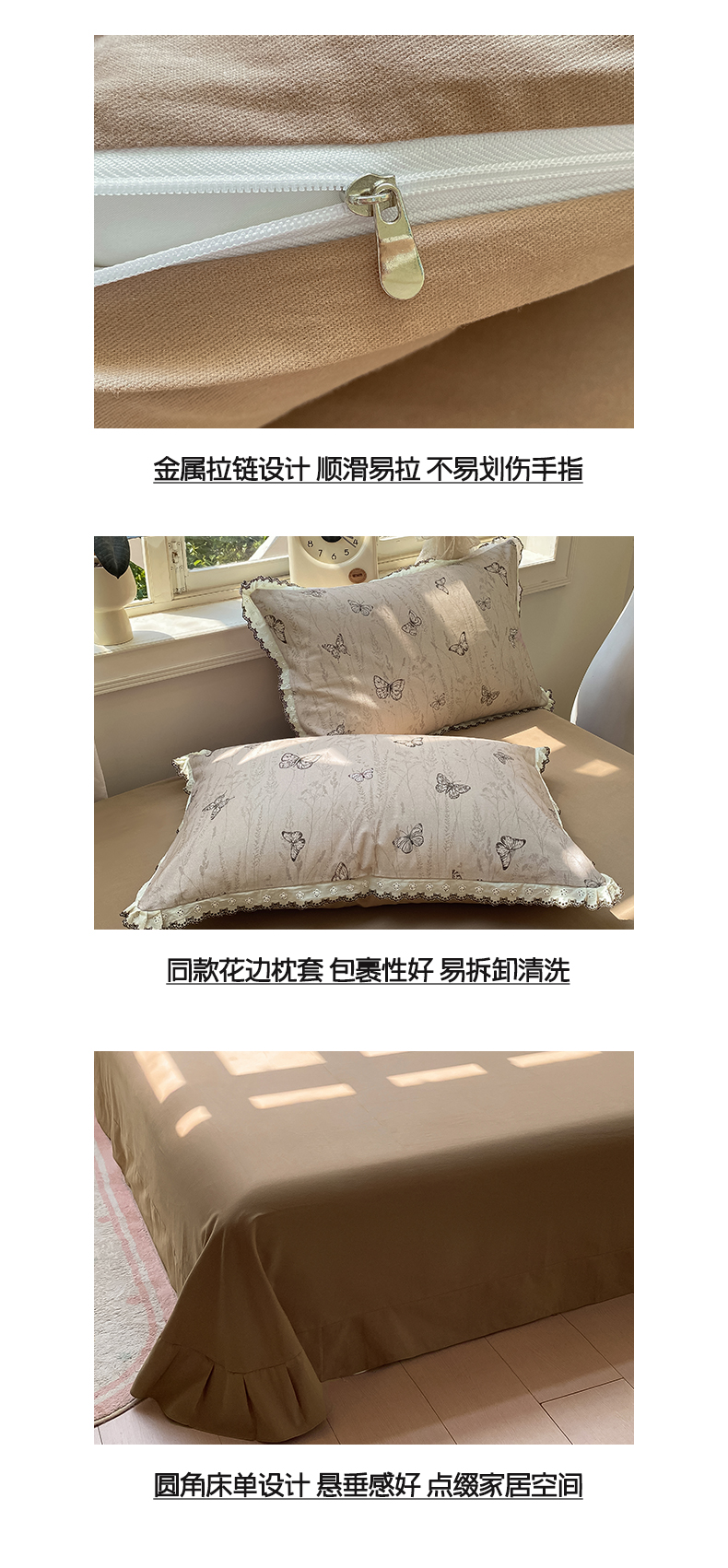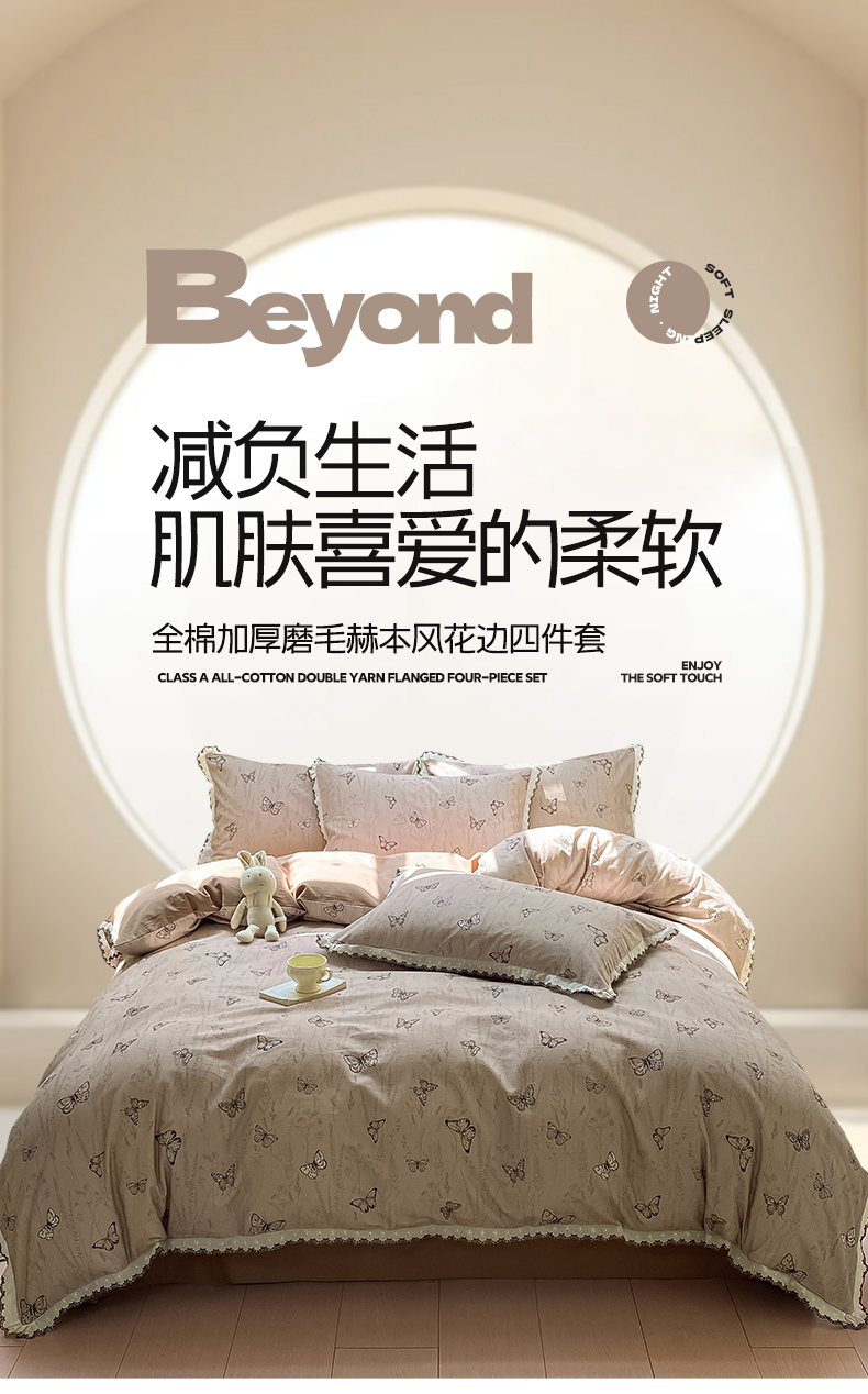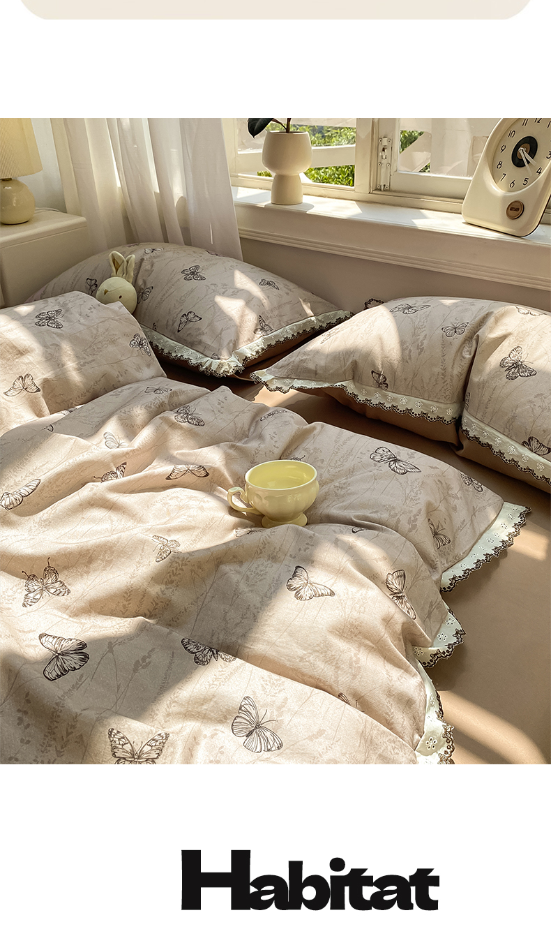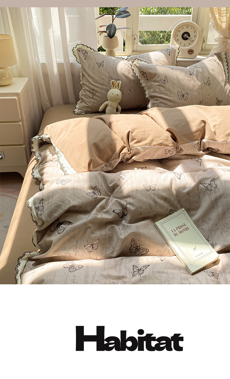 商品名称:慕希家纺 2025新款全棉纯棉加厚赫本风花边磨毛四件套 梦蝶-咖