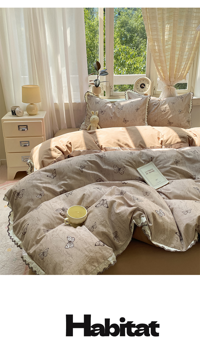 慕希家纺 2025新款全棉纯棉加厚赫本风花边磨毛四件套 梦蝶-咖