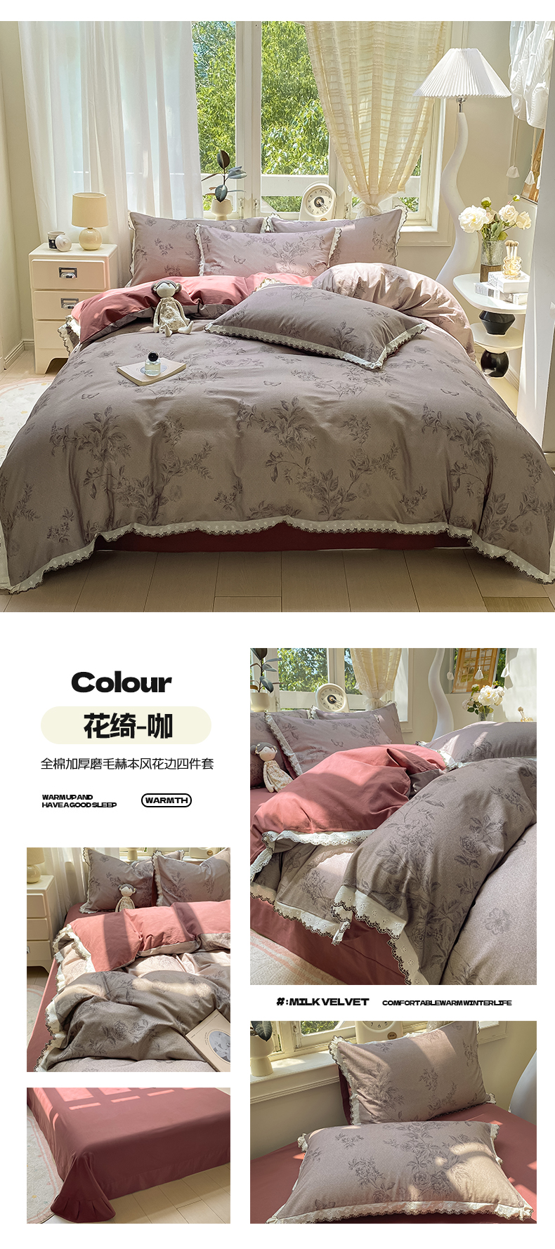 (总)慕希家纺 2025新款高克重牛奶绒花边床盖款四件套-格律时尚,格律时尚-红,格律时尚-灰,格律时尚-咖,格律时尚-蓝,格律时尚-绿