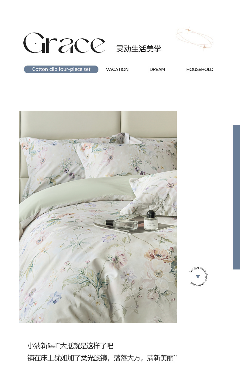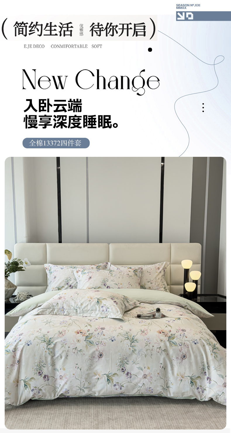 洺兰家居 2025新款高支高密轻奢数码印花四件套长绒棉纯棉四件套 云游-绿