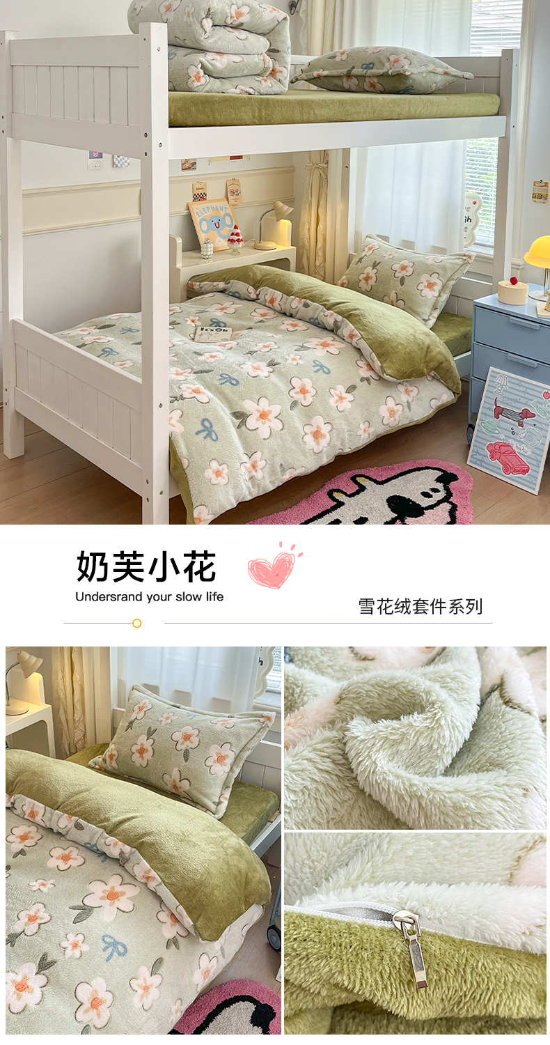 当前位置: 91家纺网 > 商品网购 > 床品套件 > 四件套 > 法莱绒四件套 > 川悦生活 2025新款立体雪花绒印花四件套学生床系列一场景二 奶芙小花